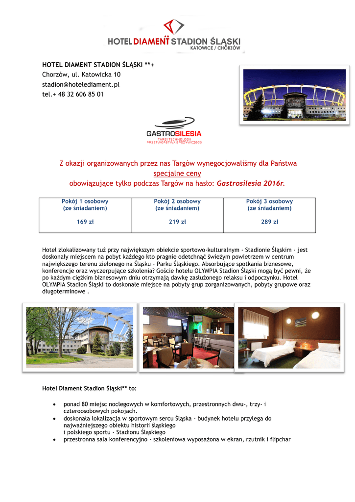 HOTEL DIAMENT STADION ŚLĄSKI **+ Chorzów, ul. Katowicka 10 [email protected] tel.+ 48 32 606 85 01 Z okazji organizowanych przez nas Targów wynegocjowaliśmy dla Państwa specjalne ceny obowiązujące tylko podczas Targów na hasło: Gastrosilesia 2016r. Pokój 1 osobowy (ze śniadaniem) Pokój 2 osobowy (ze śniadaniem) Pokój 3 osobowy (ze śniadaniem) 169 zł 219 zł 289 zł Hotel zlokalizowany tuż przy największym obiekcie sportowo-kulturalnym - Stadionie Śląskim - jest doskonały miejscem na pobyt każdego kto pragnie odetchnąć świeżym powietrzem w centrum największego terenu zielonego na Śląsku - Parku Śląskiego. Absorbujące spotkania biznesowe, konferencje oraz wyczerpujące szkolenia? Goście hotelu OLYMPIA Stadion Śląski mogą być pewni, że po każdym ciężkim biznesowym dniu otrzymają dawkę zasłużonego relaksu i odpoczynku. Hotel OLYMPIA Stadion Śląski to doskonałe miejsce na pobyty grup zorganizowanych, pobyty grupowe oraz długoterminowe . Hotel Diament Stadion Śląski** to: ponad 80 miejsc noclegowych w komfortowych, przestronnych dwu-, trzy- i czteroosobowych pokojach. doskonała lokalizacja w sportowym sercu Śląska - budynek hotelu przylega do najważniejszego obiektu historii śląskiego i polskiego sportu - Stadionu Śląskiego przestronna sala konferencyjno - szkoleniowa wyposażona w ekran, rzutnik i flipchar