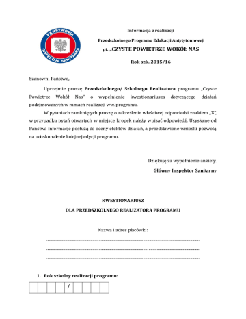 Informacja z realizacji Przedszkolnego Programu Edukacji Antytytoniowej pt. „CZYSTE POWIETRZE WOKÓŁ NAS Rok szk. 2015/16 Szanowni Państwo, Uprzejmie proszę Przedszkolnego/ Szkolnego Realizatora programu „Czyste Powietrze Wokół Nas” o wypełnienie kwestionariusza dotyczącego działań podejmowanych w ramach realizacji ww. programu. W pytaniach zamkniętych proszę o zakreślenie właściwej odpowiedzi znakiem „X”, w przypadku pytań otwartych w miejsce kropek należy wpisać odpowiedź. Uzyskane od Państwa informacje posłużą do oceny efektów działań, a przedstawione wnioski pozwolą na udoskonalenie kolejnej edycji programu. Dziękuję za wypełnienie ankiety. Główny Inspektor Sanitarny KWESTIONARIUSZ DLA PRZEDSZKOLNEGO REALIZATORA PROGRAMU Nazwa i adres placówki: …................................................................................................................................................... …................................................................................................................................................... …................................................................................................................................................... 1. Rok szkolny realizacji programu: / 2. Liczba dzieci uczestniczących w programie: w tym, Liczba dzieci dzieci 5-letnie dzieci 6-letnie Dzieci 7-letnie inna grupa 3. Czy rodzice brali udział w działaniach realizowanych w ramach programu? (odpowiedź proszę zaznaczyć znakiem „X”) Tak(jakich?, proszę wymienić działania) Nie (przejdź do pytania 5) 4. Liczba rodziców biorących udział w programie ogółem: 5. W jaki sposób przebiegała realizacja programu? (odpowiedź proszę zaznaczyć znakiem „X”) Program został zrealizowany w formie zaproponowanych 5 zajęć warsztatowych (przejdź do pytania 7) Program został zmieniony lub nie zrealizowano go w całości 6. Jeżeli zmieniono lub zrezygnowano z części zajęć, to proszę podać 3 najczęściej występujące powody tych zmian. …...................................................................................................................................................…............................. ......................................................................................................................….............................................................. .....................................................................................…............................................................................................... ....................................................…................................................................................................................................ ...................…...................................................................................................................................................….......... .........................................................................................................................................…........................................... ........................................................................................................…............................................................................ 7. Czy program był rozszerzony o dodatkowe działania? (odpowiedź Tak/Nie proszę zaznaczyć znakiem „X”, jeśli będzie to możliwe, proszę podać również odpowiednie liczby działań, uczestników oraz określić odbiorców działań) Tak Nie Jeżeli TAK, to jakie działania? (Proszę podać zsumowaną liczbę działań dla każdej z form) Lp. Formy 1 Przedstawienia/ teatrzyki/ występy 2 Spotkania z ciekawymi gośćmi (np. lekarz, strażak, sportowiec) 3 Miejskie/ Plenerowe wycieczki 4 Prezentacje multimedialne 5 Listy do rodziców/ Listy intencyjne 6 Gazetki/ Ekspozycje wizualne/Ulotki/ Kąciki informacyjne / Plakaty / Inne prace plastyczno informacyjne 7 Quizy/ Zabawy dydaktyczne/ Konkursy muzyczne/ Konkursy plastyczne 8 Spotkania z rodzicami/ Festyny rodzinne 9 Marsze antytytoniowe Liczba działań Liczba uczestników Liczba odbiorców Inne: 10 8. Ocena programu: (skala: 1 – ocena najniższa, 6 – ocena najwyższa, proszę zaznaczyć odpowiednią ocenę znakiem „X”) 1 Zaangażowanie dzieci podczas realizacji programu 2 3 4 5 6 Przyswojenie przez dzieci materiału Odbiór programu przez dzieci Stosunek rodziców do zrealizowanego programu Treści merytoryczne programu oceniane przez realizatorów Wsparcia lokalne (władz lokalnych, kościoła, policji, stowarzyszeń itp.) Materiały dodatkowe (ulotki, plakaty, kolorowanki, wierszyk, krzyżówka, układanki, historyjki, itp.) 9. Czy program będzie kontynuowany w Państwa placówce? (odpowiedź proszę zaznaczyć znakiem „X”) Tak Nie 10. Proszę krótko podsumować realizację programu w placówce i przedstawić wnioski. …...................................................................................................................................................…............................. ......................................................................................................................….............................................................. .....................................................................................…............................................................................................... ....................................................…................................................................................................................................ ...................…...................................................................................................................................................….......... .............................................................................................................