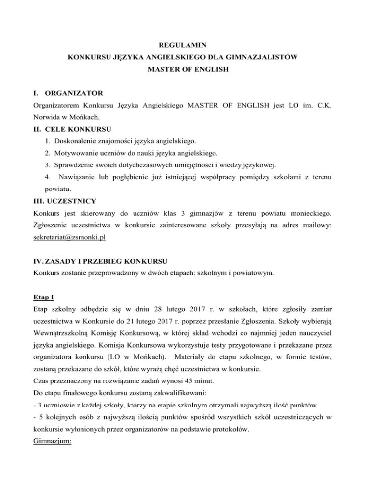 REGULAMIN KONKURSU JĘZYKA ANGIELSKIEGO DLA GIMNAZJALISTÓW MASTER OF ENGLISH I. ORGANIZATOR Organizatorem Konkursu Języka Angielskiego MASTER OF ENGLISH jest LO im. C.K. Norwida w Mońkach. II. CELE KONKURSU 1. Doskonalenie znajomości języka angielskiego. 2. Motywowanie uczniów do nauki języka angielskiego. 3. Sprawdzenie swoich dotychczasowych umiejętności i wiedzy językowej. 4. Nawiązanie lub pogłębienie już istniejącej współpracy pomiędzy szkołami z terenu powiatu. III. UCZESTNICY Konkurs jest skierowany do uczniów klas 3 gimnazjów z terenu powiatu monieckiego. Zgłoszenie uczestnictwa w konkursie zainteresowane szkoły przesyłają na adres mailowy: [email protected] IV. ZASADY I PRZEBIEG KONKURSU Konkurs zostanie przeprowadzony w dwóch etapach: szkolnym i powiatowym. Etap I Etap szkolny odbędzie się w dniu 28 lutego 2017 r. w szkołach, które zgłosiły zamiar uczestnictwa w Konkursie do 21 lutego 2017 r. poprzez przesłanie Zgłoszenia. Szkoły wybierają Wewnątrzszkolną Komisję Konkursową, w której skład wchodzi co najmniej jeden nauczyciel języka angielskiego. Komisja Konkursowa wykorzystuje testy przygotowane i przekazane przez organizatora konkursu (LO w Mońkach). Materiały do etapu szkolnego, w formie testów, zostaną przekazane do szkół, które wyrażą chęć uczestnictwa w konkursie. Czas przeznaczony na rozwiązanie zadań wynosi 45 minut. Do etapu finałowego konkursu zostaną zakwalifikowani: - 3 uczniowie z każdej szkoły, którzy na etapie szkolnym otrzymali najwyższą ilość punktów - 5 kolejnych osób z najwyższą ilością punktów spośród wszystkich szkół uczestniczących w konkursie wyłonionych przez organizatorów na podstawie protokołów. Gimnazjum: 1. Zapoznaje uczniów i nauczycieli z Regulaminem Konkursu Języka Angielskiego MASTER OF ENGLISH dla uczniów gimnazjów Powiatu Monieckiego w roku szkolnym 2016/2017. 2. Zgłasza się do udziału w konkursie nie później niż do 21.02.2017 poprzez zgłoszenie na adres mailowy: [email protected] 3. Zapewnia uczestnikom warunki do samodzielnej, spokojnej pracy. 4. Przeprowadza etap szkolny konkursu i zgłasza uczestnictwo do etapu finałowego przesyłając Załącznik nr1 na adres mailowy [email protected] Etap II Etap finałowy Konkursu Języka Angielskiego MASTER OF ENGLISH odbędzie się 14 marca 2017 roku o godz. 9.00 w LO im. C.K. Norwida w Mońkach. Lista laureatów etapu powiatowego konkursu zostanie ogłoszona droga mailową 17.03.2017 Etap finałowy przygotowuje i przeprowadza LO im. C.K. Norwida w Mońkach. Czas przeznaczony na rozwiązanie zadań wynosi 60 minut. Komisja Konkursowa LO: 1. Przeprowadza konkurs; 2. Zapewnia odpowiednie warunki pracy dla uczestników, przestrzega ustalonych zasad organizacyjnych i regulaminowych w miejscu przeprowadzenia finałowego etapu konkursu; 3. Sporządza w formie pisemnej protokół z prac Komisji Konkursowej. V. HARMONOGRAM 1. Do 21.02.2017 - zgłoszenia do konkursu; 2. 28.02.2017 - etap szkolny; 3. Do 3.03.2017 gimnazja przesyłają Załącznik nr1 na adres [email protected] 4. Do 8.03.2017 - ogłoszenie wyników etapu szkolnego przez Komisję Konkursową LO im. C.K. Norwida w Mońkach – przesłanie listy osób zakwalifikowanych do etapu finałowego do osób kontaktowych; 5. 14.03.2017 godz. 9.00 - etap finałowy w LO w Mońkach przy ulicy Tysiąclecia 15; 6. 17.03.2017 - ogłoszenie listy laureatów konkursu etapu powiatowego (drogą mailową). 7. Podsumowanie konkursu – wręczenie dyplomów i nagród – do końca marca 2017. VI. ZAKRES PROGRAMOWY Testy konkursowe przygotowane będą przez nauczycieli języka angielskiego LO im. C.K. Norwida w Mońkach. Zadania konkursowe zarówno w pierwszym jak i drugim etapie obejmować będą materiał zawarty w podstawie programowej z języka angielskiego dla gimnazjum. Zadania sprawdzać będą wiedzę i umiejętności z zakresu: 1. Gramatyki 2. Słownictwa 3. Rozumienia tekstu czytanego 4. Reagowania językowego 5. Elementów wiedzy o krajach anglojęzycznych. Etap I Uczestnicy rozwiązują test składający się z 2 części: 1. Struktury leksykalno-gramatyczne. 2. Czytanie. Etap II Uczestnicy tego etapu rozwiązują test pisemny składający się z trzech elementów: 1. Struktury leksykalno-gramatyczne; 2. Quiz dotyczący elementów wiedzy o krajach anglojęzycznych; 3. Czytanie. VII. NAGRODY Laureaci konkursu otrzymają nagrody rzeczowe oraz dyplomy. Każdy uczestnik etapu finałowego otrzyma dyplom uczestnictwa w konkursie. Rozdanie dyplomów i nagród odbędzie się w LO im. C.K. Norwida do końca marca 2017. O dokładnym terminie szkoły zostaną powiadomione drogą mailową. VIII. KOMISJA KONKURSOWA Nad prawidłowością przebiegu etapu finałowego konkursu czuwać będzie jury w składzie nauczycieli ze szkół biorących udział w konkursie oraz nauczycieli LO w Mońkach wyznaczonych przez organizatora konkursu. IX. POSTANOWIENIA KOŃCOWE Informacje na temat konkursu będą zamieszczone na stronie internetowej szkoły liceum.zsmonki.pl Organizatorzy Konkursu w LO: Nauczyciele języka angielskiego: Katarzyna Mońko, Małgorzata Sawoń-Masłowska, Renata Szorc, Barbara Zabłudowska. Kontakt do szkoły: Tel. 857162738 Załącznik nr 1-Karta zgłoszenia KARTA ZGŁOSZENIA UDZIAŁU W KONKURSIE JĘZYKA ANGIELSKIEGO ‘MASTER OF ENGLISH’ NAZWA I ADRES SZKOŁY : ………………………………………………………………………………………………… ………………………………………………………………………………………………….. E-MAIL SZKOŁY: ………………………………………………………………………......... TELEFON SZKOŁY: ………………………………………………………………………….. NAUCZYCIEL PROWADZĄCY: ……………………………………………………………. TEL. KONTAKTOWY: ……………………………………………………………