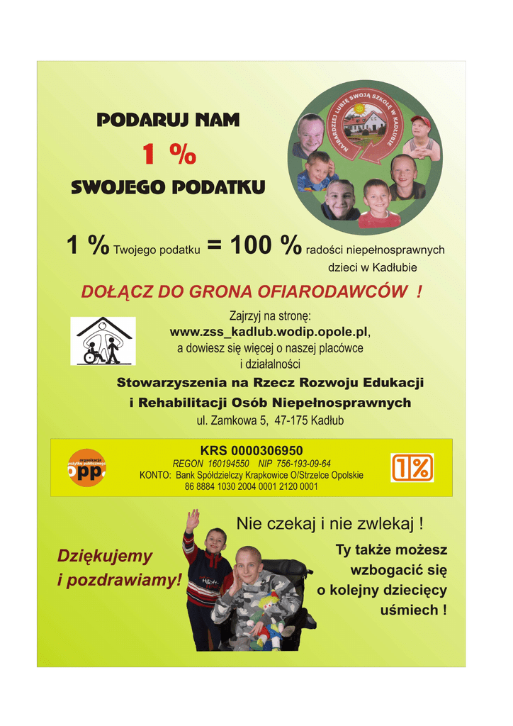 Stowarzyszenie na Rzecz Rozwoju Edukacji i Rehabilitacji Osób Niepełnosprawnych – KRS 0000306950 - to organizacja pożytku publicznego działająca w Kadłubie od 2008 r. Organizacja powstała dzięki inicjatywie pracowników DPS i ZSS przy DPS w Kadłubie. Swoją działalność kieruje przede wszystkim do dzieci , młodzieży i dorosłych mieszkańców Domu Pomocy Społecznej w Kadłubie. Wiele pomysłów terapeutów pracujących w Kadłubie z osobami niepełnosprawnymi nigdy nie zostało zrealizowanych z przyczyn finansowych. Dzisiaj mamy Stowarzyszenie, które pozyskuje pieniądze na wszelką aktywność DPS i ZSS wybiegającą poza ramy statutowe tych placówek. Stowarzyszenie pozyskuje środki finansowe na realizację każdego pomysłu rozszerzającego ofertę opiekuńczą, rehabilitacyjną, edukacyjną a szczególnie społeczną DPS w Kadłubie i ZSS przy DPS w Kadłubie. Większość tych środków pochodzi z odpisu 1% podatku dochodowego od osób fizycznych. Realizowane przez Stowarzyszenie projekty wspierane są finansowo przez Starostwo Powiatowe w Strzelcach Opolskich w ramach patronatu Starosty, Urząd Miasta i Gminy w Strzelcach Opolskich w ramach patronatu Burmistrza, Samorząd Województwa Opolskiego oraz wiele firm działających na terenie powiatu strzeleckiego. Szczególnie naszą działalność wspiera dyrektor Domu Pomocy Społecznej w Kadłubie i dyrektor Zespołu Szkól Specjalnych przy DPS w Kadłubie. Państwa bezinteresowna pomoc jest w rzeczywistości pomocą dla osób niepełnosprawnych, w szczególności z umiarkowaną, znaczną i głęboką niepełnosprawnością intelektualną. Zachęcamy, aby w tym roku również włączyć się do akcji 1% na rzecz naszej organizacji. Jesteśmy wdzięczni wszystkim tym podatnikom, którzy już nam zaufali i dokonali odpisu na rzecz naszej organizacji. Dzięki tym środkom finansowym rozszerzyliśmy naszą działalność na cały powiat strzelecki i województwo opolskie realizując min. takie projekty jak: - Festiwal Aktywności Niepełnosprawnych „Śpiewać każdy może” - Powiatowy Turniej Gier Zimowych „Fajna zima” - Dni Aktywności Sportowo – Rekreacyjnej Osób Niepełnosprawnych – Edycja I – Bowling Nasi beneficjenci od trzech lat doskonalą swoją rehabilitację społeczną poza placówką, wyjeżdżając do kina, do teatru, do ZOO, do wielu ciekawych miejsc w Polsce, na krótkie obozy wakacyjne. na tzw: „Zieloną szkołę”, biorą udział w ciekawych zawodach, konkursach, promując tym samym naszą Gminę i Powiat poza granicami regionalnymi. Realizując nasze powołanie przy wsparciu darczyńców na co dzień doświadczamy szczerych, radosnych uśmiechów dziecięcych buzi. Pamiętajmy - 1% podatku może zmienić bardzo wiele. nr rachunku bankowego: : O/STRZELCE OPOLSKIE 86 8884 1030 2004 0001 2120 0001 BANK SPÓŁDZIELCZY KRAPKOWICE Kornelia Mroszczyk- Prezes Zarządu Stowarzyszenia