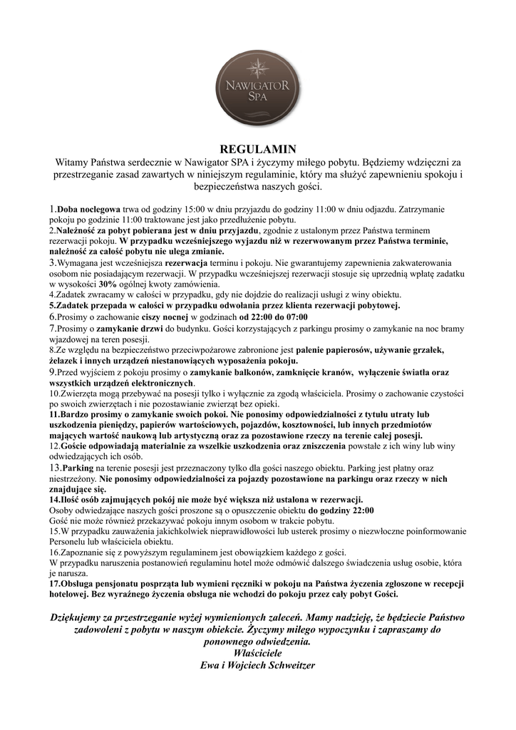 REGULAMIN Witamy Państwa serdecznie w Nawigator SPA i życzymy miłego pobytu. Będziemy wdzięczni za przestrzeganie zasad zawartych w niniejszym regulaminie, który ma służyć zapewnieniu spokoju i bezpieczeństwa naszych gości. 1.Doba noclegowa trwa od godziny 15:00 w dniu przyjazdu do godziny 11:00 w dniu odjazdu. Zatrzymanie pokoju po godzinie 11:00 traktowane jest jako przedłużenie pobytu. 2.Należność za pobyt pobierana jest w dniu przyjazdu, zgodnie z ustalonym przez Państwa terminem rezerwacji pokoju. W przypadku wcześniejszego wyjazdu niż w rezerwowanym przez Państwa terminie, należność za całość pobytu nie ulega zmianie. 3.Wymagana jest wcześniejsza rezerwacja terminu i pokoju. Nie gwarantujemy zapewnienia zakwaterowania osobom nie posiadającym rezerwacji. W przypadku wcześniejszej rezerwacji stosuje się uprzednią wpłatę zadatku w wysokości 30% ogólnej kwoty zamówienia. 4.Zadatek zwracamy w całości w przypadku, gdy nie dojdzie do realizacji usługi z winy obiektu. 5.Zadatek przepada w całości w przypadku odwołania przez klienta rezerwacji pobytowej. 6.Prosimy o zachowanie ciszy nocnej w godzinach od 22:00 do 07:00 7.Prosimy o zamykanie drzwi do budynku. Gości korzystających z parkingu prosimy o zamykanie na noc bramy wjazdowej na teren posesji. 8.Ze względu na bezpieczeństwo przeciwpożarowe zabronione jest palenie papierosów, używanie grzałek, żelazek i innych urządzeń niestanowiących wyposażenia pokoju. 9.Przed wyjściem z pokoju prosimy o zamykanie balkonów, zamknięcie kranów, wyłączenie światła oraz wszystkich urządzeń elektronicznych. 10.Zwierzęta mogą przebywać na posesji tylko i wyłącznie za zgodą właściciela. Prosimy o zachowanie czystości po swoich zwierzętach i nie pozostawianie zwierząt bez opieki. 11.Bardzo prosimy o zamykanie swoich pokoi. Nie ponosimy odpowiedzialności z tytułu utraty lub uszkodzenia pieniędzy, papierów wartościowych, pojazdów, kosztowności, lub innych przedmiotów mających wartość naukową lub artystyczną oraz za pozostawione rzeczy na terenie całej posesji. 12.Goście odpowiadają materialnie za wszelkie uszkodzenia oraz zniszczenia powstałe z ich winy lub winy odwiedzających ich osób. 13.Parking na terenie posesji jest przeznaczony tylko dla gości naszego obiektu. Parking jest płatny oraz niestrzeżony. Nie ponosimy odpowiedzialności za pojazdy pozostawione na parkingu oraz rzeczy w nich znajdujące się. 14.Ilość osób zajmujących pokój nie może być większa niż ustalona w rezerwacji. Osoby odwiedzające naszych gości proszone są o opuszczenie obiektu do godziny 22:00 Gość nie może również przekazywać pokoju innym osobom w trakcie pobytu. 15.W przypadku zauważenia jakichkolwiek nieprawidłowości lub usterek prosimy o niezwłoczne poinformowanie Personelu lub właściciela obiektu. 16.Zapoznanie się z powyższym regulaminem jest obowiązkiem każdego z gości. W przypadku naruszenia postanowień regulaminu hotel może odmówić dalszego świadczenia usług osobie, która je narusza. 17.Obsługa pensjonatu posprząta lub wymieni ręczniki w pokoju na Państwa życzenia zgłoszone w recepcji hotelowej. Bez wyraźnego życzenia obsługa nie wchodzi do pokoju przez cały pobyt Gości. Dziękujemy za przestrzeganie wyżej wymienionych zaleceń. Mamy nadzieję, że będziecie Państwo zadowoleni z pobytu w naszym obiekcie. Życzymy miłego wypoczynku i zapraszamy do ponownego odwiedzenia. Właściciele Ewa i Wojciech Schweitzer