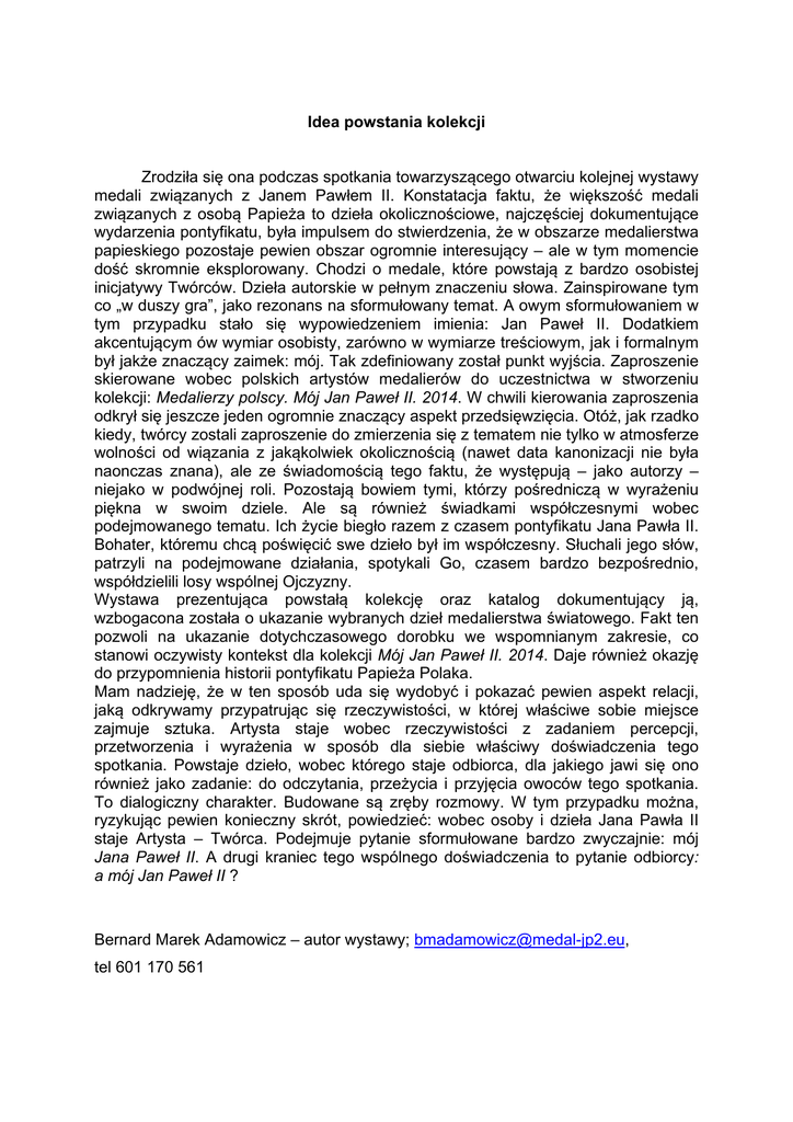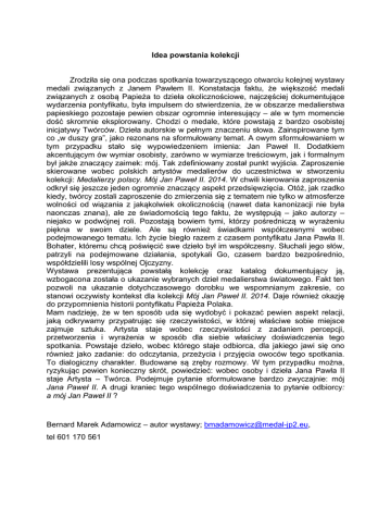 Idea powstania kolekcji Zrodziła się ona podczas spotkania towarzyszącego otwarciu kolejnej wystawy medali związanych z Janem Pawłem II. Konstatacja faktu, że większość medali związanych z osobą Papieża to dzieła okolicznościowe, najczęściej dokumentujące wydarzenia pontyfikatu, była impulsem do stwierdzenia, że w obszarze medalierstwa papieskiego pozostaje pewien obszar ogromnie interesujący – ale w tym momencie dość skromnie eksplorowany. Chodzi o medale, które powstają z bardzo osobistej inicjatywy Twórców. Dzieła autorskie w pełnym znaczeniu słowa. Zainspirowane tym co „w duszy gra”, jako rezonans na sformułowany temat. A owym sformułowaniem w tym przypadku stało się wypowiedzeniem imienia: Jan Paweł II. Dodatkiem akcentującym ów wymiar osobisty, zarówno w wymiarze treściowym, jak i formalnym był jakże znaczący zaimek: mój. Tak zdefiniowany został punkt wyjścia. Zaproszenie skierowane wobec polskich artystów medalierów do uczestnictwa w stworzeniu kolekcji: Medalierzy polscy. Mój Jan Paweł II. 2014. W chwili kierowania zaproszenia odkrył się jeszcze jeden ogromnie znaczący aspekt przedsięwzięcia. Otóż, jak rzadko kiedy, twórcy zostali zaproszenie do zmierzenia się z tematem nie tylko w atmosferze wolności od wiązania z jakąkolwiek okolicznością (nawet data kanonizacji nie była naonczas znana), ale ze świadomością tego faktu, że występują – jako autorzy – niejako w podwójnej roli. Pozostają bowiem tymi, którzy pośredniczą w wyrażeniu piękna w swoim dziele. Ale są również świadkami współczesnymi wobec podejmowanego tematu. Ich życie biegło razem z czasem pontyfikatu Jana Pawła II. Bohater, któremu chcą poświęcić swe dzieło był im współczesny. Słuchali jego słów, patrzyli na podejmowane działania, spotykali Go, czasem bardzo bezpośrednio, współdzielili losy wspólnej Ojczyzny. Wystawa prezentująca powstałą kolekcję oraz katalog dokumentujący ją, wzbogacona została o ukazanie wybranych dzieł medalierstwa światowego. Fakt ten pozwoli na ukazanie dotychczasowego dorobku we wspomnianym zakresie, co stanowi oczywisty kontekst dla kolekcji Mój Jan Paweł II. 2014. Daje również okazję do przypomnienia historii pontyfikatu Papieża Polaka. Mam nadzieję, że w ten sposób uda się wydobyć i pokazać pewien aspekt relacji, jaką odkrywamy przypatrując się rzeczywistości, w której właściwe sobie miejsce zajmuje sztuka. Artysta staje wobec rzeczywistości z zadaniem percepcji, przetworzenia i wyrażenia w sposób dla siebie właściwy doświadczenia tego spotkania. Powstaje dzieło, wobec którego staje odbiorca, dla jakiego jawi się ono również jako zadanie: do odczytania, przeżycia i przyjęcia owoców tego spotkania. To dialogiczny charakter. Budowane są zręby rozmowy. W tym przypadku można, ryzykując pewien konieczny skrót, powiedzieć: wobec osoby i dzieła Jana Pawła II staje Artysta – Twórca. Podejmuje pytanie sformułowane bardzo zwyczajnie: mój Jana Paweł II. A drugi kraniec tego wspólnego doświadczenia to pytanie odbiorcy: a mój Jan Paweł II ? Bernard Marek Adamowicz – autor wystawy; [email protected], tel 601 170 561