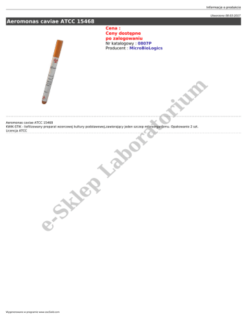 Informacje o produkcie Utworzono 08-03-2017 Aeromonas caviae ATCC 15468 Cena : Ceny dostępne po zalogowaniu at or iu m Nr katalogowy : 0807P Producent : MicroBioLogics eSk le p La bo r Aeromonas caviae ATCC 15468 KWIK-STIK - liofilizowany preparat wzorcowej kultury podstawowej,zawierający jeden szczep mikroorganizmu. Opakowanie 2 szt. Licencja ATCC Wygenerowano w programie www.oscGold.com