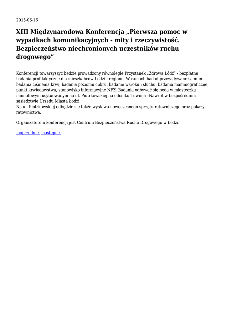 2015-06-16 XIII Międzynarodowa Konferencja „Pierwsza pomoc w wypadkach komunikacyjnych - mity i rzeczywistość. Bezpieczeństwo niechronionych uczestników ruchu drogowego” Konferencji towarzyszyć będzie prowadzony równolegle Przystanek „Zdrowa Łódź” - bezpłatne badania profilaktyczne dla mieszkańców Łodzi i regionu. W ramach badań przewidywane są m.in. badania ciśnienia krwi, badania poziomu cukru, badanie wzroku i słuchu, badania mammograficzne, punkt krwiodawstwa, stanowisko informacyjne NFZ. Badania odbywać się będą w miasteczku namiotowym usytuowanym na ul. Piotrkowskiej na odcinku Tuwima –Nawrot w bezpośrednim sąsiedztwie Urzędu Miasta Łodzi. Na ul. Piotrkowskiej odbędzie się także wystawa nowoczesnego sprzętu ratowniczego oraz pokazy ratownictwa. Organizatorem konferencji jest Centrum Bezpieczeństwa Ruchu Drogowego w Łodzi. poprzednie następne