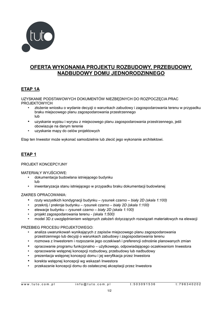 OFERTA WYKONANIA PROJEKTU ROZBUDOWY, PRZEBUDOWY, NADBUDOWY DOMU JEDNORODZINNEGO ETAP 1A UZYSKANIE PODSTAWOWYCH DOKUMENTÓW NIEZBĘDNYCH DO ROZPOCZĘCIA PRAC PROJEKTOWYCH • złożenie wniosku o wydanie decyzji o warunkach zabudowy i zagospodarowania terenu w przypadku braku miejscowego planu zagospodarowania przestrzennego lub • uzyskanie wypisu i wyrysu z miejscowego planu zagospodarowania przestrzennego, jeśli obowiazuje na danym terenie • uzyskanie mapy do celów projektowych Etap ten Inwestor może wykonać samodzielnie lub zlecić jego wykonanie architektowi. ETAP 1 PROJEKT KONCEPCYJNY MATERIAŁY WYJŚCIOWE: • dokumentacja budowlana istniejącego budynku lub • inwentaryzacja stanu istniejącego w przypadku braku dokumentacji budowlanej ZAKRES OPRACOWANIA: • rzuty wszystkich kondygnacji budynku – rysunek czarno – biały 2D (skala 1:100) • przekrój / prekroje budynku – rysunek czarno – biały 2D (skala 1:100) • elewacje budynku – rysunek czarno – biały 2D (skala 1:100) • projekt zagospodarowania terenu - (skala 1:500) • model 3D z uwzględnieniem wstępnych założeń dotyczących rozwiązań materiałowych na elewacji PRZEBIEG PROCESU PROJEKTOWEGO: • analiza uwarunkowań wynikających z zapisów miejscowego planu zagospodarowania przestrzennego lub decyzji o warunkach zabudowy i zagospodarowania terenu • rozmowa z Inwestorem i rozpozanie jego oczekiwań i preferencji odnośnie planowanych zmian • opracowanie programu funkcjonalno – użytkowego, odpowiadającego oczekiwaniom Inwestora • opracowanie wstępnej koncepcji rozbudowy, przebudowy lub nadbudowy • prezentacja wstępnej koncepcji domu i jej weryfikacja przez Inwestora • korekta wstępnej koncepcji wg wskazań Inwestora • przekazanie koncepcji domu do ostatecznej akceptacji przez Inwestora www.tuto.com.pl [email protected] 1/2 t:503091536 t:796340202 ETAP 2A ZGROMADZENIE DOKUMENTÓW FORMALNO – PRAWNYCH, NIEZBĘDNYCH DO UZYSKANIA POZWOLENIA NA BUDOWĘ Już w trakcie opracowywania części rysunkowej projektu można starać się o uzyskanie dokumentów formalno – prawnych. W trakcie współpracy, po przeanalizowaniu zapisów prawa miejscowego, zostanie określona dokładna lista niezbędnych dokumentów formalno – prawnych. Etap ten Inwestor może wykonać samodzielnie lub zlecić jego wykonanie architektowi. ETAP 2 PROJEKT ARCHITEKTONICZNO – BUDOWLANY NIEZBĘDNY DO UZYSKANIA POZWOLENIA NA BUDOWĘ ZAKRES OPRACOWANIA: • rzuty wszystkich kondygnacji budynku – rysunek czarno – biały 2D (skala 1:100 lub 1:50) • rzut dachu – rysunek czarno – biały 2D (skala 1:100 lub 1:50) • przekrój / przekroje budynku w ilości umożliwiającej jednoznaczną interpretację projektu – rysunek czarno – biały 2D (skala 1:100 lub 1:50) • elewacje budynku – rysunek czarno – biały 2D (skala 1:100 lub 1:50) • opis techniczny do projektu architektoniczno - budowlanego • projekt zagospodarowania terenu - (skala 1:500) • opis techniczny do projektu zagospodarowania terenu PRZEBIEG PROCESU PROJEKTOWEGO: • rozmowa z Inwestorem, dotycząca rozwiązań materiałowych zasadniczych elementów budynku (ściana zewnętrzna, ściany działowe) oraz dodatkowego wyposażenia instalacyjnego budynku (np. wentylacja mechaniczna, rekuperacja, klimatyzacja itp.) • opracowanie projektu w zakresie niezbędnym do przekazania konstruktorowi, a - w zależności od wymagań konkretnego urzędu - także projektantom instalacji wewnetrznych (instalacja elektryczna, instalacja sanitarna) • koordynacja międzybranżowa • skompletowanie projektów branżowych oraz dokumentów formalno - prawnych • przekazanie Inwestorowi 4 egzemplarzy projektu architektoniczno – budowlanego (wraz z zagospodarowaniem terenu), niezbędnych do uzyskania pozwolenia na budowę UWAGI: • Na życzenie Inwestora może zostać wykonana wizualizacja fotorealistyczna, która podlega • • • • • • • dodatkowej wycenie. Wszystkie opłaty urzędowe ponosi Inwestor. Ewentualne zmiany do projektu, wprowadzone na życzenie Inwestora po zatwierdzeniu projektu koncepcyjnego, podlegają dodatkowej wycenie. Dodatkową usługę stanowi zgromadzenie podstawowych dokumnetów niezbędnych do rozpoczęcia prac projektowych Dodatkową usługę stanowi zgromadzenie dokumentów formalno – prawnych niezbędnych do uzyskania pozwolenia na budowę. Dodatkową usługę stanowi opracowanie projektu wykonawczego. Dodatkową usługę stanowi nadzór autorski w trakcie realizacji projektu. Dodatkową usługę stanowi kontrola wykonania robót budowlanych. www.tuto.com.pl [email protected] 2/2 t:503091536 t:796340202