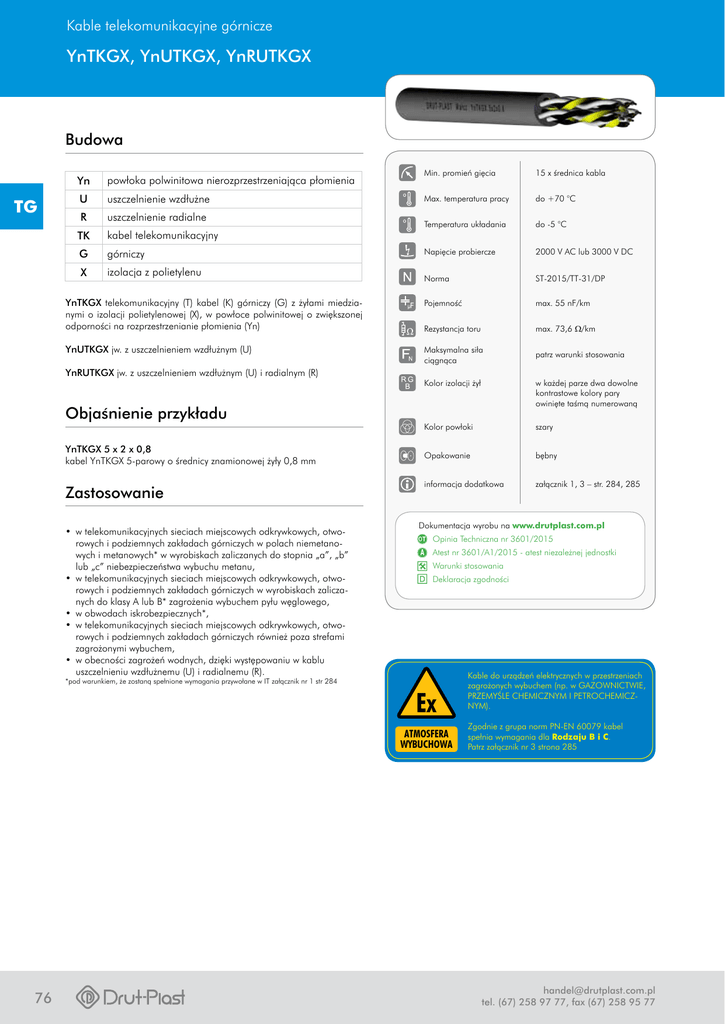 Kable telekomunikacyjne górnicze YnTKGX, YnUTKGX, YnRUTKGX Budowa TG Min. promień gięcia 15 x średnica kabla Max. temperatura pracy do +70 °C Temperatura układania do -5 °C Napięcie probiercze 2000 V AC lub 3000 V DC Norma ST-2015/TT-31/DP YnTKGX telekomunikacyjny (T) kabel (K) górniczy (G) z żyłami miedzianymi o izolacji polietylenowej (X), w powłoce polwinitowej o zwiększonej odporności na rozprzestrzenianie płomienia (Yn) Pojemność max. 55 nF/km Rezystancja toru max. 73,6 W/km YnUTKGX jw. z uszczelnieniem wzdłużnym (U) Maksymalna siła ciągnąca patrz warunki stosowania Yn powłoka polwinitowa nierozprzestrzeniająca płomienia U uszczelnienie wzdłużne R uszczelnienie radialne TK kabel telekomunikacyjny G górniczy X izolacja z polietylenu YnRUTKGX jw. z uszczelnieniem wzdłużnym (U) i radialnym (R) Objaśnienie przykładu YnTKGX 5 x 2 x 0,8 kabel YnTKGX 5-parowy o średnicy znamionowej żyły 0,8 mm Zastosowanie • w telekomunikacyjnych sieciach miejscowych odkrywkowych, otworowych i podziemnych zakładach górniczych w polach niemetanowych i metanowych* w wyrobiskach zaliczanych do stopnia „a”, „b” lub „c” niebezpieczeństwa wybuchu metanu, • w telekomunikacyjnych sieciach miejscowych odkrywkowych, otworowych i podziemnych zakładach górniczych w wyrobiskach zaliczanych do klasy A lub B* zagrożenia wybuchem pyłu węglowego, • w obwodach iskrobezpiecznych*, • w telekomunikacyjnych sieciach miejscowych odkrywkowych, otworowych i podziemnych zakładach górniczych również poza strefami zagrożonymi wybuchem, • w obecności zagrożeń wodnych, dzięki występowaniu w kablu uszczelnieniu wzdłużnemu (U) i radialnemu (R). Kolor izolacji żył w każdej parze dwa dowolne kontrastowe kolory pary owinięte taśmą numerowaną Kolor powłoki szary Opakowanie bębny informacja dodatkowa załącznik 1, 3 – str. 284, 285 Dokumentacja wyrobu na www.drutplast.com.pl Opinia Techniczna nr 3601/2015 Atest nr 3601/A1/2015 - atest niezależnej jednostki Warunki stosowania Deklaracja zgodności *pod warunkiem, że zostaną spełnione wymagania przywołane w IT załącznik nr 1 str 284 Ex ATMOSFERA WYBUCHOWA 76 Kable do urządzeń elektrycznych w przestrzeniach zagrożonych wybuchem (np. w GAZOWNICTWIE, PRZEMYŚLE CHEMICZNYM I PETROCHEMICZNYM). Zgodnie z grupa norm PN-EN 60079 kabel spełnia wymagania dla Rodzaju B i C. Patrz załącznik nr 3 strona 285 [email protected] tel. (67) 258 97 77, fax (67) 258 95 77 Kable telekomunikacyjne górnicze YnTKGX, YnUTKGX, YnRUTKGX Ilość par i średnica żył n x p x mm Średnica zewn. obl.1) mm Masa kabla (netto) kg/km Średnica zewn. obl.1) mm Średnica zewn. obl.1) mm YnUTKGX YnTKGX 2 x 2 x 0,8 Masa kabla (netto) kg/km Masa kabla (netto) kg/km YnRUTKGX 9,3 99 10,5 102 11,2 121 3 x 2 x 0,8 9,7 114 10,9 118 11,6 138 4 x 2 x 0,8 10,8 142 12,0 146 12,7 168 5 x 2 x 0,8 11,5 161 12,7 166 13,4 189 6 x 2 x 0,8 12,2 180 13,4 185 14,1 210 7 x 2 x 0,8 12,2 192 13,4 197 14,1 222 8 x 2 x 0,8 13,4 215 14,6 220 15,3 248 9 x 2 x 0,8 14,3 236 15,5 241 16,2 271 10 x 2 x 0,8 15,2 267 16,4 273 17,1 304 11 x 2 x 0,8 15,2 278 16,4 285 17,1 316 12 x 2 x 0,8 15,6 294 16,8 301 17,5 333 13 x 2 x 0,8 16,2 313 17,4 319 18,1 353 14 x 2 x 0,8 16,2 324 17,4 331 18,1 365 15 x 2 x 0,8 17,0 344 18,2 352 18,9 387 16 x 2 x 0,8 17,0 356 18,2 363 18,9 398 17 x 2 x 0,8 17,7 376 18,9 383 19,6 420 18 x 2 x 0,8 17,7 387 18,9 395 19,6 432 19 x 2 x 0,8 17,7 399 18,9 406 19,6 443 20 x 2 x 0,8 18,5 419 19,7 427 20,4 466 21 x 2 x 0,8 18,5 431 19,7 438 20,4 477 22 x 2 x 0,8 19,8 471 21,0 480 21,7 521 23 x 2 x 0,8 19,8 483 21,0 491 21,7 532 24 x 2 x 0,8 20,7 504 21,9 513 22,6 556 25 x 2 x 0,8 20,7 516 21,9 525 22,6 568 26 x 2 x 0,8 20,7 527 21,9 536 22,6 579 27 x 2 x 0,8 21,1 544 22,3 552 23,0 596 28 x 2 x 0,8 21,7 563 22,9 572 23,6 618 29 x 2 x 0,8 21,7 575 22,9 583 23,6 629 30 x 2 x 0,8 21,7 586 22,9 595 23,6 641 31 x 2 x 0,8 22,5 607 23,7 617 24,4 664 32 x 2 x 0,8 22,5 618 23,7 628 24,4 675 33 x 2 x 0,8 22,5 630 23,7 640 24,4 687 34 x 2 x 0,8 23,6 672 24,8 683 25,5 732 35 x 2 x 0,8 23,6 684 24,8 694 25,5 743 36 x 2 x 0,8 23,6 695 24,8 706 25,5 755 37 x 2 x 0,8 23,6 707 24,8 717 25,5 766 56 x 2 x 0,8 28,4 1009 29,6 1021 30,3 1081 60 x 2 x 0,8 29,1 1066 30,3 1079 31,0 1140 100 x 2 x 0,8 37,6 1702 38,8 1718 39,5 1798 120 x 2 x 0,8 39,4 1962 40,6 1978 41,3 2062 200 x 2 x 0,8 49,4 3157 50,6 3179 51,3 3284 TG UWAGA: na życzenie istnieje możliwość wykonania kabli/przewodu o innej liczbie i przekroju żył niż podano w tabeli. 1) Średnica zewnętrzna obliczeniowa może różnić się od rzeczywistej średnicy kabla/przewodu. Dokładną średnicę uzyskasz kontaktując się z Działem Handlowym. [email protected] tel. (67) 258 97 77, fax (67) 258 95 77 77