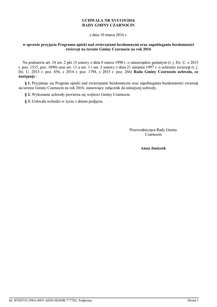 UCHWAŁA NR XVI/119/2016 RADY GMINY CZARNOCIN z dnia 10 marca 2016 r. w sprawie przyjęcia Programu opieki nad zwierzętami bezdomnymi oraz zapobiegania bezdomności zwierząt na terenie Gminy Czarnocin na rok 2016 Na podstawie art. 18 ust. 2 pkt 15 ustawy z dnia 8 marca 1990 r. o samorządzie gminnym (t. j. Dz. U. z 2015 r. poz. 1515, poz. 1890) oraz art. 11 a ust. 1 i ust. 2 ustawy z dnia 21 sierpnia 1997 r. o ochronie zwierząt (t. j. Dz. U. 2013 r. poz. 856, z 2014 r. poz. 1794, z 2015 r. poz. 266) Rada Gminy Czarnocin uchwala, co następuje : § 1. Przyjmuje się Program opieki nad zwierzętami bezdomnymi oraz zapobiegania bezdomności zwierząt na terenie Gminy Czarnocin na rok 2016, stanowiący załącznik do niniejszej uchwały. § 2. Wykonanie uchwały powierza się wójtowi Gminy Czarnocin. § 3. Uchwała wchodzi w życie z dniem podjęcia. Przewodnicząca Rady Gminy Czarnocin Anna Janiczek Id: 3F92D753-298A-46FF-AED3-0D5D8C7777D2. Podpisany Strona 1 Załącznik do Uchwały Nr XVI/119/2016 RADY GMINY CZARNOCIN z dnia 10 marca 2016 r. PROGRAM OPIEKI NAD ZWIERZĘTAMI BEZDOMNYMI ORAZ ZAPOBIEGANIA BEZDOMNOŚCI ZWIERZĄT NA TERENIE GMINY CZARNOCIN W 2016 ROKU Rozdział 1. POSTANOWIENIA OGÓLNE § 1. Ilekroć w programie jest mowa o: 1) schronisku dla zwierząt –rozumie się przez to miejsce przeznaczone do opieki nad zwierzętami domowymi spełniające warunki określone w ustawie z dnia 11marca 2004r. o ochronie zwierząt oraz zwalczaniu chorób zakaźnych zwierząt (Dz. U. z 2008 r. Nr 213, poz.1342 z późn.zm.); 2) gabinecie weterynaryjnym, należy przez to rozumieć zakład leczniczy dla zwierząt, z którym Wójt Gminy Czarnocin zawarł umowę na świadczenie usług; 3) programie, należy przez to rozumieć Program opieki nad zwierzętami bezdomnymi oraz zapobiegania bezdomności zwierząt na terenie gminy Czarnocin w 2016r. § 2. 1. Koordynatorem Programu jest Wójt Gminy Czarnocin. Wójt Gminy upoważnia wskazaną przez siebie osobę do kontaktu z mediami w zakresie zdarzeń z udziałem zwierząt. 2. Realizatorami Programu są: 1) na poziomie Gminy Czarnocin – Wójt Gminy Czarnocin; 2) organizacje pozarządowe, których celem statutowym jest ochrona zwierząt, współpracujące z Gminą Czarnocin. Rozdział 2. CEL PROGRAMU § 3. Celem programu jest zapobieganie bezdomności zwierząt na terenie Gminy Czarnocin oraz opieka nad zwierzętami bezdomnymi. Rozdział 3. REALIZACJA ZADAŃ § 4. Zapewnienie opieki bezdomnym zwierzętom z terenu Gminy Czarnocin realizują: 1) Schronisko - Hotel dla Zwierząt i Ptactwa Domowego Longin Siemiński, Gabinet Weterynaryjny, Schronisk , Centrum Rehabilitacyjno – Szkoleniowo - Adopcyjne ,ul. Kosodrzewiny 56 lok.2,92-411 Łódź poprzez wyłapywanie oraz przyjmowanie zwierząt bezdomnych dostarczanych do Schroniska przez Policję lub mieszkańców, po uprzednim uzgodnieniu z Wójtem Gminy; 2) Wójt Gminy poprzez wskazanie gospodarstwa rolnego, zapewniającego miejsce dla zwierząt gospodarskich; § 5. Sprawowanie opieki nad kotami wolno żyjącymi, w tym ich dokarmianie realizują: 1) Wójt Gminy poprzez: a) zakup i wydawanie karmy społecznym opiekunom (karmicielom) kotów wolno żyjących; b) podejmowanie interwencji w sprawach kotów wolno żyjących przy udziale organizacji pozarządowych lub/i przedstawiciela Urzędu Gminy Czarnocin; c) podejmowanie interwencji w sprawach kotów wolno żyjących. Id: 3F92D753-298A-46FF-AED3-0D5D8C7777D2. Podpisany Strona 1 2) organizacje pozarządowe poprzez realizację zadań publicznych obejmujących opiekę nad kotami wolno żyjącymi oraz podejmowanie interwencji w sprawach kotów wolno żyjących. § 6. 1. Odławianie bezdomnych zwierząt z terenu Gminy Czarnocin realizują: 1) Hotel dla Zwierząt i Ptactwa Domowego Longin Siemiński Gabinet Weterynaryjny, Schronisko, Centrum Rehabilitacyjno-Szkoleniowo- Adopcyjne ul. Kosodrzewiny 56 lok.2, 92-411 Łódź, na podstawie zawartej umowy w tym zakresie. 2) Organizacje pozarządowe, które posiadają przedstawicieli przeszkolonych w zakresie odławiania zwierząt domowych, a także odpowiedni sprzęt. Odłowione zwierzęta pozostają pod opieką organizacji lub przekazywane są do Schroniska, po wcześniejszym uzgodnieniu z tym podmiotem. 2. Podmioty, o których mowa w ust.1 winny dysponować sprzętem umożliwiającym podanie środków farmakologicznych zwierzęciu na odległość, w przypadku zwierząt agresywnych. § 7. Obligatoryjną sterylizację albo kastrację zwierząt w Schronisku dla zwierząt realizują: 1) Schronisko-Hotel dla Zwierząt i Ptactwa Domowego -Longin Siemiński Gabinet Weterynaryjny, Schronisko, Centrum Rehabilitacyjno-Szkoleniowo-Adopcyjne , ul Kosodrzewiny 56 lok.2, 92-411 Łódż poprzez obligatoryjne przeprowadzanie zabiegów sterylizacji i kastracji zwierząt przyjętych do Schroniska, z wyjątkiem zwierząt u których istnieją przeciwwskazania do wykonywania tych zabiegów, z uwagi na stan zdrowia i / lub wiek; 2) Organizacje pozarządowe poprzez realizację zadań publicznych obejmujących zabiegi sterylizacji i kastracji zwierząt bezdomnych i kotów wolno żyjących z terenu Gminy Czarnocin; 3) Wójt Gminy poprzez prowadzenie akcji zachęcającej właścicieli psów i kotów do wykonywania zabiegów sterylizacji i kastracji. 4) Zwierzęta odłowione po okresie 1-go miesiąca, które nie zostały adoptowane będą sterylizowane lub kastrowane. § 8. Poszukiwanie nowych właścicieli dla bezdomnych zwierząt realizują: 1) Schronisko poprzez prowadzenie działań zmierzających do pozyskiwania nowych właścicieli i oddawania do adopcji bezdomnych zwierząt osobom zainteresowanym i zdolnym zapewnić im należyte warunki bytowania; 2) Wójt Gminy poprzez promocję adopcji zwierząt ze Schroniska oraz prowadzenie działań zmierzających do pozyskiwania nowych właścicieli, między innymi poprzez umieszczanie ogłoszeń o adopcji zwierząt na tablicy ogłoszeń Urzędu Gminy Czarnocin oraz na stronie internetowej www.