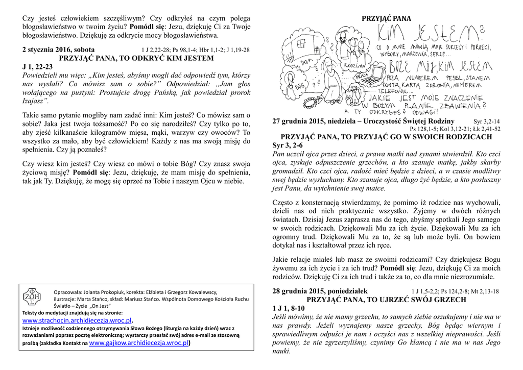 Czy jesteś człowiekiem szczęśliwym? Czy odkryłeś na czym polega błogosławieństwo w twoim życiu? Pomódl się: Jezu, dziękuję Ci za Twoje błogosławieństwo. Dziękuję za odkrycie mocy błogosławieństwa. PRZYJĄĆ PANA 2 stycznia 2016, sobota 1 J 2,22-28; Ps 98,1-4; Hbr 1,1-2; J 1,19-28 PRZYJĄĆ PANA, TO ODKRYĆ KIM JESTEM J 1, 22-23 Powiedzieli mu więc: „Kim jesteś, abyśmy mogli dać odpowiedź tym, którzy nas wysłali? Co mówisz sam o sobie?” Odpowiedział: „Jam głos wołającego na pustyni: Prostujcie drogę Pańską, jak powiedział prorok Izajasz”. Takie samo pytanie mogliby nam zadać inni: Kim jesteś? Co mówisz sam o sobie? Jaka jest twoja tożsamość? Po co się narodziłeś? Czy tylko po to, aby zjeść kilkanaście kilogramów mięsa, mąki, warzyw czy owoców? To wszystko za mało, aby być człowiekiem! Każdy z nas ma swoją misję do spełnienia. Czy ją poznałeś? Czy wiesz kim jesteś? Czy wiesz co mówi o tobie Bóg? Czy znasz swoja życiową misję? Pomódl się: Jezu, dziękuję, że mam misję do spełnienia, tak jak Ty. Dziękuję, że mogę się oprzeć na Tobie i naszym Ojcu w niebie. 27 grudnia 2015, niedziela – Uroczystość Świętej Rodziny Syr 3,2-14 Ps 128,1-5; Kol 3,12-21; Łk 2,41-52 PRZYJĄĆ PANA, TO PRZYJĄĆ GO W SWOICH RODZICACH Syr 3, 2-6 Pan uczcił ojca przez dzieci, a prawa matki nad synami utwierdził. Kto czci ojca, zyskuje odpuszczenie grzechów, a kto szanuje matkę, jakby skarby gromadził. Kto czci ojca, radość mieć będzie z dzieci, a w czasie modlitwy swej będzie wysłuchany. Kto szanuje ojca, długo żyć będzie, a kto posłuszny jest Panu, da wytchnienie swej matce. Często z konsternacją stwierdzamy, że pomimo iż rodzice nas wychowali, dzieli nas od nich praktycznie wszystko. Żyjemy w dwóch różnych światach. Dzisiaj Jezus zaprasza nas do tego, abyśmy spotkali Jego samego w swoich rodzicach. Dziękowali Mu za ich życie. Dziękowali Mu za ich ogromny trud. Dziękowali Mu za to, że są lub może byli. On bowiem dotykał nas i kształtował przez ich ręce. Jakie relacje miałeś lub masz ze swoimi rodzicami? Czy dziękujesz Bogu żywemu za ich życie i za ich trud? Pomódl się: Jezu, dziękuję Ci za moich rodziców. Dziękuję Ci za ich trud i także za to, co dla mnie niezrozumiałe. Opracowała: Jolanta Prokopiuk, korekta: Elżbieta i Grzegorz Kowalewscy, ilustracje: Marta Stańco, skład: Mariusz Stańco. Wspólnota Domowego Kościoła Ruchu Światło – Życie „On Jest” Teksty do medytacji znajdują się na stronie: www.strachocin.archidiecezja.wroc.pl. Istnieje możliwość codziennego otrzymywania Słowa Bożego (liturgia na każdy dzień) wraz z rozważaniami poprzez pocztę elektroniczną; wystarczy przesłać swój adres e-mail ze stosowną prośbą (zakładka Kontakt na www.gajkow.archidiecezja.wroc.pl) 28 grudnia 2015, poniedziałek 1 J 1,5-2,2; Ps 124,2-8; Mt 2,13-18 PRZYJĄĆ PANA, TO UJRZEĆ SWÓJ GRZECH 1 J 1, 8-10 Jeśli mówimy, że nie mamy grzechu, to samych siebie oszukujemy i nie ma w nas prawdy. Jeżeli wyznajemy nasze grzechy, Bóg będąc wiernym i sprawiedliwym odpuści je nam i oczyści nas z wszelkiej nieprawości. Jeśli powiemy, że nie zgrzeszyliśmy, czynimy Go kłamcą i nie ma w nas Jego nauki. Naszym największym nieszczęściem jest grzech. Tragedią naszych czasów jest nie widzenie swojego grzechu. Diabeł przez to nas okrada i unieszczęśliwia. Jedyną drogą wyjścia jest uznanie, że ja zgrzeszyłem i przeproszenie za uczynione zło. Przyjęcie Pana domaga się bowiem pokory, czyli ujrzenia tego kim się jest – jestem grzesznikiem. Czy doświadczasz na co dzień, że jesteś grzesznikiem? Jak często przystępujesz do sakramentu pojednania? Pomódl się: Jezu, dziękuję Ci, że kochasz mnie pomimo tego, że jestem grzesznikiem. Proszę Cię o dostrzeganie swojego grzechu. 29 grudnia 2015, wtorek 1 J 2,3-11; Ps 96,1-6; Łk 2,22-35 PRZYJĄĆ PANA, TO ZAPRASZAĆ GO DO SWOICH WAŻNYCH WYDARZEŃ Łk 2, 22-23 Gdy upłynęły dni Ich oczyszczenia według Prawa Mojżeszowego, Rodzice przynieśli Jezusa do Jerozolimy, aby Go przedstawić Panu. Tak bowiem jest napisane w Prawie Pańskim: „Każde pierworodne dziecko płci męskiej będzie poświęcone Panu”. Bóg żywy pragnie być zapraszany do naszego życia, także do chwil ważnych i pięknych. Urodzenie dziecka jest na pewno taką okazją. Potrzebujemy zatrzymać się w chwilach ważnych i pięknych, aby nauczyć się je smakować i przypominać je sobie w chwilach trudnych. Nowonarodzony Pan pragnie być w każdej chwili naszego życia. Które sytuacje twojego życia uważasz za piękne i ważne? Czy zaprosiłeś do nich Jezusa? Pomódl się: Jezu, dziękuję Ci, że pragniesz być ze mną w każdej chwili mojego życia. Dziękuję, że mogę żyć z Tobą w głębokich relacjach. 30 grudnia 2015, środa 1 J 2,12-17; Ps 96,7-10; Łk 2,36-40 PRZYJĄĆ PANA, TO BYĆ NAPEŁNIONYM DUCHEM ŚWIĘTYM Łk 2, 36. 38 Gdy Rodzice przynieśli Dzieciątko Jezus do świątyni, była tam prorokini Anna, córka Fanuela z pokolenia Asera, bardzo podeszła w latach. Przyszedłszy w tej właśnie chwili, sławiła Boga i mówiła o Nim wszystkim, którzy oczekiwali wyzwolenia Jerozolimy. Aby rozeznać przychodzącego Boga żywego potrzebujemy być napełnieni Duchem Świętym, tak jak Symeon czy prorokini Anna. Mały Jezus nie różnił się w swoim narodzeniu od innych dzieci. Tylko Duch Święty pozwoli nam rozeznać przychodzącego do naszego życia Boga. Czy napełniasz się Duchem Świętym każdego dnia? Czy oczekujesz na przyjście Mesjasza do twojego życia? Pomódl się: Jezu, dziękuję Ci, że Twoje przyjście jest pewne jak świt poranka. Dziękuję za Twojego Ducha Świętego i Jego prowadzenie. 31 grudnia 2015, czwartek 1 J 2,18-21; Ps 96,1-13; J 1,1-18 PRZYJĄĆ PANA, TO ODKRYĆ MOC SŁOWA J 1, 1-5 Na początku było Słowo, a Słowo było u Boga, i Bogiem było Słowo. Ono było na początku u