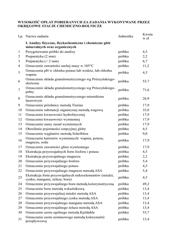 WYSOKOŚĆ OPŁAT POBIERANYCH ZA ZADANIA WYKONYWANE PRZEZ OKRĘGOWE STACJE CHEMICZNO-ROLNICZE Lp. Nazwa zadania 1 2 3 4 5 6 7 8 9 10 11 12 13 14 15 16 17 18 19 20 21 22 23 24 25 26 27 28 29 30 31 I. Analizy fizyczne, fizykochemiczne i chemiczne gleb mineralnych oraz organicznych Przygotowanie próbki do analizy Preparatyka (2 mm) Preparatyka (< 2 mm) Oznaczenie zawartości suchej masy w 105°C Oznaczenia pH w chlorku potasu lub wodzie, lub chlorku wapnia Oznaczenie składu granulometrycznego wg Prószyńskiegoskrócony Oznaczenie składu granulometrycznego wg Prószyńskiegopełny Oznaczenie składu granulometrycznego miernikiem laserowym Oznaczenie próchnicy metodą Tiurina Oznaczenie substancji organicznej metodą wagową Oznaczenie kwasowości hydrolitycznej Oznaczenie kwasowości wymiennej Oznaczenie sumy zasad wymiennych Określenie pojemności sorpcyjnej gleby Oznaczenie węglanów metodą Scheiblera Oznaczenie kationów wymiennych: wapnia, potasu, magnezu, sodu Oznaczenie zawartości glinu wymiennego Ekstrakcja przyswajalnych form fosforu i potasu Ekstrakcja przyswajalnego magnezu Oznaczenie przyswajalnego fosforu Oznaczenie przyswajalnego potasu Oznaczenie przyswajalnego magnezu metodą ASA Ekstrakcja form przyswajalnych mikroelementów (miedzi, cynku, manganu, żelaza, boru) Oznaczenie przyswajalnego boru metodą kolorymetryczną Oznaczenie boru metodą wskaźnikową Oznaczenie przyswajalnej miedzi metodą ASA Oznaczenie przyswajalnego cynku metodą ASA Oznaczenie przyswajalnego manganu metodą ASA Oznaczenie przyswajalnego żelaza metodą ASA Oznaczenie azotu ogólnego metodą Kjeldahla Oznaczenie azotu azotanowego metodą kolorymetrii przepływowej Jednostka Kwota w zł próbka próbka próbka próbka 4,5 2,2 6,7 11,2 próbka 4,5 próbka 53,7 próbka 71,6 próbka 26,9 próbka próbka próbka próbka próbka próbka próbka 17,9 35,8 17,9 17,9 17,9 4,5 9,0 próbka 17,9 próbka próbka próbka próbka próbka próbka 17,9 4,5 2,2 5,4 4,5 5,4 próbka 4,5 próbka próbka próbka próbka próbka próbka próbka 49,2 13,4 13,4 13,4 13,4 13,4 53,7 próbka 13,4 32 33 34 35 36 37 38 39 40 41 42 43 44 45 46 47 48 49 50 51 52 53 54 55 56 57 58 59 60 61 62 63 64 65 66 67 68 69 70 71 Oznaczenie azotu amonowego metodą kolorymetrii przepływowej Oznaczenie azotu łatwo hydrolizującego Oznaczenie siarki ogólnej metodą nefelometryczną Oznaczenie siarki siarczanowej metodą nefelometryczną Oznaczenie rtęci metodą ASA z amalgamacją par rtęci Mineralizacja gleby w mocnych kwasach mineralnych Oznaczenie miedzi metodą ASA Oznaczenie cynku metodą ASA Oznaczenie manganu metodą ASA Oznaczenie żelaza metodą ASA Oznaczenie ołowiu metodą ASA Oznaczenie kadmu metodą ASA Oznaczenie chromu metodą ASA Oznaczenie niklu metodą ASA Oznaczenie arsenu metodą ASA z generacją wodorków Oznaczenie glinu metodą ASA Oznaczenie cyny metodą ASA Oznaczenie selenu metodą ASA z generacją wodorków Oznaczenie kobaltu metodą ASA Oznaczenie molibdenu metodą kolorymetryczną Oznaczenie globalnej aktywności beta Oznaczanie pierwiastków metodą ICP - jeden pierwiastek Inne niewymienione analizy fizyczne, fizykochemiczne i chemiczne gleb mineralnych oraz organicznych II. Analizy fizyczne, fizykochemiczne i chemiczne gleb, podłoży ogrodniczych, pożywek i wody Przygotowanie próbki stałej Przygotowanie próbki płynnej Oznaczenie ciężaru objętościowego Krzywa neutralizacji Oznaczenie pH Oznaczenie zasolenia Ekstrakcja form przyswajalnych w kwasie octowym Oznaczenie fosforu metodą kolorymetryczną Oznaczenie potasu metodą fotometrii płomieniowej/ASA Oznaczenie wapnia metodą fotometrii płomieniowej/ASA Oznaczenie sodu metodą fotometrii płomieniowej/ASA Oznaczenie magnezu metodą ASA Oznaczenie azotu azotanowego metodą jonometryczną Oznaczenie azotu amonowego metodą jonometryczną Oznaczenie chloru metodą jonometryczną Oznaczenie twardości wody Oznaczenie twardości węglanowej próbka 13,4 próbka próbka próbka próbka próbka próbka próbka próbka próbka próbka próbka próbka próbka próbka próbka próbka próbka próbka próbka próbka próbka 26,9 49,2 26,9 40,3 35,8 13,4 13,4 13,4 13,4 40,3 40,3 40,3 40,3 40,3 40,3 40,3 40,3 40,3 40,3 56,4 17,5 godz. 26,85 próbka próbka próbka próbka próbka próbka próbka próbka próbka próbka próbka próbka próbka próbka próbka próbka próbka 4,5 2,2 5,4 22,4 4,5 5,4 4,5 5,4 4,5 4,5 4,5 5,4 6,3 6,3 6,3 17,9 17,9 72 73 74 75 76 77 78 79 80 81 82 83 84 85 86 87 88 89 90 91 92 93 94 95 96 97 98 99 100 101 102 103 104 105 106 107 108 109 110 111 Oznaczenie zasadowości Oznaczenie wodorowęglanów metodą miareczkową Oznaczenie siarki metodą turbidymetryczną Oznaczenie azotu amonowego metodą kolorymetryczną Oznaczenie azotu azotanowego metodą kolorymetryczną Oznaczenie wapnia metodą miareczkową Oznaczenie boru Ekstrakcja form przyswajalnych mikroelementów Oznaczenie przyswajalnej miedzi metodą ASA Oznaczenie przyswajalnego cynku metodą ASA Oznaczenie przyswajalnego manganu metodą ASA Oznaczenie przyswajalnego żelaza metodą ASA Oznaczanie pierwiastków metodą ICP - jeden pierwiastek Inne niewymienione analizy fizyczne, fizykochemiczne i chemiczne gleb, podłoży ogrodniczych, pożywek i wody III. Analizy fizyczne, fizykochemiczne i chemiczne materiału roślinnego i pasz Przygotowanie próbki Preparatyka próbki świeżej (homogenizowanie) Preparatyka próbki suchej (mielenie) Preparatyka próbki świeżej (suszenie + mielenie) Oznaczenie suchej masy w 105°C Mineralizacja do oznaczeń makroskładników Oznaczenie azotu ogólnego metodą miareczkową Oznaczenie fosforu metodą kolorymetryczną Oznaczenie potasu metodą fotometrii płomieniowej/ASA Oznaczenie wapnia metodą fotometrii płomieniowej/ASA Oznaczenie magnezu metodą ASA Oznaczenie sodu metodą fotometrii płomieniowej/ASA Oznaczenie chlorków Mineralizacja do oznaczeń mikroelementów i pierwiastków śladowych Oznaczenie miedzi metodą ASA Oznaczenie