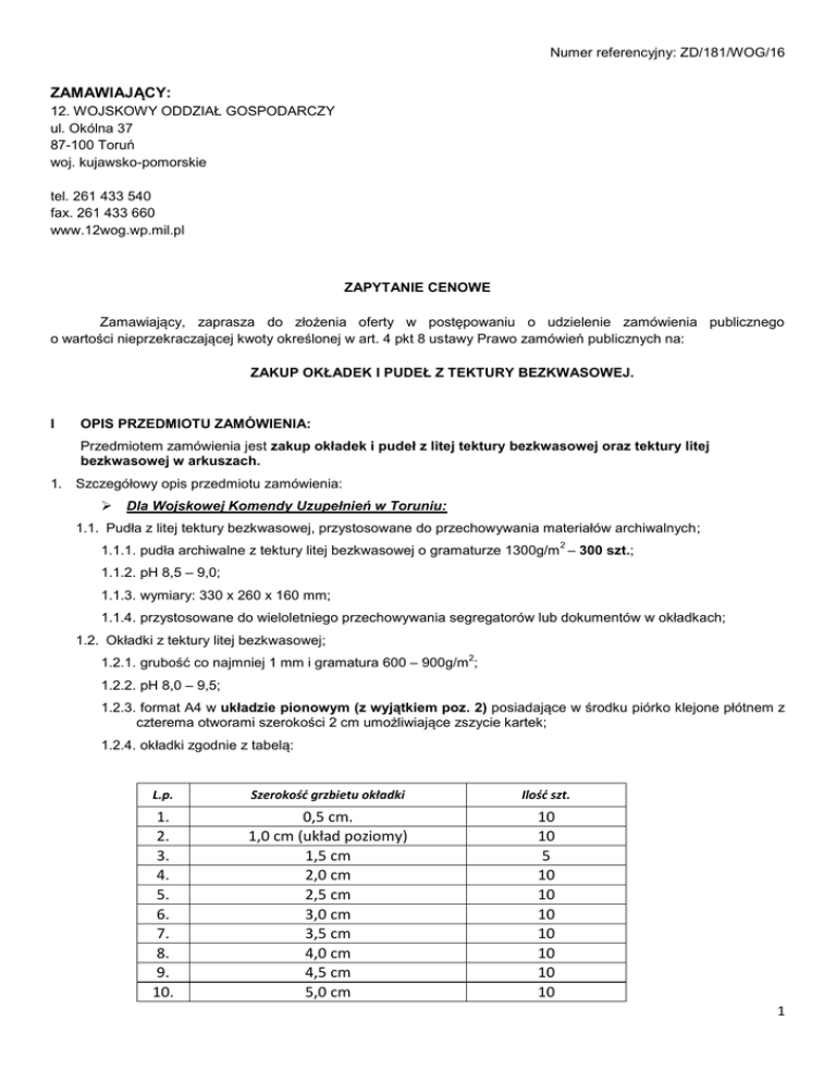 Numer referencyjny: ZD/181/WOG/16 ZAMAWIAJĄCY: 12. WOJSKOWY ODDZIAŁ GOSPODARCZY ul. Okólna 37 87-100 Toruń woj. kujawsko-pomorskie tel. 261 433 540 fax. 261 433 660 www.12wog.wp.mil.pl ZAPYTANIE CENOWE Zamawiający, zaprasza do złożenia oferty w postępowaniu o udzielenie zamówienia publicznego o wartości nieprzekraczającej kwoty określonej w art. 4 pkt 8 ustawy Prawo zamówień publicznych na: ZAKUP OKŁADEK I PUDEŁ Z TEKTURY BEZKWASOWEJ. I OPIS PRZEDMIOTU ZAMÓWIENIA: Przedmiotem zamówienia jest zakup okładek i pudeł z litej tektury bezkwasowej oraz tektury litej bezkwasowej w arkuszach. 1. Szczegółowy opis przedmiotu zamówienia: Dla Wojskowej Komendy Uzupełnień w Toruniu: 1.1. Pudła z litej tektury bezkwasowej, przystosowane do przechowywania materiałów archiwalnych; 2 1.1.1. pudła archiwalne z tektury litej bezkwasowej o gramaturze 1300g/m – 300 szt.; 1.1.2. pH 8,5 – 9,0; 1.1.3. wymiary: 330 x 260 x 160 mm; 1.1.4. przystosowane do wieloletniego przechowywania segregatorów lub dokumentów w okładkach; 1.2. Okładki z tektury litej bezkwasowej; 2 1.2.1. grubość co najmniej 1 mm i gramatura 600 – 900g/m ; 1.2.2. pH 8,0 – 9,5; 1.2.3. format A4 w układzie pionowym (z wyjątkiem poz. 2) posiadające w środku piórko klejone płótnem z czterema otworami szerokości 2 cm umożliwiające zszycie kartek; 1.2.4. okładki zgodnie z tabelą: L.p. Szerokość grzbietu okładki Ilość szt. 1. 2. 3. 4. 5. 6. 7. 8. 9. 10. 0,5 cm. 1,0 cm (układ poziomy) 1,5 cm 2,0 cm 2,5 cm 3,0 cm 3,5 cm 4,0 cm 4,5 cm 5,0 cm 10 10 5 10 10 10 10 10 10 10 1 Numer referencyjny: ZD/181/WOG/16 RAZEM 95 Dla Wojskowej Komendy Uzupełnień we Włocławku: 1.3. Pudła z litej tektury bezkwasowej, przystosowane do przechowywania materiałów archiwalnych; 2 1.3.1. pudła archiwalne typu kopertowego z tektury litej bezkwasowej prior o gramaturze 1300g/m – 60 szt.; 1.3.2. pH 8,0 – 9,5; 1.3.3. wymiary: 350 x 260 x 130 mm; 1.3.4. przystosowane do wieloletniego przechowywania dokumentów w okładkach; 1.4. Okładki z tektury litej bezkwasowej; 2 1.4.1. grubość co najmniej 1 mm i gramatura 600 – 900g/m ; 1.4.2. pH 8,0 – 9,5; 1.4.3. format A4 w układzie pionowym posiadające w środku piórko klejone płótnem z czterema otworami, szerokości 2 cm umożliwiające zszycie kartek; 1.4.4. okładki zgodnie z tabelą: L.p. Szerokość grzbietu okładki Ilość szt. 1. 2. 3. 4. 5. 6. 7. 8. 9. 10. 0,5 cm 1,0 cm 1,5 cm 2,0 cm 2,5 cm 3,0 cm 3,5 cm 4,0 cm 4,5 cm 5,0 cm 10 10 5 10 10 10 10 10 10 20 105 RAZEM 1.5. Tektura lita, bezkwasowa – 40 arkuszy; 2 1.5.1.grubość 1 mm i gramatura 600- 900g/m ; 1.5.2.pH 8,0 – 9,5; 1.5.3.wymiary: 350 x 700 mm; 2. Wykonawca wystawi dwie faktury (na poszczególne, wymienione wyżej jednostki wojskowe). 3. Zamawiający nie przewiduje składania ofert częściowych. 4. Wymagany produkt jest nowy, nieużywany, nieregenerowany, wyprodukowany nie wcześniej niż 2016 roku oraz wolny od wad prawnych i fizycznych oraz roszczeń osób trzecich. 5. Świadczona dostawa odbędzie się na koszt i odpowiedzialność Wykonawcy. 6. Wykonawca odpowiada za wady prawne i fizyczne ujawnione w dostarczonym wyrobie i ponosi z tego tytułu wszelkie zobowiązania. 7. Przekazanie materiałów nastąpi na podstawie protokołu przekazania sporządzonego przez Wykonawcę oraz złożeniu na nim podpisów przez Wykonawcę i Odbiorcę 8. Protokół przekazania winien zawierać: - numer i datę wystawienia; - pełną nazwę Wykonawcy umowy; 2 Numer referencyjny: ZD/181/WOG/16 - pełną nazwę Zamawiającego; - podstawę przekazania – numer i datę podpisania umowy; - pełną nazwę przedmiotu umowy wraz ze wszystkimi możliwymi do ustalenia danymi identyfikującymi produkt; - cenę netto, wysokość podatku VAT, cenę brutto przedmiotu umowy; - wykaz przekazanej dokumentacji przedmiotu zamówienia (jeżeli występuje); - dane personalne osób dokonujących przekazania – przyjęcia; - datę przekazania; - podpisy osób dokonujących przekazania – przyjęcia przedmiotu zamówienia. 9. Wykonawca oświadcza, że posiada odpowiednie uprawnienia, wiedzę, kwalifikacje i doświadczenie niezbędne do wykonania przedmiotu Umowy. Wykonawca podczas realizacji przedmiotu umowy zobowiązuje się do posługiwania wyłącznie osobami posiadającymi właściwości, o których mowa w zdaniu poprzedzającym. 10. O stwierdzeniu braków, wad lub innych zastrzeżeń, Zamawiający poinformuje (zgłosi) Wykonawcę telefonicznie (potwierdzi zaistniały fakt faksem), faksem lub drogą elektroniczną na wskazany adres e-mail. 11. Zapłata za wykonanie przedmiotu zamówienia, nastąpi po dostarczeniu przez Wykonawcę oryginału faktury wystawionej na Zamawiającego, określającej przedmiot zamówienia oraz protokołu przekazania sporządzonego przez Wykonawcę oraz złożeniu na nim podpisów przez Wykonawcę i Odbiorcę. 12. W trakcie przekazywania dostaw, Wykonawca podda się rygorom procedur bezpieczeństwa realizowanym przez Służbę Dyżurną Odbiorcy oraz przez Służbę Kontrwywiadu Wojskowego. 13. W przypadku naruszenia zapisów procedur wejścia (wjazdu) na teren 12 WOG, w tym zagubienia wydanych przepustek nałożona zostanie kara umowna w wysokości 100 PLN za każdy przypadek. 14. Posługiwanie się przepustką wydaną na nazwisko innej osoby będzie traktowane jako naruszenie art. 274 i 275 Kodeksu Karnego przez osobę udostępniającą i posługującą się daną przepustką. II MIEJSCE I TERMIN REALIZACJI ZAKUPU 1. Miejsce dostawy: 12 Wojskowy Oddział Gospodarczy 87-100 Toruń, ul. Okólna 37 2. Termin realizacji umowy: do 30.11.2016 r. 3. Dostawa realizowana w dni robocze w godz. 8.00 – 14.00 4. Wykonawca dostarczy przedmiot zamówienia do Zamawiającego własnym transportem oraz zapewni wniesienie całości towaru do magazynu. 5. Zamawiający nie dysponuje możliwością rozładunku zamówionego sprzętu. 6. Płatność: faktura, przelewem – termin płatności 30 dni od daty otrzyman