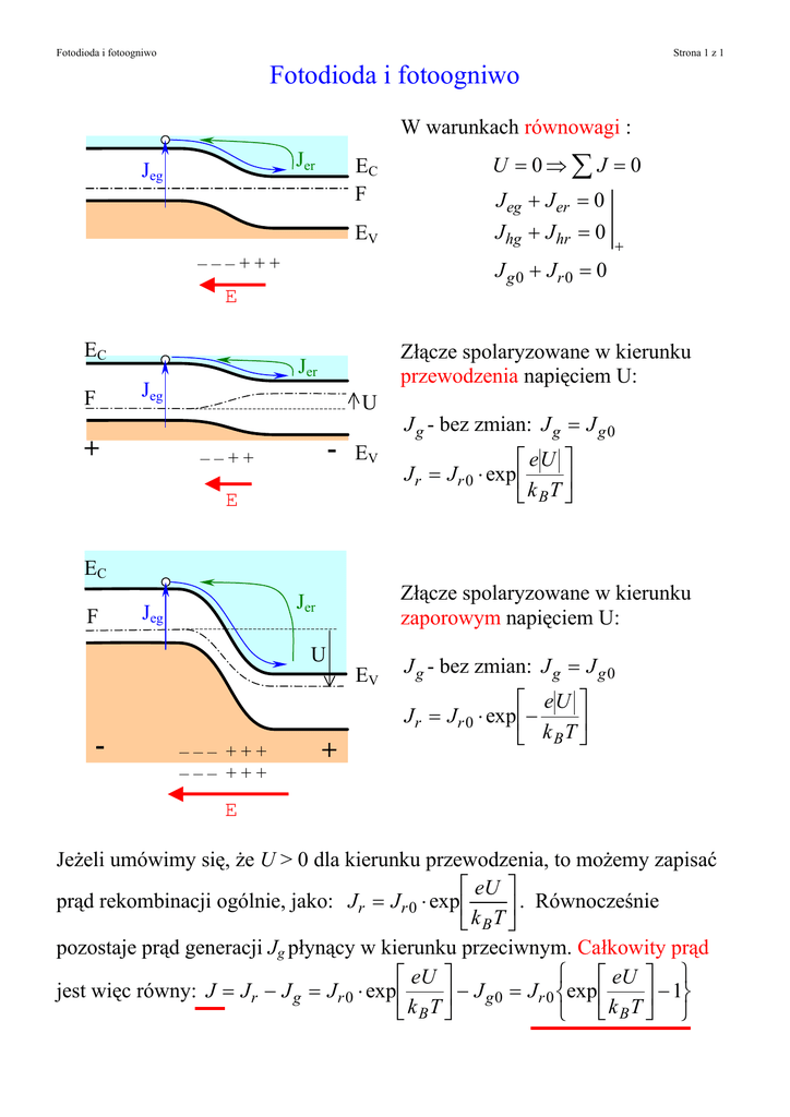 Fotodioda i fotoogniwo Strona 1 z 1 Fotodioda i fotoogniwo W warunkach równowagi : Jer Jeg EC F U = 0⇒ ∑ J = 0 EV J hg + J hr = 0 J eg + J er = 0 –––+++ J g 0 + Jr 0 = 0 E EC + Złącze spolaryzowane w kierunku przewodzenia napięciem U: Jer Jeg F U - EV ––++ E EC F U - J g - bez zmian: J g = J g 0 J r = J r 0 ⋅ exp LM eU OP Nk T Q B Złącze spolaryzowane w kierunku zaporowym napięciem U: Jer Jeg EV J g - bez zmian: J g = J g 0 LM N J r = J r 0 ⋅ exp − ––– +++ ––– +++ + + eU k BT OP Q E Jeżeli umówimy się, że U > 0 dla kierunku przewodzenia, to możemy zapisać eU prąd rekombinacji ogólnie, jako: J r = J r 0 ⋅ exp . Równocześnie k BT pozostaje prąd generacji Jg płynący w kierunku przeciwnym. Całkowity prąd eU eU − J g 0 = J r 0 exp −1 jest więc równy: J = J r − J g = J r 0 ⋅ exp k BT k BT LM OP N Q LM OP N Q RS L O UV T MN PQ W