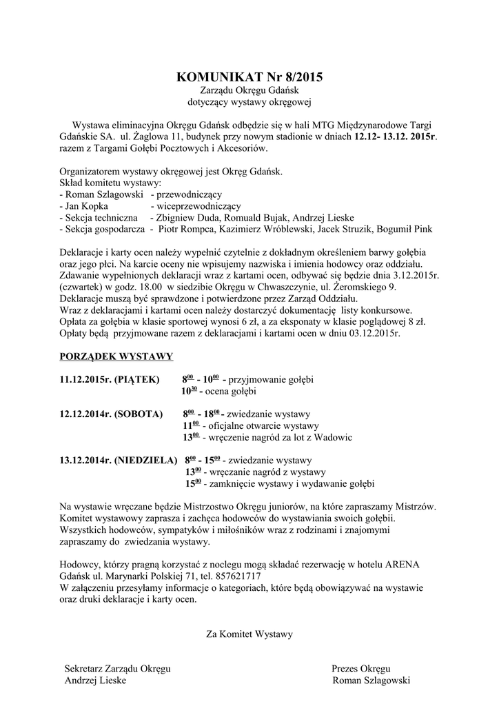 KOMUNIKAT Nr 8/2015 Zarządu Okręgu Gdańsk dotyczący wystawy okręgowej Wystawa eliminacyjna Okręgu Gdańsk odbędzie się w hali MTG Międzynarodowe Targi Gdańskie SA. ul. Żaglowa 11, budynek przy nowym stadionie w dniach 12.12- 13.12. 2015r. razem z Targami Gołębi Pocztowych i Akcesoriów. Organizatorem wystawy okręgowej jest Okręg Gdańsk. Skład komitetu wystawy: - Roman Szlagowski - przewodniczący - Jan Kopka - wiceprzewodniczący - Sekcja techniczna - Zbigniew Duda, Romuald Bujak, Andrzej Lieske - Sekcja gospodarcza - Piotr Rompca, Kazimierz Wróblewski, Jacek Struzik, Bogumił Pink Deklaracje i karty ocen należy wypełnić czytelnie z dokładnym określeniem barwy gołębia oraz jego płci. Na karcie oceny nie wpisujemy nazwiska i imienia hodowcy oraz oddziału. Zdawanie wypełnionych deklaracji wraz z kartami ocen, odbywać się będzie dnia 3.12.2015r. (czwartek) w godz. 18.00 w siedzibie Okręgu w Chwaszczynie, ul. Żeromskiego 9. Deklaracje muszą być sprawdzone i potwierdzone przez Zarząd Oddziału. Wraz z deklaracjami i kartami ocen należy dostarczyć dokumentację listy konkursowe. Opłata za gołębia w klasie sportowej wynosi 6 zł, a za eksponaty w klasie poglądowej 8 zł. Opłaty będą przyjmowane razem z deklaracjami i kartami ocen w dniu 03.12.2015r. PORZĄDEK WYSTAWY 11.12.2015r. (PIĄTEK) 800 - 1000 - przyjmowanie gołębi 1030 - ocena gołębi 12.12.2014r. (SOBOTA) 800 - 1800 - zwiedzanie wystawy 1100 - oficjalne otwarcie wystawy 1300 - wręczenie nagród za lot z Wadowic 13.12.2014r. (NIEDZIELA) 800 - 1500 - zwiedzanie wystawy 1300 - wręczanie nagród z wystawy 1500 - zamknięcie wystawy i wydawanie gołębi Na wystawie wręczane będzie Mistrzostwo Okręgu juniorów, na które zapraszamy Mistrzów. Komitet wystawowy zaprasza i zachęca hodowców do wystawiania swoich gołębii. Wszystkich hodowców, sympatyków i miłośników wraz z rodzinami i znajomymi zapraszamy do zwiedzania wystawy. Hodowcy, którzy pragną korzystać z noclegu mogą składać rezerwację w hotelu ARENA Gdańsk ul. Marynarki Polskiej 71, tel. 857621717 W załączeniu przesyłamy informacje o kategoriach, które będą obowiązywać na wystawie oraz druki deklaracje i karty ocen. Za Komitet Wystawy Sekretarz Zarządu Okręgu Andrzej Lieske Prezes Okręgu Roman Szlagowski KATEGORIE OBOWIĄZUJĄCE NA WYSTAWIE Weterani – od 25 konkursów, minimum 1 konkurs w 2015 Kategoria Standard Samczyki – konkursy zdobyte na bazie w latach 2014 i 2015 łącznie 2.500 kkm, uzyskanych na bazie 1:5 z lotów pow. 100 km i przy minimalnej ilości 150 gołębi biorących udział w locie i 20 hodowców. W roku 2015 minimum 30% obowiązującego kilometrażu (tj. 750 kkm.). Olimpijska Standard Samiczki – konkursy zdobyte na bazie w latach 2014 i 2015 łącznie 2000 kkm, uzyskanych na bazie 1:5 z lotów pow. 100 km i przy minimalnej ilości 150 gołębi biorących udział w locie i 20 hodowców. W roku 2015 minimum 30% obowiązującego kilometrażu (tj. 600 kkm.). Olimpijska Standard Samczyki Młode 2015 – trzy konkursy zdobyte w roku 2015 na bazie 1:5 z lotów powyżej 100 km przy minimalnej ilości startujących 20 hodowców i 250 gołębiach. Olimpijska Standard Samiczki Młode 2015 – trzy konkursy zdobyte w roku 2015 na bazie 1:5 z lotów powyżej 100 km przy minimalnej ilości startujących 20 hodowców i 250 gołębiach. Kryteria sportowe na dwa lata: 2014-2015 Kategorie Odległość w km Ilość konkursów Ilość uczestniczących gołębi Minimalna liczba hodowców A 100 - 400 10 250 20 Łączna trasa długości w km minimalna 1500 300 – 600 8 250 20 2800 pow. 500 6 150 20 3300 100 – 400 300 – 600 pow. 500 pow. 700 11 3 do 5 2 do 6 1 do 3 4 250 250 150 250 20 20 20 50 wg ceofficjentów. B wg ceofficjentów. C wg ceofficjentów D wg ceofficjentów E Maraton wg ceofficjentów 3500 2800 Kryteria sportowe w 2015r. Kategorie Odległość w km Ilość konkursów Ilość Minimalna uczestniczących liczba gołębi uczestników ½A 100 - 400 5 250 20 Łączna trasa długości w km minimalna 750 300 – 600 4 250 20 1400 pow. 500 3 150 20 1650 pow. 700 2 250 20 1400 ponad 100 km 3 250 20 300 ponad 100 km 5 250 20 500 ponad 300 km 6 250 20 1800 wg ceofficjentów. ½B wg ceofficjentów. ½C wg ceofficjentów ½M wg ceofficjentów F młode gołębie wg ceofficjentów G roczniaki wg ceofficjentów H gołębie dorosłe wg ceofficjentów Wyczynowa pow. 100 km minimum 3000 km w 2015r. o kolejności decyduje ilość konkursów a następnie ceofficjent Roczne Wyczyn pow. 100 km minimum 2000 km w 2015r. o kolejności decyduje ilość konkursów a następnie ceofficjent Półolimpijska samce minimum 1250 km w 2015r. samice minimum 1000 km w 2015r. Dalekodystansowa - 1 konkurs w 2015r. pow. 750 km Standard B - 1 konkurs w 2015r. pow. 100 km Poglądowa - bez konkursu Młode Wyczyn - od 3-5 konkursów o kolejności decydują konkursy a następnie ceofficjent, obowiązuje plan lotów Młode Standard - co najmniej 1 konkurs Młode Dalekodystansowe pow. 400km - 1 konkurs Kategoria Sport – wyczyn gołębie sklasyfikowane wg najwyższego konkursokilometrażu uzyskanego w latach 2014 i 2015 z list konkursowych sporządzonych na bazie 1:5. Przypominamy, że z list sekcyjnych można korzystać jedynie z lotów organizowanych w przedziale 100-400 km. W każdej klasie wystawowej nagrodzonych zostanie 20% wystawionych gołębi. W klasach sportowych bez dalekodystansowej obowiązuje podwójne nagrodzenie: za standard i za sport. W klasach dalekodystansowych gołębie zostają nagrodzone tylko za standard. W kategorii standard pięć samczyków i pięć samiczek oraz 2 samczyki i 2 samiczki młode rocznika 2015 uzyska tytuł Reprezentanta Okręgu Gdańsk. W klasach sportowych trzy pierwsze gołębie bez względu na płeć uzyskują tytuł Reprezentanta Okręgu Gdańsk . Za komitet wystawowy Sekretarz Andrzej Lieske Przewodniczący Roman Szlagowski