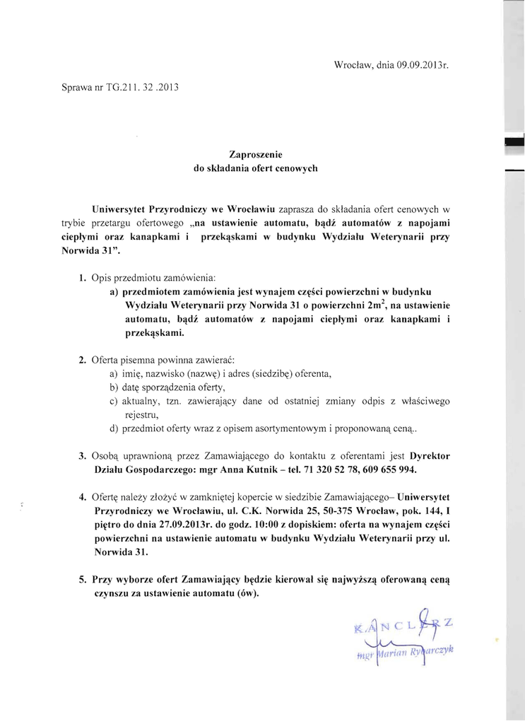 Wroclaw, dnia 09.09.2013r. Sprawa nr TG.211. 32 .2013  Zaproszenie do skladania ofert cenowych Uniwersytet PrLyrodniczy we Wroclawiu zaprasza do skladania ofert cenowych w trybie przetargu ofertowego "na ustawienie automatu, b~di automatow z napojami cieplymi oraz kanapkami i przek~skami w budynku Wydzialu Weterynarii przy Norwida 31". 1. Opis przedmiotu zam6wienia: a) przedmiotem zamowienia jest wynajem cz~sci powierzchni w budynku Wydzialu Weterynarii przy Norwida 31 0 powierzchni 2m2, na ustawienie automatu, b~di automatow z napojami cieplymi oraz kanapkami i przek~skami. 2. Oferta a) b) c) pisemna powinna zawierac: imitt, nazwisko (nazwtt) i adres (siedzibtt) oferenta, dattt sporzqdzenia oferty, aktualny, tzn. zawierajqcy dane od ostatniej zmiany odpis z wlasciwego rejestru, d) przedmiot oferty wraz z opisem asortymentowym i proponowan::t cen::t.. 3. Osob::t uprawnion::t przez Zamawiaj::tcego do kontaktu z oferentami jest Dyrektor Dzialu Gospodarczego: mgr Anna Kutnik - tel. 71 32052 78,609655994. 4. Oferttt nalezy zlozyc w zamknitttej kopercie w siedzibie Zamawiaj::tcego- Uniwersytet Przyrodniczy we Wroclawiu, ul. C.K. Norwida 25, 50-375 Wroclaw, pok. 144, I pi~tro do dnia 27.09.2013r. do godz. 10:00 z dopiskiem: oferta na wynajem cz~sci powierzchni na ustawienie automatu w budynku Wydzialu Weterynarii przy ul. Norwida 31. 5. Przy wyborze ofert Zamawiaj~cy b~dzie kierowal czynszu za ustawienie automatu (ow). si~ najwyZsz~ oferowan~ cen~ .L9-t Z a/'czyk
