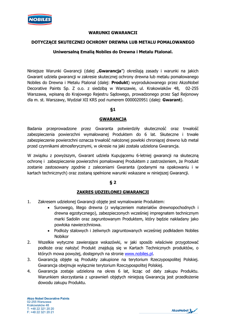 WARUNKI GWARANCJI DOTYCZĄCE SKUTECZNEJ OCHRONY DREWNA LUB METALU POMALOWANEGO Uniwersalną Emalią Nobiles do Drewna i Metalu Ftalonal. Niniejsze Warunki Gwarancji (dalej „Gwarancja”) określają zasady i warunki na jakich Gwarant udziela gwarancji w zakresie skutecznej ochrony drewna lub metalu pomalowanego Nobiles do Drewna i Metalu Ftalonal (dalej: Produkt) wyprodukowanego przez AkzoNobel Decorative Paints Sp. Z o.o. z siedzibą w Warszawie, ul. Krakowiaków 48, 02-255 Warszawa, wpisaną do Krajowego Rejestru Sądowego, prowadzonego przez Sąd Rejonowy dla m. st. Warszawy, Wydział XII KRS pod numerem 0000020951 (dalej: Gwarant). §1 GWARANCJA Badania przeprowadzone przez Gwaranta potwierdziły skuteczność oraz trwałość zabezpieczenia powierzchni wymalowanej Produktem do 6 lat. Skuteczne i trwałe zabezpieczenie powierzchni oznacza trwałość nałożonej powłoki chroniącej drewno lub metal przed czynnikami atmosferycznymi, w okresie na jaki została udzielona Gwarancja. W związku z powyższym, Gwarant udziela Kupującemu 6-letniej gwarancji na skuteczną ochronę i zabezpieczenie powierzchni pomalowanej Produktem z zastrzeżeniem, że Produkt zostanie zastosowany zgodnie z zaleceniami Gwaranta (podanymi na opakowaniu i w kartach technicznych) oraz zostaną spełnione warunki wskazane w niniejszej Gwarancji. §2 ZAKRES UDZIELONEJ GWARANCJI 1. 2. 3. 4. Zakresem udzielonej Gwarancji objęte jest wymalowanie Produktem: Surowego, litego drewna (z wyłączeniem materiałów drewnopochodnych i drewna egzotycznego), zabezpieczonych wcześniej impregnatem technicznym marki Sadolin oraz zagruntowanym Produktem, który będzie nakładany jako powłoka nawierzchniowa. Podłoży stalowych i żeliwnych zagruntowanych wcześniej podkładem Nobiles Nobikor Wszelkie wytyczne zawierające wskazówki, w jaki sposób właściwie przygotować podłoże oraz nałożyć Produkt znajdują się w Kartach Technicznych produktów, o których mowa powyżej, dostępnych na stronie www.nobiles.pl. Gwarancją objęte są Produkty zakupione na terytorium Rzeczypospolitej Polskiej. Gwarancja obejmuje wyłącznie terytorium Rzeczypospolitej Polskiej. Gwarancja zostaje udzielona na okres 6 lat, licząc od daty zakupu Produktu. Warunkiem skorzystania z uprawnień objętych niniejszą Gwarancją jest przedłożenie dowodu zakupu Produktu. Akzo Nobel Decorative Paints 02-255 Warszawa Krakowiaków 48 T: +48 22 321 20 20 F: +48 22 321 20 21 §3 OKOLICZNOŚCI NIEOBJĘTE GWARANCJĄ 1. Gwarancją nie są objęte następujące sytuacje: Produkt zostaje nabyty przez Kupującego, w momencie gdy jego termin przydatności upłynął, Gdy transport i przechowanie Produktu odbywa się wbrew zaleceniom Gwaranta, dostępnym na opakowaniu Produktu, lub w Karcie Technicznej, Kiedy podłoże zostało przygotowane niezgodnie z zaleceniami z Karty Technicznej Produktu, Kiedy aplikacja Produktu odbyła się niezgodnie z zaleceniami z Karty Technicznej Produktu, Kiedy grubość powłoki jest poniżej zaleceń z Karty Technicznej Produktu, Kiedy wymalowanie wykonano w warunkach atmosferycznych niezgodnych z Kartą Techniczną albo na podłożach, które mają wpływ na obniżenie trwałości powłoki malarskiej (tj. np. w których zalega śnieg, deszcz, nierówne podłoże (ubytki)), Kiedy wymalowanie wykonano na powierzchniach eksploatowanych poziomych, Kiedy powierzchnia malowana uległa degradacji/zniszczeniu np. przez zwierzęta, agresywne środki chemiczne, zanurzenie w wodzie, zakopanie w ziemi, wysokie temperatury – powyżej 45 st. C, Kiedy ze względu na swój kształt, cechy lub wielkość powierzchnie drewniane i metalowe odznaczają się szczególnym stopniem trudności w zakresie przygotowania podłoża i aplikacji Produktu, Kiedy powierzchnia pomalowana była niewłaściwie eksploatowana, tj. nie w sposób i nie dla celów, dla których się jej zwyczajowo używa, sposób i cel znany dla przeciętnego Kupującego, Kiedy powierzchnia została zniszczona mechanicznie (np. poprzez uderzenia, nacięcia, itp.) [np. drewniana ławka, która została uszkodzona rzucanymi w nią kamieniami, gradobicie], Kiedy Produkt został nabyty po obniżonej cenie z uwagi na jego niepełnowartościowość, Kiedy pomalowana powierzchnia została uszkodzona na skutek działania Siły Wyższej 2. Gwarancja nie obejmuje sytuacji, w których Produkt użytkowany jest na skalę przemysłową lub przy wykorzystaniu metod przemysłowych. Przez użycie na skalę przemysłową lub przy wykorzystaniu metodami przemysłowymi należy rozumieć zastosowanie Produktu w zakresie i celu, w jakim danym podmiot prowadzi działalność gospodarczą. Wyłączeniem nie jest objęte zastosowanie Produktu na własny użytek. 3. W przypadku opisanym w ust. powyżej, Gwarant przewiduje możliwość udzielenia gwarancji, jednakże jej warunki będą każdorazowo ustalane indywidualnie z danym przedsiębiorcą. Akzo Nobel Decorative Paints 02-255 Warszawa Krakowiaków 48 T: +48 22 321 20 20 F: +48 22 321 20 21 §4 ZOBOWIĄZANIA GWARANTA 1. W związku z udzielona Gwarancją, w przypadku uznania roszczenia gwarancyjnego za zasadne, Gwarant zobowiązuje się do wydania Kupującemu Produktu w ilości odpowiadającej ilości Produktu reklamowanego przez Kupującego. Gwarant, w związku ze złożoną reklamacją gwarancyjną przez Kupującego, obowiązany jest jedynie do świadczeń wyraźnie wskazanych w niniejszej Gwarancji. 2. §5 ZGŁOSZENIA REKLAMACYJNE 1. Kupujący może skorzystać z uprawnień wynikających z Gwarancji poprzez dokonanie „Zgłoszenia Reklamacyjnego”: 2. 3. 4. 5. na piśmie, przesłanego listem poleconym, nadanego u operatora pocztowego za pomocą formularza „Zgłoszenie Reklamacji” dostępnego na stronie www.nobiles.pl Zgłoszenie Reklamacyjne powinno zawierać: opis Produktu, którego dotyczy. opis powierzchni, na której zastosowano Produkt opis powstałej wady dane kontaktowe Kupującego takie jak: imię i nazwisko, adres korespondency