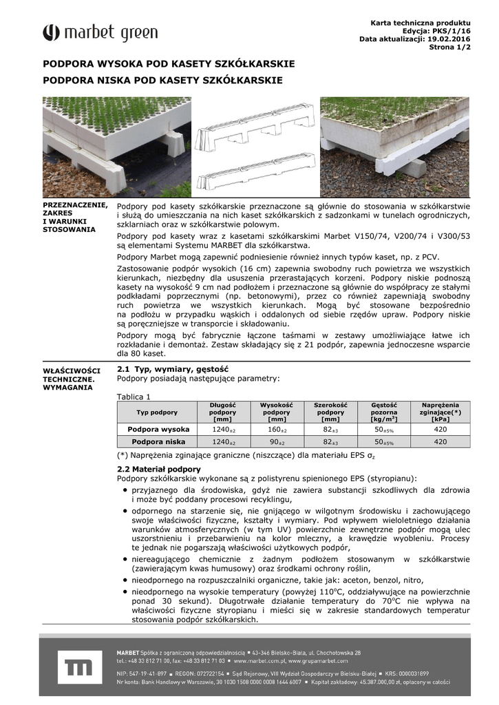 Karta techniczna produktu Edycja: PKS/1/16 Data aktualizacji: 19.02.2016 Strona 1/2 PODPORA WYSOKA POD KASETY SZKÓŁKARSKIE PODPORA NISKA POD KASETY SZKÓŁKARSKIE PRZEZNACZENIE, ZAKRES I WARUNKI STOSOWANIA Podpory pod kasety szkółkarskie przeznaczone są głównie do stosowania w szkółkarstwie i służą do umieszczania na nich kaset szkółkarskich z sadzonkami w tunelach ogrodniczych, szklarniach oraz w szkółkarstwie polowym. Podpory pod kasety wraz z kasetami szkółkarskimi Marbet V150/74, V200/74 i V300/53 są elementami Systemu MARBET dla szkółkarstwa. Podpory Marbet mogą zapewnić podniesienie również innych typów kaset, np. z PCV. Zastosowanie podpór wysokich (16 cm) zapewnia swobodny ruch powietrza we wszystkich kierunkach, niezbędny dla ususzenia przerastających korzeni. Podpory niskie podnoszą kasety na wysokość 9 cm nad podłożem i przeznaczone są głównie do współpracy ze stałymi podkładami poprzecznymi (np. betonowymi), przez co również zapewniają swobodny ruch powietrza we wszystkich kierunkach. Mogą być stosowane bezpośrednio na podłożu w przypadku wąskich i oddalonych od siebie rzędów upraw. Podpory niskie są poręczniejsze w transporcie i składowaniu. Podpory mogą być fabrycznie łączone taśmami w zestawy umożliwiające łatwe ich rozkładanie i demontaż. Zestaw składający się z 21 podpór, zapewnia jednoczesne wsparcie dla 80 kaset. WŁAŚCIWOŚCI TECHNICZNE. WYMAGANIA 2.1 Typ, wymiary, gęstość Podpory posiadają następujące parametry: Tablica 1 Typ podpory Długość podpory [mm] Wysokość podpory [mm] Szerokość podpory [mm] Gęstość pozorna [kg/m3] Naprężenia zginające(*) [kPa] Podpora wysoka 1240±2 160±2 82±3 50±5% 420 Podpora niska 1240±2 90±2 82±3 50±5% 420 (*) Naprężenia zginające graniczne (niszczące) dla materiału EPS σz 2.2 Materiał podpory Podpory szkółkarskie wykonane są z polistyrenu spienionego EPS (styropianu): przyjaznego dla środowiska, gdyż nie zawiera substancji szkodliwych dla zdrowia i może być poddany procesowi recyklingu, odpornego na starzenie się, nie gnijącego w wilgotnym środowisku i zachowującego swoje właściwości fizyczne, kształty i wymiary. Pod wpływem wieloletniego działania warunków atmosferycznych (w tym UV) powierzchnie zewnętrzne podpór mogą ulec uszorstnieniu i przebarwieniu na kolor mleczny, a krawędzie wyobleniu. Procesy te jednak nie pogarszają właściwości użytkowych podpór, niereagującego chemicznie z żadnym podłożem stosowanym (zawierającym kwas humusowy) oraz środkami ochrony roślin, w szkółkarstwie nieodpornego na rozpuszczalniki organiczne, takie jak: aceton, benzol, nitro, nieodpornego na wysokie temperatury (powyżej 110oC, oddziaływujące na powierzchnie ponad 30 sekund). Długotrwałe działanie temperatury do 70 oC nie wpływa na właściwości fizyczne styropianu i mieści się w zakresie standardowych temperatur stosowania podpór szkółkarskich. Karta techniczna produktu Edycja: PKS/1/16 Data aktualizacji: 19.02.2016 Strona 2/2 WŁAŚCIWOŚCI TECHNICZNE. WYMAGANIA 2.3 Wygląd zewnętrzny i cechy podpór pod kasety szkółkarskie Mają postać belek o przekroju trapezowym z czterema nogami. Na powierzchniach czołowych podpory wykonane są „zamki” układanie ciągów podpór. Powierzchnia podpór kaset szkółkarskich powinna być gładka, bez dziur, wyrwań i załamań. Podpory kaset szkółkarskich posiadają wytłoczone: adres strony WWW producenta, znak recyklingu, datę produkcji (rok) oraz kod materiału (EPS). Na górnej powierzchni wzdłuż podpory wykonany jest garb, który ułatwia układanie kaset na podporach. Jedna podpora standardowo podpiera 8 kaset, po 4 z każdej strony. ułatwiające równe Podpory są odporne na: PAKOWANIE, PRZECHOWYWANIE I TRANSPORT obciążenia stałe ciężarem kaset szkółkarskich wypełnionych materiałem szkółkarskim oraz obciążenie ruchome (ciężar jednej osoby obsługującej uprawę), wzajemne uderzenia i ocierania w trakcie składowania i transportu. 3.1 Pakowanie Podpory powinny być dostarczane, przechowywane i transportowane na oryginalnych paletach lub w paczkach owiniętych folią termokurczliwą. Na każdej palecie lub paczce powinna być umieszczona etykieta zawierająca następujące dane: Nazwa podpory Nazwa i adres producenta Numer Warunków Technicznych: WT-EPS-03 Data produkcji Podpory pakowane i transportowane są przez producenta na bezzwrotnych paletach tekturowych lub w postaci ofoliowanych paczek (zestawy podpór): Tablica 2 Typ podpory Ilość w opakowaniu zbiorczym [szt.] Wymiary opakowania zbiorczego [cm] Waga brutto opakowania zbiorczego [kg] Podpora wysoka 56 125 x 77 x 138 ok. 35 Podpora niska 98 125 x 69 x 135 ok. 50 21 125 x 77 x 48 ok. 14 21 125 x 69 x 27 ok. 12 Zestaw 21 podpór wysokich dla 80 kaset Zestaw 21 podpór niskich dla 80 kaset Producent zastrzega sobie prawo do zmiany opakowania zbiorczego. 3.2 Przechowywanie Podpory należy przechowywać z daleka od źródeł otwartego ognia, najlepiej pod zadaszeniem. Ze względu na tekturowe palety transportowe niewskazany jest długotrwały kontakt z wodą. 3.3 Transport Podpory opakowane wg pkt. 3.1 można przewozić dowolnymi środkami transportu pod warunkiem zabezpieczenia ich przed uszkodzeniami mechanicznymi. PODSTAWOWE DOKUMENTY Zakładowe normy jakości i deklaracje zgodności, zgodne są z Systemem Zarządzania MARBET opartym, między innymi na wymaganiach normy DIN-EN ISO 9001:2008, certyfikowanym przez DQS GmbH. Podpora - wyrób zastrzeżony Wspólnotowym Wzorem Przemysłowym nr 000901244 Zestaw podpór - wyrób zastrzeżony Wspólnotowym Wzorem Przemysłowym nr 002151654 Informacje dodatkowe: www.marbetgreen.com