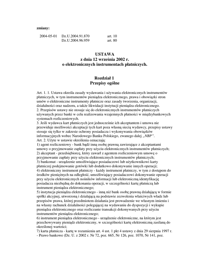 zmiany: 2004-05-01 Dz.U.2004.91.870 Dz.U.2004.96.959 art. 10 art. 80 USTAWA z dnia 12 września 2002 r. o elektronicznych instrumentach płatniczych. Rozdział 1 Przepisy ogólne Art. 1. 1. Ustawa określa zasady wydawania i używania elektronicznych instrumentów płatniczych, w tym instrumentów pieniądza elektronicznego, prawa i obowiązki stron umów o elektroniczne instrumenty płatnicze oraz zasady tworzenia, organizacji, działalności oraz nadzoru, a także likwidacji instytucji pieniądza elektronicznego. 2. Przepisów ustawy nie stosuje się do elektronicznych instrumentów płatniczych używanych przez banki w celu realizowania wzajemnych płatności w międzybankowych systemach rozliczeniowych. 3. Jeśli wydawca kart płatniczych jest jednocześnie ich akceptantem i umowa nie przewiduje możliwości akceptacji tych kart poza własną siecią wydawcy, przepisy ustawy stosuje się tylko w zakresie ochrony posiadacza i wykonywania obowiązków informacyjnych wobec Narodowego Banku Polskiego, zwanego dalej „NBP”. Art. 2. Użyte w ustawie określenia oznaczają: 1) agent rozliczeniowy - bank bądź inną osobę prawną zawierające z akceptantami umowy o przyjmowanie zapłaty przy użyciu elektronicznych instrumentów płatniczych; 2) akceptant - przedsiębiorcę, który zawarł z agentem rozliczeniowym umowę o przyjmowanie zapłaty przy użyciu elektronicznych instrumentów płatniczych; 3) bankomat - urządzenie umożliwiające posiadaczowi lub użytkownikowi karty płatniczej podejmowanie gotówki lub dodatkowo dokonywanie innych operacji; 4) elektroniczny instrument płatniczy - każdy instrument płatniczy, w tym z dostępem do środków pieniężnych na odległość, umożliwiający posiadaczowi dokonywanie operacji przy użyciu elektronicznych nośników informacji lub elektroniczną identyfikację posiadacza niezbędną do dokonania operacji, w szczególności kartę płatniczą lub instrument pieniądza elektronicznego; 5) instytucja pieniądza elektronicznego - inną niż bank osobę prawną działającą w formie spółki akcyjnej, utworzoną i działającą na podstawie zezwolenia właściwych władz lub przepisów prawa, której przedmiotem działania jest prowadzenie we własnym imieniu i na własny rachunek działalności polegającej na wydawaniu do dyspozycji i wykupie pieniądza elektronicznego oraz rozliczanie transakcji dokonywanych przy użyciu instrumentów pieniądza elektronicznego; 6) instrument pieniądza elektronicznego - urządzenie elektroniczne, na którym jest przechowywany pieniądz elektroniczny, w szczególności kartę elektroniczną zasilaną do określonej wartości; 7) karta płatnicza - kartę w rozumieniu art. 4 ust. 1 pkt 4 ustawy z dnia 29 sierpnia 1997 r. - Prawo bankowe (Dz. U. z 2002 r. Nr 72, poz. 665, Nr 126, poz. 1070, Nr 141, poz. 1178, Nr 144, poz. 1208, Nr 153, poz. 1271, Nr 169, poz. 1385 i 1387 i Nr 241, poz. 2074, z 2003 r. Nr 50, poz. 424, Nr 60, poz. 535, Nr 65, poz. 594, Nr 228, poz. 2260 i Nr 229, poz. 2276 oraz z 2004 r. Nr 64, poz. 594, Nr 68, poz. 623 i Nr 91, poz. 870), zwanej dalej „Prawem bankowym”; 8) kod identyfikacyjny - poufny numer, hasło lub inne oznaczenie posiadacza, które łącznie z danymi zawartymi na elektronicznym instrumencie płatniczym służą do elektronicznej identyfikacji posiadacza; 9) operacja - wypłatę gotówki, wydanie polecenia przelewu lub polecenia zapłaty albo dokonanie zapłaty przy użyciu elektronicznego instrumentu płatniczego; 10) pieniądz elektroniczny - pieniądz elektroniczny w rozumieniu art. 4 ust. 1 pkt 5 Prawa bankowego; 11) posiadacz - osobę fizyczną, osobę prawną lub inny podmiot, które na podstawie umowy o elektroniczny instrument płatniczy dokonują w swoim imieniu i na swoją rzecz operacji określonych w umowie; 12) użytkownik karty płatniczej - osobę fizyczną upoważnioną przez posiadacza do dokonywania w imieniu i na rzecz posiadacza operacji określonych w umowie, której dane identyfikacyjne są umieszczone na karcie płatniczej; 13) zestawienie operacji - wykaz operacji dokonanych przy użyciu elektronicznego instrumentu płatniczego w okresie rozliczeniowym, przyjętym przez wydawcę do rozliczenia z posiadaczem z tytułu dokonanych operacji oraz należnych wydawcy opłat i prowizji, udostępniany posiadaczowi po zakończeniu okresu rozliczeniowego; 14) krajowa instytucja pieniądza elektronicznego - instytucję pieniądza elektronicznego mającą siedzibę na terytorium Rzeczypospolitej Polskiej; 15) zagraniczna instytucja pieniądza elektronicznego - instytucję pieniądza elektronicznego mającą siedzibę za granicą; 16) oddział zagranicznej instytucji pieniądza elektronicznego - jednostkę organizacyjną zagranicznej instytucji pieniądza elektronicznego wykonującą w jej imieniu i na jej rzecz wszystkie lub niektóre rodzaje działalności wynikające z zezwolenia udzielonego tej instytucji, przy czym wszystkie jednostki organizacyjne danej zagranicznej instytucji pieniądza elektronicznego odpowiadające powyższym cechom, utworzone na terytorium Rzeczypospolitej Polskiej, uważa się za jeden oddział; 17) system autoryzacji i rozliczeń - podlegające prawu polskiemu prawne powiązania pomiędzy agentem rozliczeniowym, akceptantami i wydawcami elektronicznych instrumentów płatniczych, w ramach których określa się wspólne zasady przyjmowania zapłaty przy użyciu elektronicznych instrumentów płatniczych i rozliczeń z tego tytułu. Art. 3. 1. Umowę o elektroniczny instrument płatniczy pomiędzy wydawcą a posiadaczem zawiera się w formie pisemnej. Wymóg formy pisemnej nie dotyczy umowy o instrument pieniądza elektronicznego na okaziciela. 2. Umowa o elektroniczny instrument płatniczy powinna określać w szczególności: 1) strony umowy; 2) rodzaj udostępnianego elektronicznego instrumentu płatniczego i urządzeń, z których może korzystać posiadacz, dokonując operacji przy użyciu tego instrumentu; 3) rodza