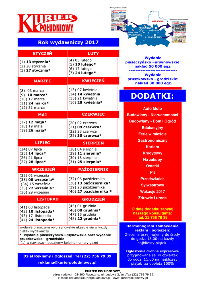 Rok wydawniczy 2017 STYCZEŃ LUTY (4) (5) (6) (7) (1) 13 stycznia* (2) 20 stycznia (3) 27 stycznia* 03 lutego 10 lutego* 17 lutego 24 lutego* KWIECIEŃ MARZEC (13) (14) (15) (16) (8) 03 marca (9) 10 marca* (10) 17 marca (11) 24 marca* (12) 31 marca CZERWIEC (17) 12 maja* (18) 19 maja (19) 26 maja* (20) (21) (22) (23) LIPIEC 02 czerwca 09 czerwca* 23 czerwca 30 czerwca* SIERPIEŃ 07 lipca 14 lipca* 21 lipca 28 lipca* (28) (29) (30) (31) WRZESIEŃ (32) 01 września (33) 08 września* (34) 15 września (35) 22 września* (36) 29 września 03 listopada 10 listopada* 17 listopada 24 listopada* 04 sierpnia 11 sierpnia* 18 sierpnia 25 sierpnia* PAŹDZIERNIK (37) (38) (39) (40) LISTOPAD (41) (42) (43) (44) DODATKI: Auto Moto MAJ (24) (25) (26) (27) 07 kwietnia 14 kwietnia 21 kwietnia 28 kwietnia* Wydanie piaseczyńsko –ursynowskie: nakład 50 000 egz. ----------------------------Wydanie pruszkowsko - grodziskie: nakład 30 000 egz. 06 października 13 października* 20 października 27 października * GRUDZIEŃ (45) (46) (47) (48) 01 grudnia 08 grudnia* 15 grudnia 22 grudnia* wydanie piaseczyńsko-ursynowskie ukazuje się w każdy piątek wydawniczy * wydanie piaseczyńsko-ursynowskie oraz wydanie pruszkowsko- grodziskie (1) w nawiasach podajemy kolejne numery gazet Budowlany - Nieruchomości Budowlany - Dom I Ogród Edukacyjny Ferie w mieście Gastronomiczny Kariera Kredytowy Na zakupy Ostatki Pit Przedszkolak Sylwestrowy Wakacje 2017 Zdrowie i uroda O datę dodatku zapytaj naszego konsultanta: tel. 22 756 79 39 Harmonogram zamawiania reklam i ogłoszeń: Zlecenia przyjmujemy do środy do godz. 18.00 na każdy najbliższy piątek. Ogłoszenia drobne expresowe Dział Reklamy i Ogłoszeń: Tel (22) 756 79 39 [email protected] przyjmowane są w czwartek do godz. 11.00 na najbliższy piątek za dopłatą 100% KURIER POŁUDNIOWY, adres redakcji: 05-500 Piaseczno, ul. Ludowa 2, tel./fax (22) 756 79 39, e-mail: [email protected], www.kurierpoludniowy.pl