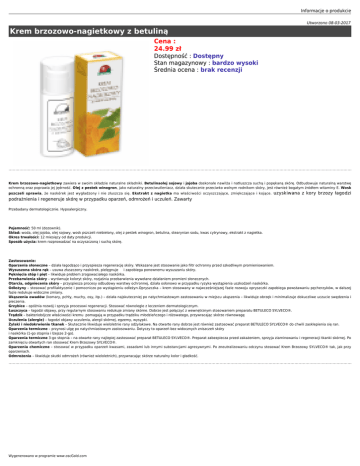 Informacje o produkcie Utworzono 08-03-2017 Krem brzozowo-nagietkowy z betuliną Cena : 24.99 zł Dostępność : Dostępny Stan magazynowy : bardzo wysoki Średnia ocena : brak recenzji Krem brzozowo-nagietkowy zawiera w swoim składzie naturalne składniki. Betulinaolej sojowy i jojoba doskonale nawilża i natłuszcza suchą i popękaną skórę. Odbudowuje naturalną warstwę ochronną oraz poprawia jej jędrność. Olej z pestek winogron, jako naturalny przeciwutleniacz, działa skutecznie przeciwko wolnym rodnikom skóry, jest również bogatym źródłem witaminy E. Wosk pszczeli sprawia, że naskórek jest wygładzony i nie złuszcza się. Ekstrakt z nagietka ma właściwości oczyszczające, zmiękczające i kojące. uzyskiwana z kory brzozy łagodzi podrażnienia i regeneruje skórę w przypadku oparzeń, odmrożeń i uczuleń. Zawarty Przebadany dermatologicznie. Hypoalergiczny. Pojemność: 50 ml (dozownik). Skład: woda, olej jojoba, olej sojowy, wosk pszczeli niebielony, olej z pestek winogron, betulina, stearynian sodu, kwas cytrynowy, ekstrakt z nagietka. Okres trwałości: 12 miesięcy od daty produkcji. Sposób użycia: krem rozprowadzać na oczyszczoną i suchą skórę. Zastosowanie: Oparzenia słoneczne – działa łagodząco i przyspiesza regenerację skóry. Wskazane jest stosowanie jako filtr ochronny przed szkodliwym promieniowaniem. Wysuszona skóra rąk – usuwa złuszczony naskórek, pielęgnuje i zapobiega ponownemu wysuszaniu skóry. Pęknięcia stóp i pięt – likwiduje problem zrogowaciałego naskórka. Przebarwienia skóry – wyrównuje koloryt skóry, rozjaśnia przebarwienia wywołane działaniem promieni słonecznych. Otarcia, odgniecenia skóry – przyspiesza procesy odbudowy warstwy ochronnej, działa osłonowo w przypadku ryzyka wystąpienia uszkodzeń naskórka. Odleżyny – stosować profilaktycznie i pomocniczo po wystąpieniu odleżyn.Opryszczka – krem stosowany w najwcześniejszej fazie rozwoju opryszczki zapobiega powstawaniu pęcherzyków, w dalszej fazie redukuje widoczne zmiany. Ukąszenia owadów (komary, pchły, muchy, osy, itp.) – działa najskuteczniej po natychmiastowym zastosowaniu w miejscu ukąszenia – likwiduje obrzęk i minimalizuje dokuczliwe uczucie swędzenia i pieczenia. Grzybice – opóźnia rozwój i sprzyja procesowi regeneracji. Stosować równolegle z leczeniem dermatologicznym. Łuszczyca – łagodzi objawy, przy regularnym stosowaniu redukuje zmiany skórne. Dobrze jest połączyć z wewnętrznym stosowaniem preparatu BETULECO SYLVECO®. Trądzik – bakteriobójcze właściwości kremu pomagają w przypadku trądziku młodzieńczego i różowatego, przywracając skórze równowagę Uczulenia (alergie) – łagodzi objawy uczulenia, alergii skórnej, egzemy, wysypki. Żylaki i niedokrwienie tkanek – Skutecznie likwiduje wieloletnie rany odżylakowe. Na otwarte rany dobrze jest również zastosować preparat BETULECO SYLVECO® do chwili zasklepienia się ran. Oparzenia termiczne – przynosi ulgę po natychmiastowym zastosowaniu. Dotyczy to oparzeń bez widocznych zniszczeń skóry i naskórka (1-go stopnia i lżejsze 2-go). Oparzenia termiczne 3-go stopnia – na otwarte rany najlepiej zastosować preparat BETULECO SYLVECO®. Preparat zabezpiecza przed zakażeniem, sprzyja ziarninowaniu i regeneracji tkanki skórnej. Po zamknięciu otwartych ran stosować Krem Brzozowy SYLVECO®. Oparzenia chemiczne – stosować w przypadku oparzeń kwasami, zasadami lub innymi substancjami agresywnymi. Po zneutralizowaniu odczynu stosować Krem Brzozowy SYLVECO® tak, jak przy oparzeniach. Odmrożenia – likwiduje skutki odmrożeń (również wieloletnich), przywracając skórze naturalny kolor i gładkość. Wygenerowano w programie www.oscGold.com