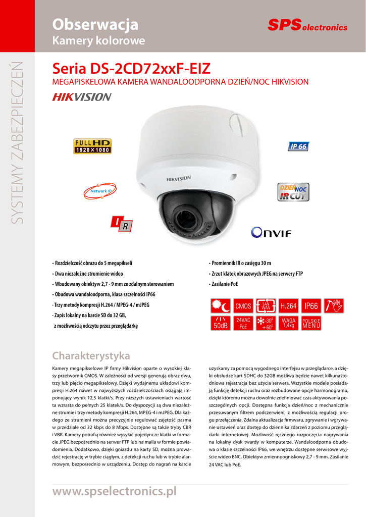 Obserwacja SYSTEMY ZABEZPIECZEŃ Kamery kolorowe Seria DS-2CD72xxF-EIZ MEGAPISKELOWA KAMERA WANDALOODPORNA DZIEŃ/NOC HIKVISION Network IP · Rozdzielczość obrazu do 5 megapikseli · Promiennik IR o zasięgu 30 m · Dwa niezależne strumienie wideo · Zrzut klatek obrazowych JPEG na serwery FTP · Wbudowany obiektyw 2,7 - 9 mm ze zdalnym sterowaniem · Zasilanie PoE · Obudowa wandaloodporna, klasa szczelności IP66 · Trzy metody kompresji H.264 / MPEG-4 / mJPEG · Zapis lokalny na karcie SD do 32 GB, z możliwością odczytu przez przeglądarkę Charakterystyka Kamery megapikselowe IP firmy Hikvision oparte o wysokiej klasy przetwornik CMOS. W zależności od wersji generują obraz dwu, trzy lub pięcio megapikselowy. Dzięki wydajnemu układowi kompresji H.264 nawet w najwyższych rozdzielczościach osiągają imponujący wynik 12,5 klatki/s. Przy niższych ustawieniach wartość ta wzrasta do pełnych 25 klatek/s. Do dyspozycji są dwa niezależne strumie i trzy metody kompresji H.264, MPEG-4 i mJPEG. Dla każdego ze strumieni można precyzyjnie regulować zajętość pasma w przedziale od 32 kbps do 8 Mbps. Dostępne są także tryby CBR i VBR. Kamery potrafią również wysyłać pojedyncze klatki w formacie JPEG bezpośrednio na serwer FTP lub na maila w formie powiadomienia. Dodatkowo, dzięki gniazdu na karty SD, można prowadzić rejestrację w trybie ciągłym, z detekcji ruchu lub w trybie alarmowym, bezpośrednio w urządzeniu. Dostęp do nagrań na karcie www.spselectronics.pl uzyskamy za pomocą wygodnego interfejsu w przeglądarce, a dzięki obsłudze kart SDHC do 32GB możliwa będzie nawet kilkunastodniowa rejestracja bez użycia serwera. Wszystkie modele posiadają funkcję detekcji ruchu oraz rozbudowane opcje harmonogramu, dzięki któremu można dowolnie zdefiniować czas aktywowania poszczególnych opcji. Dostępna funkcja dzień/noc z mechanicznie przesuwanym filtrem podczerwieni, z możliwością regulacji progu przełączenia. Zdalna aktualizacja firmwaru, zgrywanie i wgrywanie ustawień oraz dostęp do dziennika zdarzeń z poziomu przeglądarki internetowej. Możliwość ręcznego rozpoczęcia nagrywania na lokalny dysk twardy w komputerze. Wandaloodporna obudowa o klasie szczelności IP66, we wnętrzu dostępne serwisowe wyjście wideo BNC. Obiektyw zmiennoogniskowy 2,7 - 9 mm. Zasilanie 24 VAC lub PoE. MODEL DS-2CD7253F-EIZ DS-2CD7254F-EIZ DS-2CD7283F-EIZ Przetwornik 1/3” Progressive scan CMOS 1/2,5” Progressive scan CMOS 1/2,5” Progressive scan CMOS Liczba pikseli 1600 x 1200 (2MP) 2048 x 1536 (3MP) 2560 x 1920 (5MP) 0,5 / 0,0 lux (F1.2; 50 IRE) 0,6 / 0,0 lux (F1.2; 50 IRE) 0,6 / 0,0 lux (F1.2; 50 IRE) Minimalne oświetlenie (czułość) Stosunek sygnał/szum 50 dB Wbudowany obiektyw 2,7 - 9 mm F1.6, zdalne sterowanie Bilans bieli Automatyczny Funkcja AGC Automatyczna Odbicie lustrzane We wszystkich osiach Elektroniczna migawka 1/25 s do 1/20 000 s Sterowanie przysłoną Automatyczne DC Ustawienia obrazu Regulacja parametrów: Jasność, kontrast, nasycenie Wyostrzenie obrazu Tak, regulowane Funkcja Dzień/Noc Filtr przesuwany mechanicznie, wybór trybu, regulacja poziomu przełączenia Nazwa kamery Tak, 12 znaków Zasięg promiennika 30 m Długość fali 850 nm Detekcja ruchu 18 x 22 pola detekcji PAMETRY SIECIOWE Kompresja obrazu H.264 / MPEG4 / mJPEG Wielkość strumienia Rozdzielczość 32 kbps ~ 8 Mbps 1600 x 1200 2048 x 1536 Jakość obrazu Ilość klatek 6 poziomów, regulacja wielkości strumienia Główny: 12,5 fps (1600x1200); 12,5 fps (1600x912); 25fps (1280x960 i niższych) Pomocniczy: 25 fps (704x576 i niższych) Główny: 12,5fps (2048x1536); 25fps (1920x1080 i niższych) Pomocniczy: 25 fps (704x576 i niższych) Ilość jednoczesnych strumieni wideo Obsługa serwerów FTP 2560x1920 Główny: 6fps (2560x1920); 12,5fps (2048x1536); 25fps (1920x1080 i niższych) Pomocniczy: 25 fps (704x576 i niższych) 2 Tak, wygrywanie klatek obrazu JPEG w trybie cykliczym (max co 1s), z detekcji ruchu lub wejścia alarmowego) Metoda kompresji audio G.711 Obsługiwane protokoły TCP/IP,HTTP,DHCP,DNS,DDNS,RTP/RTSP, PPPoE, SMTP, NTP (SNMP,HTTPS,FTP, SIP, 802.1x, IPv6 opcjonalnie) Maksymalna ilość użytkowników 6 WEJŚCIA / WYJŚCIA Wyjście monitorowe Serwisowe wyjście wideo BNC Wejście karty SD Tak, obsługa SD/SDHC do 32GB Rejestracja ciągła, w harmonogramie, alarmowa, z detekcji ruchu Wejście sieciowe 10BASE-T/100BASE-TX (RJ45) POZOSTAŁE Temperatura pracy podczas rozruchu -10°C do +60°C, wilgotność <90% Temperatura pracy ciągłej -30°C do +60°C, wilgotność <90% Klasa szczelności IP66 Pobór mocy 24 VAC, 48 VDC PoE Średnio 3 W; max 6,5 W Średnio 3,6 W; max 6,5 W Wymiary (śr. x wys.) Waga Centrala - ul. Wał Miedzeszyński 630, 03-994 Warszawa; tel. 022 518 31 50, fax 022 518 31 70, e-mail: [email protected] BH Gdańsk - ul. Drożyny 6, 80-302 Gdańsk; tel. 058 624 83 04, fax 058 668 59 20, e-mail: [email protected] BH Katowice - ul. Kościuszki 227, 40-600 Katowice; tel. 032 255 64 27, fax 032 255 64 52, e-mail: [email protected] BH Poznań - ul. Polska 60, 60-595 Poznań; tel. 061 852 19 02, fax 061 825 09 03, e-mail: [email protected] BH Toruń - ul. Grudziądzka 176, 87-100 Toruń; tel. 056 653 99 43, fax 056 653 90 81, e-mail: [email protected] BH Wrocław - pl. Gen. Wróblewskiego 3a, 50-413 Wrocław; tel. 071 348 44 64, fax 071 348 36 35, e-mail: [email protected] 140 x 114 mm 1,4 kg Dystrybutor Zasilanie Średnio 3,6 W; max 6,5 W