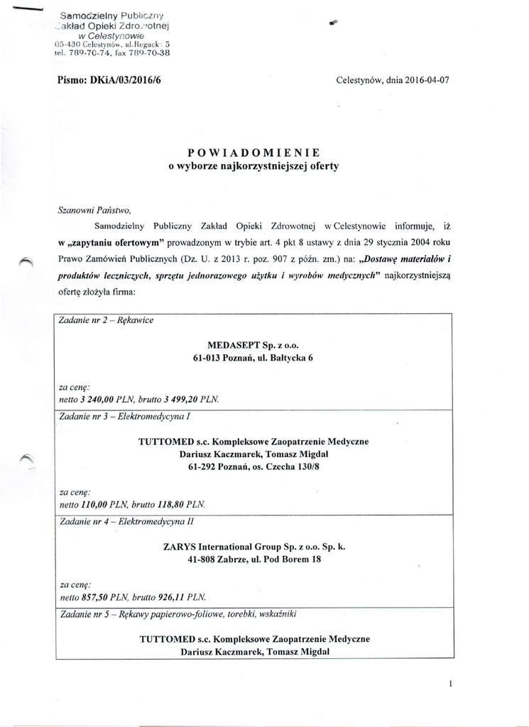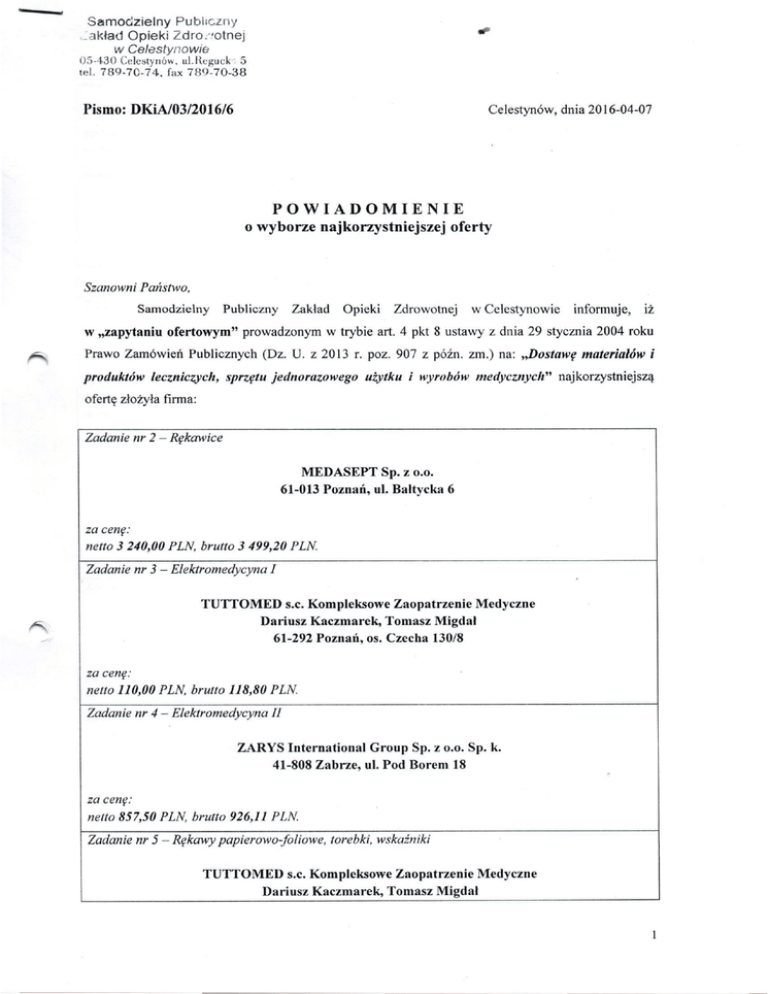 Samodzielny Publiczny -3kład Opieki Zdro. .'otnej w Celestynowie 05-430 (celestynów, ul.Reguck 5 tel. 789-70-74, fax 789-70-38 *** Pismo: DKiA/03/2016/6 Celestynów, dnia 2016-04-07 POWIADOMIENIE o wyborze najkorzystniejszej oferty Szanowni Państwo, Samodzielny Publiczny Zakład Opieki Zdrowotnej w Celestynowie informuje, iż w „zapytaniu ofertowym" prowadzonym w trybie art. 4 pkt 8 ustawy z dnia 29 stycznia 2004 roku Prawo Zamówień Publicznych (Dz. U . z 2013 r. poz. 907 z późn. zm.) na: „Dostawę materiałów i produktów leczniczych, sprzętu jednorazowego użytku i wyrobów medycznych" najkorzystniejszą ofertę złożyła firma: Zadanie nr 2 - Rękawice MEDASEPT Sp. z o.o. 61-013 Poznań, ul. Bałtycka 6 za cenę: netto 3 240,00 PLN, brutto 3 499,20 PLN. Zadanie nr 3 - Elektromedycyna I T U T T O M E D s.c. Kompleksowe Zaopatrzenie Medyczne Dariusz Kaczmarek, Tomasz Migdał 61-292 Poznań, os. Czecha 130/8 za cenę: netto 110,00 PLN, brutto 118,80 PLN. Zadanie nr 4 - Elektromedycyna II ZARYS International Group Sp. z o.o. Sp. k. 41-808 Zabrze, ul. Pod Borem 18 za cenę: netto 857,50 PLN brutto 926,11 PLN. Zadanie nr 5 - Rękawy papierowo-foliowe, torebki, wskaźniki T U T T O M E D s.c. Kompleksowe Zaopatrzenie Medyczne Dariusz Kaczmarek, Tomasz Migdał 1 61-292 Poznań, os, Czecha 130/8 za cenę: netto 1 328,00 PLN. brutto 1 434,24 PLN. Zadanie nr 6~ Pojemniki na odpady medyczne ZARYS International Group Sp. z o.o. Sp, k. 41-808 Zabrze, ul. Pod Borem 18 za cenę: netto 652,00 PLN, brutto 704,16 PLN. Zadanie nr 7 - Sprzęt z zakresu ginekologii POLMIL Sp. z 0.0. S.K.A. 85-758 Bydgoszcz, ul. Przemysłowa 8 za cenę: netto 1395,00 PLN. brutto 1 506,60 PLN. Zadanie nr 8- Drobny sprzęt jednorazowego użytku T U T T O M E D s.c. Kompleksowe Zaopatrzenie Medyczne Dariusz Kaczmarek, Tomasz Migdał 61-292 Poznań, os. Czecha 130/8 za cenę: netto 6 519,00 PLN, brutto 7 074,92 PLN. Zadanie nr 9 - Sprzęt jednorazowego użytku do badań mikrobiologicznych ZARYS International Group Sp. z o.o. Sp. k. 41-808 Zabrze, ul. Pod Borem 18 za cenę: netto 231,00 PLN, brutto 249,48 PLN. Zadanie nr 10- Materiały czystościowe T U T T O M E D s.c. Kompleksowe Zaopatrzenie Medyczne Dariusz Kaczmarek, Tomasz Migdał 61-292 Poznań, os. Czecha 130/8 za cenę: netto 4 588,50 PLN, brutto 5 547,81 PLN. Zadanie nr 11 - Kompresy gazowe, gaza mb, siatki do podtrzymywania opatrunków POLMIL Sp. z o.o. S.K.A. 85-758 Bydgoszcz, ul. Przemysłowa 8 za cenę: netto 1 053,00 PLN, brutto 1137,24 PLN. Zadanie nr 13 - Opaski, gaza jałowa, wata POLMIL Sp. z 0.0. S.K.A. 85-758 Bydgoszcz, ul. Przemysłowa 8 za cenę: netto 1 002,90 PLN, brutto 1 083,13 PLN. Zadanie nr 14- Dezynfekcja skóry, ran i błon śluzowych SCHULKE POLSKA Sp. z o.o. 01-793 Warszawa, ul. Rydygiera 8 za cenę: netto 470,00 PLN, brutto 507,60 PLN. Zadanie nr 15- Mycie, dezynfekcja i pielęgnacja skóry rąk SCHULKE POLSKA Sp. z o.o. 01-793 Warszawa, ul. Rydygiera 8 za cenę: netto 230,96 PLN, brutto 259,48 PLN. Zadanie nr 17 - Dezynfekcja powierzchni, sprzętów medycznych, miejsc trudno dostępnych T U T T O M E D FARMACJA Sp. z o.o. 61-292 Poznań, os. Czecha 130/8 za cenę: netto 935,00 PLN, brutto 1 009,80 PLN. Zadanie nr 18 - Chusteczki do dezynfekcji powierzchni TUTTOMED FARMACJA Sp. z o.o. 61-292 Poznań, os. Czecłia 130/8 za cenę: netto 56,00 PLN, brutto 60,48 PLN. Wybrano oferty najkorzystniejsze cenowo w poszczególnych pakietach, spełniające wszystkie warunki udziału w postępowaniu, kompletne i nie podlegające odrzuceniu. Umowa w sprawie zamówienia publicznego może być zawarta po dniu 08.04.2016 r. 3 I Zamawiający unieważnił postępowanie w poniższym zakresie: Zadanie nr Zadanie nr Zadanie nr Zadanie nr 1 - Leki; 12 - Plastry; 16 — Dezynfekcja endoskopów i narzędzi; 19 - Materiały stomatologiczne. W przedmiotowym postępowaniu w danych zadaniach nie wpłynęła żadna oferta. ZATWIERDZAM Lech Krasieńko \ SPZOZ w Ofiilitstynowie lek. m^h ^cAKrasieńko
