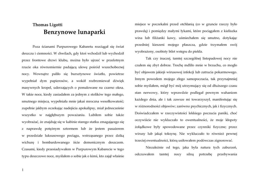 miejsce w poczekalni przed otchłanią (co w gruncie rzeczy było Thomas Ligotti Benzynowe lunaparki prawdą) i pomiędzy małymi łykami, które pociągałem z kieliszka wina lub filiżanki kawy, uśmiechałem się smutno, dotykając Poza ścianami Purpurowego Kabaretu rozciągał się świat deszczu i ciemności. W chwilach, gdy ktoś wchodził lub wychodził przez frontowe drzwi klubu, można było ujrzeć w przelotnym rzucie oka równomiernie padającą ulewę pośród wszechobecnej nocy. Wewnątrz paliło się bursztynowe światło, powietrze wypełniał dym papierosów, a wokół rozbrzmiewał dźwięk masywnych kropel, uderzających o pomalowane na czarno okna. W takie noce, kiedy zasiadałem za jednym z stolików tego małego, smutnego miejsca, wypełniała mnie jakaś mroczna wesołkowatość; zupełnie jakbym oczekując nadejścia apokalipsy, miał jednocześnie wszystko w najgłębszym poważaniu. Lubiłem sobie także wyobrażać, że znajduję się w kabinie starego statku zmagającego się z naprawdę potężnym sztormem lub że jestem pasażerem w przedziale luksusowego pociągu, wstrząsanego przez dziką wichurę i bombardowanego iście demonicznym deszczem. Czasami, kiedy przesiadywałem w Purpurowym Kabarecie w tego typu deszczowe noce, myślałem o sobie jak o kimś, kto zajął właśnie 1 przedniej kieszeni mojego płaszcza, gdzie trzymałem swój wyobrażony, osobisty bilet wstępu do piekła. Tak czy inaczej, tamtej szczególnej listopadowej nocy nie czułem się zbyt dobrze. Trochę mdliło mnie w brzuchu, co mogło być objawem jakiejś wirusowej infekcji lub zatrucia pokarmowego. Innym powodem mojego złego samopoczucia, tak przynajmniej sobie myślałem, mógł być mój utrzymujący się od dłuższego czasu stan nerwowy, który wprawdzie podlegał pewnym wahaniom każdego dnia, ale i tak zawsze mi towarzyszył, manifestując się w różnorodności objawów; zarówno psychicznych, jak i fizycznych. Doświadczałem w rzeczywistości lekkiego poczucia paniki, choć oczywiście nie wykluczało to ewentualności, że moje kłopoty żołądkowe były spowodowane przez czynniki fizyczne; przez wirusy lub jakąś toksynę. Nie wykluczało to również pewnej trzeciej ewentualności, którą usiłowałem podówczas zignorować. Niezależnie od tego, jaka była natura tych zaburzeń, odczuwałem tamtej nocy silną potrzebę przebywania w publicznym miejscu, aby w wypadku, gdym miał – czego często się obawiałem – stracić przytomność, ktoś się mną zajął lub chociaż odwiózł do szpitala. Jednocześnie nie szukałem żadnego bliższego kontaktu z kimkolwiek spośród osób znajdujących się w klubie. - Jestem zaskoczony, że się w ogóle tutaj pokazujesz. – odpowiedziałem. - Myślałem, że mógłbym spróbować jakoś dogadać się z naszą starą purpurową kobietą. I tak, popijając miętową herbatę i paląc łagodne papierosy, bez - Dogadać się? To jakoś nie w twoim stylu. żadnego poszanowania dla mojego niedomagającego żołądka, - Pomimo to, czy widziałeś ją może dzisiaj? byłbym najprawdopodobniej wyjątkowo kiepskim kompanem. Aby - Nie, nie widziałem. Poniżyłeś ją na tamtym spotkaniu. Nie dać temu jakiś wyraz, przyniosłem ze sobą swój notes, który leżał widziałem jej od tamtego czasu, nawet w jej własnym klubie. Nie teraz przede mną na stoliku, na znak tego, że chcę być zostawiony wiem, czy jesteś tego świadomy, ale ona nie jest kimś, w kim w spokoju, by móc skupić się na swoich sprawach literackich. chciałbyś mieć wroga. Niestety, kiedy Stuart Quisser wszedł do klubu, około godziny 22, widok mojej osoby, siedzącej w rogu z notesem, pijącej miętową herbatkę i palącej łagodne papierosy (co było jakimś groteskowym ukoronowaniem sytuacji z mdlącym żołądkiem), nie - Co masz na myśli? - To, że ma pewne powiązania; kontakty, o których absolutnie nic nie wiesz. - A Ty oczywiście wiesz o nich wszystko. Czytałem twoje zniechęcił go do przybliżenia się do stolika i zajęcia miejsca historie, dokładnie naprzeciw mnie. Podeszła do nas kelnerka. Quisser paranoikiem, więc w czym rzecz? zamówił jakieś białe wino, ja zaś poprosiłem o kolejną miętową herbatę. - Widzę, że przerzuciłeś się na miętowe herbatki? – powiedział Quisser, gdy dziewczyna nas zostawiła. jesteś, czego zresztą nie ukrywasz, kompletnym - Rzecz w tym, że zwykły uścisk dłoni może być czymś okropnym, a co dopiero taka jawna, upokarzająca zniewaga. - Musiałem trochę za dużo wypić, po prostu. - Nazwałeś ją oszukującym się beztalenciem. 2 Quisser spojrzał na kelnerkę, która podeszła z naszymi napojami czarną i złotą farbą wymalowano na połyskująco czerwonym tle i wykonał pospieszny gest, którym nakazał mi być cicho. Kiedy się różne znaki. Różnorakie wydarzenia odbywały się na tej scenie: oddaliła, powiedział: wieczorki poetyckie, tableaux vivants, przedstawienia różnych - Dowiedziałem się przypadkiem, że nasza kelnerka jest typów, teatrzyki marionetek, artystyczne prezentacje, występy bardzo lojalna wobec purpurowej kobiety. Prawdopodobnie powie muzyczne, i tak dalej. Tamtej nocy, a był to wtorek, na scenie było jej o mojej wizycie w klubie. Ciekawe, czy zechciałaby być ciemno. Nie zauważyłem na niej niczego nowego i zapytałem pośredniczką pomiędzy swoją szefową a mną i przekazać jej moje Quissera, o co mu chodzi. przeprosiny? - Nie wiem dokładnie, ale wydaje się, że coś z tym zrobiono. - Rozejrzyj się wokół – odparłem. Może to te czarne i złote ideogramy, czy cokolwiek to miało być. Quisser odstawił swój kieliszek wina i rozejrzał się po Całość wygląda jak okładka menu w chińskiej restauracji. pomieszczeniu. - Hmm… – powiedział, gdy skończył lustrować klub – To poważniejsze niż przypuszczałem. Zdjęła wszystkie swoje stare obrazy. A nowe prace w ogóle nie wyglądają jak jej. - Powtarzasz się. – powied