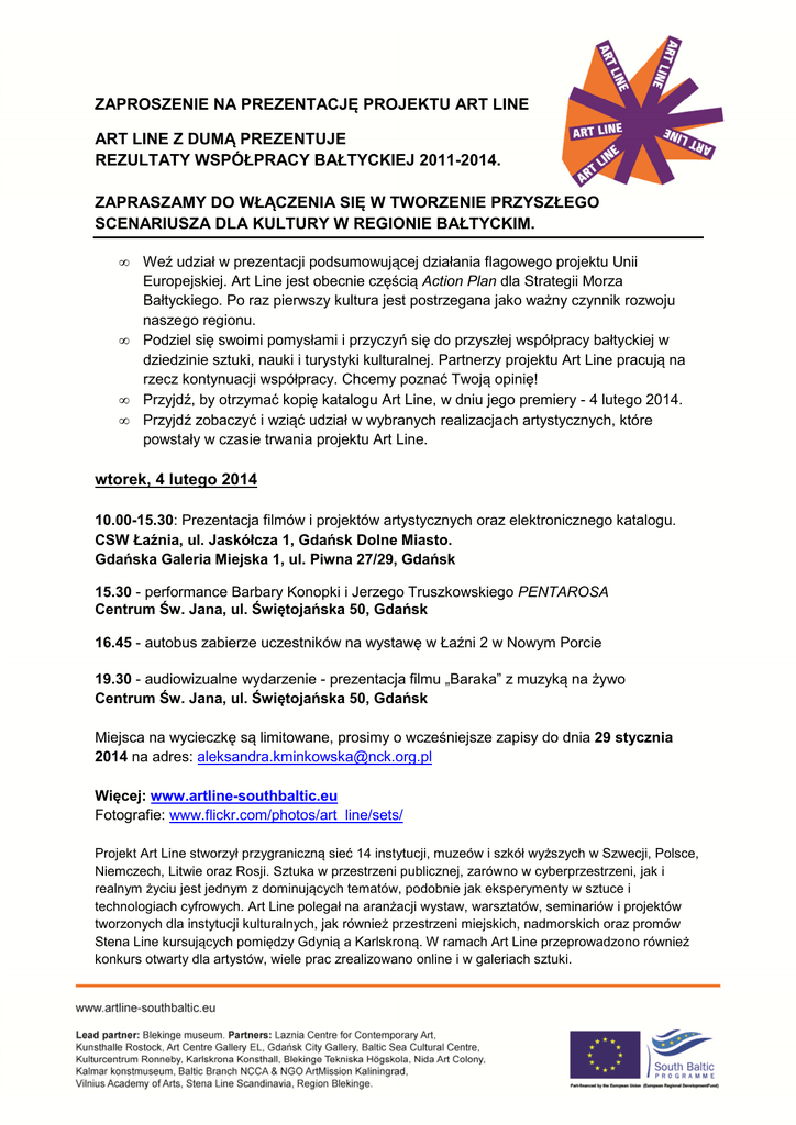 ZAPROSZENIE NA PREZENTACJĘ PROJEKTU ART LINE ART LINE Z DUMĄ PREZENTUJE REZULTATY WSPÓŁPRACY BAŁTYCKIEJ 2011-2014. ZAPRASZAMY DO WŁĄCZENIA SIĘ W TWORZENIE PRZYSZŁEGO SCENARIUSZA DLA KULTURY W REGIONIE BAŁTYCKIM. • • • • Weź udział w prezentacji podsumowującej działania flagowego projektu Unii Europejskiej. Art Line jest obecnie częścią Action Plan dla Strategii Morza Bałtyckiego. Po raz pierwszy kultura jest postrzegana jako ważny czynnik rozwoju naszego regionu. Podziel się swoimi pomysłami i przyczyń się do przyszłej współpracy bałtyckiej w dziedzinie sztuki, nauki i turystyki kulturalnej. Partnerzy projektu Art Line pracują na rzecz kontynuacji współpracy. Chcemy poznać Twoją opinię! Przyjdź, by otrzymać kopię katalogu Art Line, w dniu jego premiery - 4 lutego 2014. Przyjdź zobaczyć i wziąć udział w wybranych realizacjach artystycznych, które powstały w czasie trwania projektu Art Line. wtorek, 4 lutego 2014 10.00-15.30: Prezentacja filmów i projektów artystycznych oraz elektronicznego katalogu. CSW Łaźnia, ul. Jaskółcza 1, Gdańsk Dolne Miasto. Gdańska Galeria Miejska 1, ul. Piwna 27/29, Gdańsk 15.30 - performance Barbary Konopki i Jerzego Truszkowskiego PENTAROSA Centrum Św. Jana, ul. Świętojańska 50, Gdańsk 16.45 - autobus zabierze uczestników na wystawę w Łaźni 2 w Nowym Porcie 19.30 - audiowizualne wydarzenie - prezentacja filmu „Baraka” z muzyką na żywo Centrum Św. Jana, ul. Świętojańska 50, Gdańsk Miejsca na wycieczkę są limitowane, prosimy o wcześniejsze zapisy do dnia 29 stycznia 2014 na adres: [email protected] Więcej: www.artline-southbaltic.eu Fotografie: www.flickr.com/photos/art_line/sets/ Projekt Art Line stworzył przygraniczną sieć 14 instytucji, muzeów i szkół wyższych w Szwecji, Polsce, Niemczech, Litwie oraz Rosji. Sztuka w przestrzeni publicznej, zarówno w cyberprzestrzeni, jak i realnym życiu jest jednym z dominujących tematów, podobnie jak eksperymenty w sztuce i technologiach cyfrowych. Art Line polegał na aranżacji wystaw, warsztatów, seminariów i projektów tworzonych dla instytucji kulturalnych, jak również przestrzeni miejskich, nadmorskich oraz promów Stena Line kursujących pomiędzy Gdynią a Karlskroną. W ramach Art Line przeprowadzono również konkurs otwarty dla artystów, wiele prac zrealizowano online i w galeriach sztuki. PROGRAM KONFERENCJI ART LINE Wtorek, 4 lutego 2014 CSW Łaźnia, ul. Jaskółcza 1, Gdańsk 10.00-10.30: Rejestracja uczestników 10.30-11.00: Oficjalne powitanie 11.00-11.20: Torun Ekstrand - prezentacja projektu Art Line 11.20-11.40: Mateusz Pęk, Klaudia Wrzask – prezentacja katalogu online 11.40-12.00: Spotkanie dla prasy 12.00-12.20: Prezentacja projektów artystycznych w przestrzeni CSW Łaźnia 12.30-14.00: Lunch /restauracja Malinowy Ogród/ 14.00-15.30: Wizyta w gdańskich galeriach: Gdańska Galeria Miejska 2, Gdańska Galeria Miejska 1 (prezentacja projektu “Baltic Sounds Good”), Gdańska Galeria Güntera Grassa Centrum św. Jana, ul. Świętojańska 50, Gdańsk 15.30-16.15: Performance “PENTAROSA” Barbara Konopka - moRgan: skrzypce, altówka, fortepian, vocal, wizualizacje; Jerzy Truszkowski - Max Hexer:6 strunowy bas, vocal; Weronika Kami - Verikami: inżynier sceny, v-j, live transmission 16.15-16.45: zwiedzanie kościoła św. Jana – Iwona Bernt Łaźnia 2, Gdańsk – Nowy Port, ul. Strajku Dokerów 5 (przejazd zorganizowany) 17.00-17.40: zwiedzanie wystawy „9000 km” 18.00- 19.30: Kolacja /Mestwin/ Centrum św. Jana, ul. Świętojańska 50, Gdańsk 19.30-21.00: pokaz filmu “Baraka” /reż. R. Fricke, USA, 1992, 96 min/ z muzyką na żywo: Paweł Nowicki - wibrafon, perkusjonalia, syntezator; Jacek Buhl - perkusja; Wojciech Jachna - trąbka, elektronika; Marcin Dymiter - elektronika 21.00 – poczęstunek dla uczestników projektu w Jadalni pod Zielonym Smokiem, Gdańsk, ul. Szeroka 125.