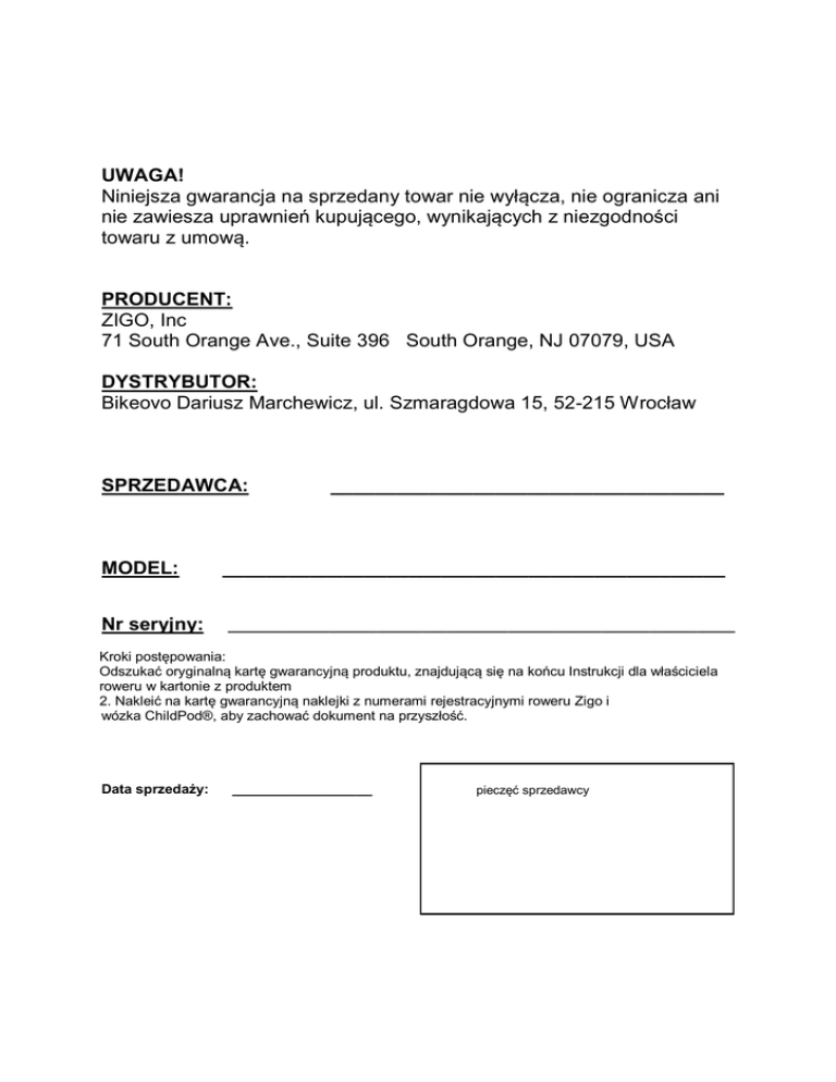 UWAGA! Niniejsza gwarancja na sprzedany towar nie wyłącza, nie ogranicza ani nie zawiesza uprawnień kupującego, wynikających z niezgodności towaru z umową. PRODUCENT: ZIGO, Inc 71 South Orange Ave., Suite 396 South Orange, NJ 07079, USA DYSTRYBUTOR: Bikeovo Dariusz Marchewicz, ul. Szmaragdowa 15, 52-215 Wrocław SPRZEDAWCA: MODEL: Nr seryjny: ____________________________________ ______________________________________________ _________________________________________________________________ Kroki postępowania: Odszukać oryginalną kartę gwarancyjną produktu, znajdującą się na końcu Instrukcji dla właściciela roweru w kartonie z produktem 2. Nakleić na kartę gwarancyjną naklejki z numerami rejestracyjnymi roweru Zigo i wózka ChildPod®, aby zachować dokument na przyszłość. Data sprzedaży: __________________ pieczęć sprzedawcy
