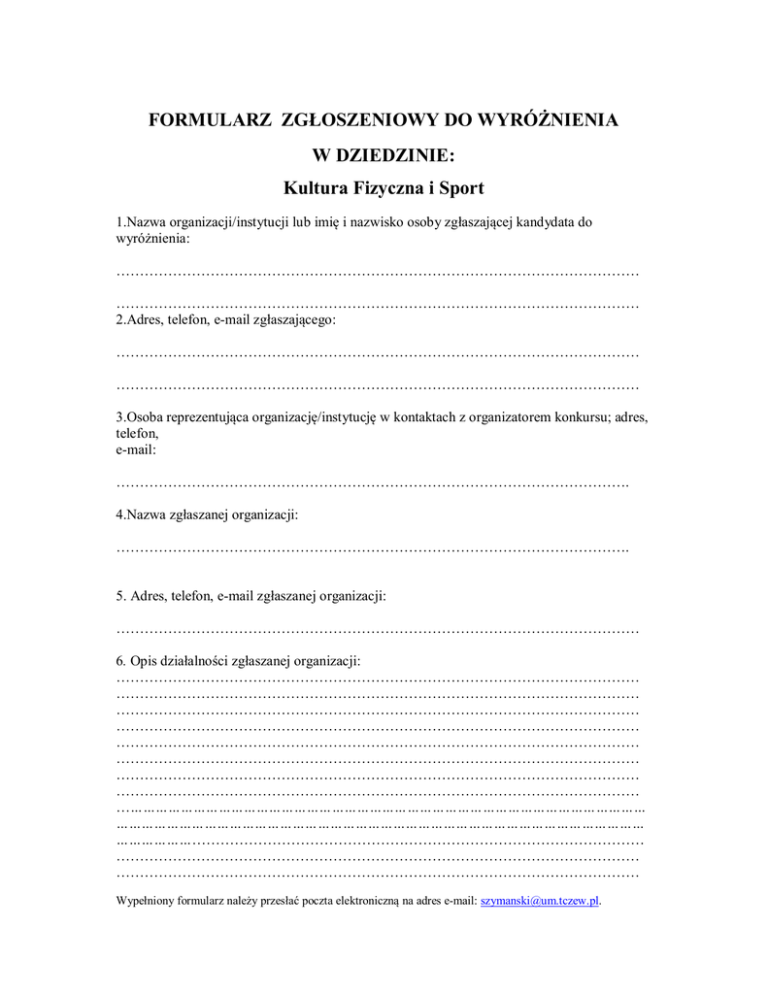 FORMULARZ ZGŁOSZENIOWY DO WYRÓŻNIENIA W DZIEDZINIE: Kultura Fizyczna i Sport 1.Nazwa organizacji/instytucji lub imię i nazwisko osoby zgłaszającej kandydata do wyróżnienia: ………………………………………………………………………………………………… ………………………………………………………………………………………………… 2.Adres, telefon, e-mail zgłaszającego: ………………………………………………………………………………………………… ………………………………………………………………………………………………… 3.Osoba reprezentująca organizację/instytucję w kontaktach z organizatorem konkursu; adres, telefon, e-mail: ………………………………………………………………………………………………. 4.Nazwa zgłaszanej organizacji: ………………………………………………………………………………………………. 5. Adres, telefon, e-mail zgłaszanej organizacji: ………………………………………………………………………………………………… 6. Opis działalności zgłaszanej organizacji: ………………………………………………………………………………………………… ………………………………………………………………………………………………… ………………………………………………………………………………………………… ………………………………………………………………………………………………… ………………………………………………………………………………………………… ………………………………………………………………………………………………… ………………………………………………………………………………………………… ………………………………………………………………………………………………… ……………………………………………………………………………………………………………… ……………………………………………………………………………………………………………… …………………………………………………………………………………………………… ………………………………………………………………………………………………… ………………………………………………………………………………………………… Wypełniony formularz należy przesłać poczta elektroniczną na adres e-mail: [email protected].