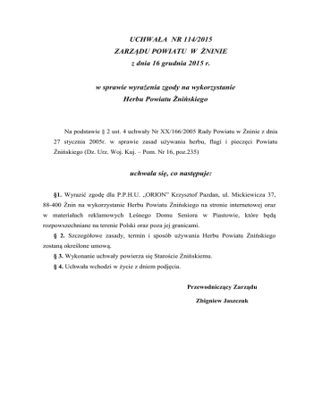 UCHWAŁA NR 114/2015 ZARZĄDU POWIATU W ŻNINIE z dnia 16 grudnia 2015 r. w sprawie wyrażenia zgody na wykorzystanie Herbu Powiatu Żnińskiego Na podstawie § 2 ust. 4 uchwały Nr XX/166/2005 Rady Powiatu w Żninie z dnia 27 stycznia 2005r. w sprawie zasad używania herbu, flagi i pieczęci Powiatu Żnińskiego (Dz. Urz. Woj. Kuj. – Pom. Nr 16, poz.235) uchwala się, co następuje: §1. Wyrazić zgodę dla P.P.H.U. „ORION” Krzysztof Pazdan, ul. Mickiewicza 37, 88-400 Żnin na wykorzystanie Herbu Powiatu Żnińskiego na stronie internetowej oraz w materiałach reklamowych Leśnego Domu Seniora w Piastowie, które będą rozpowszechniane na terenie Polski oraz poza jej granicami. § 2. Szczegółowe zasady, termin i sposób używania Herbu Powiatu Żnińskiego zostaną określone umową. § 3. Wykonanie uchwały powierza się Staroście Żnińskiemu. § 4. Uchwała wchodzi w życie z dniem podjęcia. Przewodniczący Zarządu Zbigniew Jaszczuk Uzasadnienie Zarząd Powiatu w Żninie wyraża zgodę dla P.P.H.U. „ORION” Krzysztof Pazdan na wykorzystanie Herbu Powiatu Żnińskiego na stronie internetowej oraz w materiałach reklamowych Leśnego Domu Seniora w Piastowie, które będą rozpowszechniane na terenie Polski oraz poza jej granicami. Dzięki prowadzonym działaniom nastąpi promocja obiektu, ale także Powiatu Żnińskiego i Pałuk, jako regionu atrakcyjnego do wypoczynku i spędzania wolnego czasu przez seniorów. Podjęta inicjatywa jest cennym wsparciem dla osób starszych i ich rodzin. Jednocześnie powstanie domu, w którym prowadzona będzie opieka dla osób starszych, przyczyni się do stworzenia nowych miejsc pracy w regionie. Biorąc powyższe pod uwagę podjęcie uchwały jest uzasadnione i zgodne z przyjętą procedurą używania Herbu Powiatu Żnińskiego. J.O./A.M. Przewodniczący Zarządu Zbigniew Jaszczuk