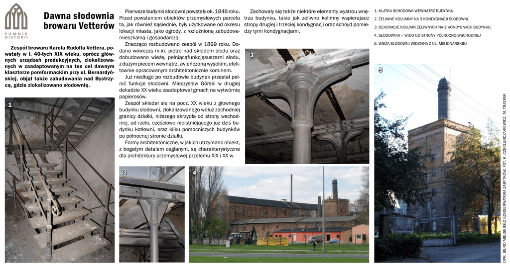Zespół browaru Karola Rudolfa Vettera, powstały w l. 40-tych XIX wieku, oprócz głównych urządzeń produkcyjnych, zlokalizowanych w zaadaptowanym na ten cel dawnym klasztorze poreformackim przy ul. Bernardyńskiej, objął także zabudowania nad Bystrzycą, gdzie zlokalizowano słodownię. 1 2 4 1. klatka schodowa wewnątrz budynku. 2. żeliwne kolumny na 3 kondygnacji słodowni. 3. dekoracje kolumn żeliwnych na 2 kondygnacji budynku. 4. Słodownia – wido od strony północno-wschodniej 5. Wieża slodowni widziana z ul. misjonarskiej 5 OPR. BIURO MIEJSKIEGO KONSERWATORA ZABYTKÓW, fot. k. czerlunczakiewicz, M. Trzewik Dawna słodownia browaru Vetterów Pierwsze budynki słodowni powstały ok. 1846 roku. Zachowały się także niektóre elementy wystrou wnęPrzed powstaniem obiektów przemysłowych parcela trza budynku, takie jak zeliwne kolimny wspierajace ta, jak również sąsiednie, były użytkowane od okresu stropy drugiej i trzeciej kondygnacji oraz schoyd pomielokacji miasta, jako ogrody, z rozluźnioną zabudowa- dzy tymi kondygnacjami. mieszkalną i gospodarczą. Znacząco rozbudowano zespół w 1899 roku. Dodano wówczas m.in. piętro nad składem słodu oraz 3 dobudowano wieżę, pełniącąfunkcjęsuszarni słodu, z dużym piecem wewnątrz, zwieńczoną wysokim, efektownie opracowanym architektonicznie kominem. Już niedługo po rozbudowie budynek przestał pełnić funkcje słodowni. Mieczysław Górski w drugiej dekadzie XX wieku zaadaptował gmach na wytwórnię papierosów. Zespół składał się na pocz. XX wieku z głownego budynku słodowni, zlokalizowanego wdłuż zachodniej granicy działki, niższego skrzydła od strony wschodniej, od rzeki, częściowo nieistniejącego już dziś budynku kotłowni, oraz kilku pomocniczych budynków po północnej stronie działki. Formy architektoniczne, w jakich utrzymano obiekt, z bogatym detalem ceglanym, są charakterystyczne dla architektury przemysłowej przełomu XIX i XX w.