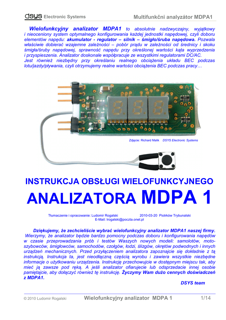 Electronic Systems Multifunkčni analyzátor MDPA1 Wielofunkcyjny analizator MDPA1 to absolutnie nadzwyczajny, wyjątkowy i nieoceniony system optymalnego konfigurowania kaŜdej jednostki napędowej, czyli doboru elementów napędu: akumulator - regulator – silnik – śmigło/śruba napędowa. Pozwala właściwie dobierać wzajemne zaleŜności – pobór prądu w zaleŜności od średnicy i skoku śmigła/śruby napędowej, sprawność napędu przy określonej wartości kąta wyprzedzenia i przyspieszenia. Analizator doskonale współpracuje ze wszystkimi regulatorami DC/AC. Jest równieŜ niezbędny przy określaniu realnego obciąŜenia układu BEC podczas lotu/jazdy/pływania, czyli otrzymujemy realne wartości obciąŜenia BEC podczas pracy… Zdjęcie: Richard Malik DSYS Electronic Systems INSTRUKCJA OBSŁUGI WIELOFUNKCYJNEGO ANALIZATORA MDPA 1 Tłumaczenie i opracowanie: Ludomir Rogalski 2010-03-20 Piotrków Trybunalski E-Mail: [email protected] Dziękujemy, Ŝe zechcieliście wybrać wielofunkcyjny analizator MDPA1 naszej firmy. Wierzymy, Ŝe analizator będzie bardzo pomocny podczas doboru i konfigurowania napędów w czasie przeprowadzania prób i testów Waszych nowych modeli: samolotów, motoszybowców, śmigłowców, samochodów, czołgów, łodzi, ślizgów, okrętów podwodnych i innych urządzeń mechanicznych. Przed przyłączeniem analizatora zapoznajcie się dokładnie z tą instrukcją. Instrukcja ta, jest nieodłączną częścią wyrobu i zawiera wszystkie niezbędne informacje o uŜytkowaniu urządzenia. Instrukcję przechowujcie w dostępnym miejscu tak, aby mieć ją zawsze pod ręką. A jeśli analizator ofiarujecie lub odsprzedacie innej osobie pamiętajcie, aby dołączyć równieŜ tę instrukcję. śyczymy Wam duŜo cennych doświadczeń z MDPA1. DSYS team © 2010 Ludomir Rogalski Wielofunkcyjny analizator MDPA 1 1/14 Electronic Systems Multifunkčni analyzátor MDPA1 Zgadywać … o nie, lepiej wiedzieć to dokładnie! Analizator monitoruje: ● Napięcie akumulatora lub BEC ● Napięcie na jedno ogniwo akumulatora ● Pobór prądu (silnika napędowego, serwomechanizmów, oświetlenia modelu itp.) ● Moc pobieraną przez silnik napędowy i inne urządzenia zainstalowane w modelu ● Temperaturę (regulatora, akumulatora, silnika) ● Obroty silnika napędowego ● Szerokość impulsów pojedynczych kanałów odbiornika RC ● Czas pracy Analizator MDPA1 współpracuje ze wszystkimi regulatorami „AC” i „DC” róŜnych producentów. Podstawowe cechy analizatora to: funkcjonalność, wysoka jakość, niezawodność, niewielka masa, małe gabaryty i niski pobór prądu! OPIS ANALIZATORA Analizator umoŜliwia monitorowanie napięcia – U, prądu – I, mocy pobranej – P, temperatury – t, obrotów – n, szerokość impulsów sterujących – L i czasu pracy – o (regulatorów, akumulatorów, silników elektrycznych, serwomechanizmów, pomp wodnych, urządzeń hydraulicznych, syren, oświetlenia pokładowego i innych urządzeń elektrycznych zainstalowanych w Waszych modelach). Aktualne wartości monitorowanych parametrów przedstawiane są na jasnym i czytelnym (nawet z duŜej odległości) wyświetlaczu LED. Wielofunkcyjny analizator MDPA1 to absolutnie nadzwyczajny, wyjątkowy i nieoceniony system optymalnego konfigurowania kaŜdej jednostki napędowej, czyli doboru elementów napędu: akumulator - regulator – silnik – śmigło/śruba napędowa. Pozwala właściwie dobierać wzajemne zaleŜności – pobór prądu w zaleŜności od średnicy i skoku śmigła/śruby napędowej, sprawność napędu przy określonej wartości kąta wyprzedzenia… Analizator wspaniale współpracuje ze wszystkimi regulatorami DC/AC. Jest równieŜ niezbędny przy określaniu realnego obciąŜenia układu BEC podczas lotu/jazdy/pływania, czyli otrzymujemy realne wartości obciąŜenia BEC podczas pracy… Wszystkie wartości monitorowanych parametrów zapisywane są w pamięci. Wartości minimalne i maksymalne zostają zachowane w pamięci równieŜ po odłączeniu zasilania. MoŜliwości te, to absolutnie nowy wymiar optymalizacji i regulacji napędu Waszego modelu w terenie! Niewielkie gabaryty (41x19x7mm), mała masa (5gram) i minimalny pobór prądu (4-12mA) na pewno będą dodatkowymi atutami, które pomogą w podjęciu decyzji o zakupie ANALIZATORA MDPA1. Aby zapewnić właściwe funkcjonowanie urządzenia oraz zagwarantować bezpieczne uŜytkowanie konieczne jest dokładne zapoznanie się z instrukcją obsługi wielofunkcyjnego analizatora MDPA1 INSTALOWANIE ANALIZATORA ■ Monitorowanie akumulatorów napędowych, silnika, regulatora - wykonajcie instalację wg schematu 1a lub 1b (patrz strona 3 i 4). ■ Monitorowanie układu BEC lub akumulatora zasilającego odbiornik RC – analizator naleŜy przyłączyć wg schematu 2a lub 2b (patrz strona 4 i 5). JeŜeli podczas monitorowania dojdzie do ograniczenia prądu (wskazanie na wyświetlaczu będzie migało a wraz ze wzrostem prądu juŜ się nie zmieni) to naleŜy zmniejszyć długość przewodu pomiarowego – punkty A – B (patrz schemat 1a i 1b). Stosujcie tylko przewody znajdujące się w zestawie. ■ Monitorowanie szerokości impulsów opisane zostało na stronie 5 (schemat 3). © 2010 Ludomir Rogalski Wielofunkcyjny analizator MDPA 1 2/14 Electronic Systems Multifunkčni analyzátor MDPA1 ■ Monitorowanie temperatury, analizator przyłączamy wg schematu 1a, 1b, 2a 2b lub 3. Czujnik temperatury naleŜy dokładnie zamocować do płaszcza silnika, regulatora lub akumulatora. NaleŜy zapewnić dobrą przewodność cieplną między czujnikiem a powierzchnią, na której dokonywany będzie pomiar temperatury (zalecamy silikonową pastę termoprzewodzącą). Wtyczkę (TEMP) czujnika temperatury naleŜy podpiąć do gniazdka analizatora (patrz schematy 1a i 1b) przed podłączeniem zasilania, poniewaŜ tylko wtedy przedstawiona będzie równieŜ wartość temperatury minimalnej. Pamiętajcie o prze