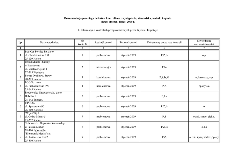 Dokumentacja przebiegu i efektów kontroli oraz wystąpienia, stanowiska, wnioski i opinie. okres: styczeń- lipiec 2009 r. 1. Informacja o kontrolach przeprowadzonych przez Wydział Inspekcji: Lp. 1 1 2 3 4 5 6 7 8 9 Nazwa podmiotu 2 Bus-Car Service Sp. z o.o. ul. Chodkiewicza 151 25-139 Kielce Urząd Miasta i Gminy w Wąchocku ul. Wielkowiejska 1 27-215 Wąchock Ferma Drobiu w. Stawy 28-313 Imielno PGO Sp. z o.o. ul. Piekoszowska 390 25-645 Kielce Środowisko i Inowacje Sp. z o.o. Dobrów 8 28-142 Tuczepy P.P.H.U. ul. Spacerowa 90 26-200 Końskie "Wijas" Sp.J. ul. Cedro-Mazur 5 25-252 Kielce Składowisko Odpadów Komunalnych w Potoku Małym 28-300 Jędrezejów "Elektronik Media" s.c. ul. Kościuszki 18/22 25-310 Kielce Rodzaj kontroli Termin kontroli Dokumenty dotyczące kontroli 4 5 6 Stwierdzone nieprawidłowości 7 1 problemowa styczeń 2009 P,Z,Is o,p 2 interwencyjna styczeń 2009 P,In 3 komleksowa styczeń 2009 P,Z,Is,M o,ś,nawozy,w,p 4 komleksowa styczeń 2009 P,Z opłaty,ś,o 5 problemowa styczeń 2009 P,Irz 6 problemowa styczeń 2009 P,Z,Is o 7 problemowa styczeń 2009 P,Z o,zuż. sprzęt elektr. 8 problemowa styczeń 2009 P,Z,Is o,h,ś 9 problemowa styczeń 2009 P,Z, o,zuż. sprzęt elektr.,opłaty Nr kontroli 3 10 11 12 13 14 15 16 17 18 19 20 "VICTOR" Handel-Usługi-Transport Kranów 8b 26-021 Daleszyce P.W. "MARKUR" Ubojnia Drobiu Chełmce 96 26-067 Strawczyn Składowisko Odpadów w Przededworzu Zakład Usług Komunalnych w Chmielniku Zrecze Duże 1a 26-020 Chmielnik "AUTO NAPRAWA" Andruszowice 50 27-650 Samborzec Zakład Gospodarki Komunalnej Ruda Maleniecka 99 26-242 Ruda Maleniecka F.H.U. "EURO-AGD" ul. Domaniówka 1D 25-413 Kielce P.H.U. "Eko-Auto" Import-Export ul. Warszawska 78 26-130 Suchedniów Ubojnie Drobiu Bogumiła Salandra Stanisław Saladra Sp. J. Przyjmo 22 26-085 Miedziana Góra Eco Recykling Solax P.P.H.U. Zwierzyniec 46 28-100 Busko Zdrój Nordkalk Sp. z o.o. Zakład Wolica 26-060 Wolica Sędziszowskie Przedsiębiorstwo Energetyki Cieplnej Sp. z o.o. ul. Przemysłowa 9b 28-340 Sędziszów 10 komleksowa styczeń 2009 P,Is,In ś 11 interwencyjna styczeń 2009 P,Z,M,Irz o,ś 12 problemowa styczeń 2009 P,Z,W o,ś 13 komleksowa styczeń 2009 P,Z,Irz,Is,In o,p 14 komleksowa styczeń 2009 P,Z,W,M o 15 problemowa styczeń 2009 P,Z o,zuż. sprzęt elektr. 16 komleksowa styczeń 2009 P,Z,In,M o,p,opłaty 17 interwencyjna styczeń 2009 P,Z,Is,M o 18 problemowa styczeń 2009 N o 19 odbiór inwestycji styczeń 2009 P,In 20 problemowa styczeń 2009 P,WER. 21 22 23 24 25 26 27 28 29 30 Produkcja Wędlin i Wyrobów Wędlinniarskich ul. Ogrowa 1 28-230 Połaniec Przedsiębiorstwo Gospodarki Komunalnej Sp. z o.o. w Połańcu ul. Krakowska 11 28-230 Połaniec Zakład Energetyki Cieplnej w Końskich ul. Armii Krajowej 5 26-200 Końskie "DROMECH" Sp.J. ul. Bałtowska 428 27-400 Ostrowiec Św. P.W. "BUDMEX" Dębowa Wola Stara 25 B 27-400 Ostrowiec Św. Zakład Przetwórstwa Mięsnego Ryszard Hochel Zakład Pracy Chronionej ul. Częstochowska 6 Micigózd 26-065 Piekoszów Składowisko Odpadów Komunalnych w Grabowcu Zakład Gospodarki Komunalnej w Osieku ul. Rynek 1 28-221 Osiek EKO-BIOMASA Sp. z o.o. Biechów 27 28-133 Pacanów PGKiM Spółka Gminy z o.o. ul. Wojska Polskiego 3 28-200 Staszów Ferma Drobiu Dorota i Maciej Bendkowscy Jeżowice 1 29-100 Włoszczowa 21 problemowa styczeń 2009 P,Z,Is,M o,opłaty,w,p,opak 22 problemowa styczeń/luty 2009 P,W,Is,M ś,o 23 problemowa styczeń/luty 2009 P,WER. 24 problemowa styczeń/luty 2009 P,Z,M 25 problemowa styczeń 2009 P,Irz 26 problemowa styczeń 2009 P,W,In ś 27 komleksowa styczeń 2009 P,Z,M w 28 komleksowa luty 2009 P,Z,Is,M o,opłata,p 29 komleksowa luty 2009 P,Z,W,M o,opłaty,w 30 komleksowa luty 2009 P,Z,M o,w o,p 31 32 33 34 35 36 37 38 39 40 41 42 Stacja Paliw "MARGAZ" Osiecka 15 28-230 Połaniec P.W ."JB" Krystyna Brzezowska ul. Sitkówka 4 26-060 Chęciny "RAN-FLEX" Sp. zo.o ul. Głogowa 13 25-346 Kielce STOLBUD Włoszczowa S.A. ul. Jędrzejowska 74 29-100 Włoszczowa MPEC Sp. z o.o. ul. Mielczarskiego 139/143 25-611 "MASTER-FOTO" Grzegorz Bera ul. Sienkiewicza 16 25-333 Kielce P.P.U. "DAREX" Dariusz Skulski ul. Wąska 7B 26-200 Końskie DREWEX-MEBLE Sp. zo.o. Mójcza 29a 26-024 Suków "MA" Mójcza 29 a 26-024 Suków Centrum Muzyczna VANAX Sp.J. ul.Dębowa 7/9 25-539 Kielce R.R.Donnelley Starachowice Sp. z o.o. ul. Bema 2c 27-200 Starachowice Ferma Drobiu Michał Rek Gołochów 78 28-404 Kije 31 odbiór inwestycji luty 2009 P,In o,w 32 problemowa luty 2009 P,Z,Irz,Ioś,M o,TPO,demontaż 33 problemowa luty 2009 N 34 problemowa luty 2009 P,WER. 35 problemowa luty 2009 P 36 problemowa luty 2009 P,Z,Irz 37 problemowa luty 2009 P 38 interwencyjna luty 2009 P,W,In,M p,o 39 interwencyjna luty 2009 P,W,Is,M p,o 40 problemowa luty 2009 P,Z,Irz o,sprzęt elektryczny i elektroniczny 41 problemowa luty 2009 P,In 42 komleksowa luty 2009 P,Z,Is,M o,sprzęt elektryczny i elektroniczny o,nawozy,h,w 43 44 45 46 47 48 49 50 51 Energetyka Cieplna miasta Skarżysko Kamienna Sp. z o.o. ul. 11 Listopada 7 26-110 Skarżysko Kamienna DROGOWIC-PL Sp. z o.o. ul. Nowaka Jeziorańskiego 35A drukarnia ul. Sienna 2 25-725 Kielce Składowisko Odpadów Komunalnych w Radoszycach Komunalny Zakład Gospodarczy w Radoszycach ul. Leśna 29 26-230 Radoszycach Hurtownia Audio Video "LIBEREX" ul. Zagnańska 71 25-563 Kielce P.H.U. "ANDORA" Pasturka 25 28-400 Pińczów CHPM Sp. z o.o. Centrala Handlu Muzycznego Sklep Firmowy Salon Muzyczny RIFF ul. Sienkiewicza 60 25-501 Kielce Posesja prywatna- spalanie odpadów Krajno II 26-008 Górno Miejskie Przedsiębiorstwo Gospodarki Odpadami Sp z o.o. ul. Łagiewnicka 25 28-100 Busko Zdrój "TRANS-CHEM" Marzena Nalepa Pl.Kośxiuszki 20 28-366 Małogoszcz 43 problemowa luty 2009 P,WER. 44 komleksowa luty 2009 P,Z,W,Is 45 komleksowa luty/marzec 2009 P,Is 46 problemowa luty 2009 P,Z,Irz o,sprzęt elektryczny i elektroniczny 47 komleksowa luty 2009 P,Z,Irz,Is,In o,p,w,ś 48 problemowa luty 2009 P,Irz o,sprzęt elektr