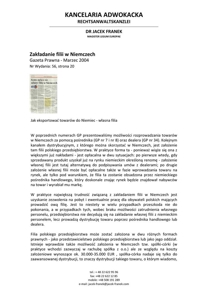 KANCELARIA ADWOKACKA RECHTSANWALTSKANZLEI DR JACEK FRANEK MAGISTER LEGUM EUROPAE Zakładanie filii w Niemczech Gazeta Prawna - Marzec 2004 Nr Wydania: 56, strona 20 Jak eksportować towarów do Niemiec - własna filia W poprzednich numerach GP prezentowaliśmy możliwości rozprowadzania towarów w Niemczech za pomocą pośrednika (GP nr 7 i nr 8) oraz dealera (GP nr 34). Kolejnym kanałem dystrybucyjnym, z którego można skorzystać w Niemczech, jest założenie tam filii polskiego przedsiębiorstwa. W praktyce forma ta - ponieważ wiąże się ona z większymi już nakładami - jest opłacalna w dwu sytuacjach: po pierwsze wtedy, gdy sprzedawany produkt uzyskał już na rynku niemieckim określoną renomę - założenie własnej filii jest tutaj alternatywą do podpisywania umów z dealerami; po drugie założenie własnej filii może być opłacalne także w fazie wprowadzania towaru na rynek, ale tylko pod warunkiem, że filia ta zostanie obsadzona przez niemieckiego pośrednika handlowego, który doskonale znając rynek będzie znajdował nabywców na towar i wyrabiał mu markę. W praktyce największą trudność związaną z zakładaniem filii w Niemczech jest uzyskanie zezwolenia na pobyt i ewentualnie pracę dla obywateli polskich mających prowadzić ową filię. Jest to niestety w wielu przypadkach przeszkoda nie do pokonania, a w przypadkach tych, wobec braku możliwości zatrudnienia własnego personelu, przedsiębiorstwa nie decydują się na zakładanie własnej filii z niemieckim personelem, lecz prowadzą dystrybucję towaru poprzez pośrednika handlowego lub dealera. Filia polskiego przedsiębiorstwa może zostać założona w dwu różnych formach prawnych - jako przedstawicielstwo polskiego przedsiębiorstwa lub jako jego oddział. Istnieje wprawdzie także możliwość założenia w Niemczech tzw. spółki-córki (w praktyce wchodzi zazwyczaj w rachubę spółka z o.o.) ale ze względu na koszty założeniowe wynoszące ok. 30.000-35.000 EUR , spółka-córka nadaje się tylko do zaawansowanej dystrybucji, to znaczy dystrybucji takiego towaru, o którym wiadomo, tel.: + 48 22 622 95 96 fax: +48 22 622 12 85 mobile: +48 508 191 289 e-mail: [email protected] że z pewnością się w Niemczech sprzeda. Zarówno przedstawicielstwo jak i oddział nie są z prawnego punktu widzenia - w przeciwieństwie do córek-spółek, które posiadają własną i odrębną od spółki-matki osobowość prawną - samodzielnymi przedsiębiorstwami, lecz dzielą w większym lub mniejszym stopniu byt prawny polskiego przedsiębiorstwa macierzystego. O stopniu owego "uzależnienia" od macierzystego przedsiębiorstwa decyduje to, którą z tych form polskie przedsiębiorstwo powołało do życia. 1. Przedstawicielstwo Przedstawicielstwo (Repräsentanz lub Betriebsstätte) nie ma w ogóle samodzielnego bytu prawnego. Jest ono jedynie częścią polskiego przedsiębiorstwa i nie występuje w Niemczech pod swoją własną nazwą, lecz pod nazwą owego przedsiębiorstwa. Przedstawicielstwo nie prowadzi własnej księgowości i nie może posiadać własnego majątku firmowego - księgowość prowadzona jest przez macierzyste przedsiębiorstwo polskie i do niego też należy majątek firmowy. Przedstawicielstwo nie posiada osobowości prawnej i nie podlega wpisowi do rejestru handlowego (Handelsregister), a tylko wpisowi do ewidencji gospodarczej (Gewerbeanmeldung). Mimo braku osobowości prawnej przedstawicielstwa bardzo dobrze nadaje się ono do prowadzenia dystrybucji w fazie wprowadzania produktu na rynek niemiecki, bowiem może zajmować się marketingiem, reklamą i poszukiwaniem nabywców towaru, jednym słowem zaznaczaniem obecności polskiego przedsiębiorstwa macierzystego na rynku - a już sama sprzedaż dokonywana jest przez to przedsiębiorstwo macierzyste. W formie przedstawicielstwa trudno jest natomiast prowadzić zaawansowaną dystrybucję towarów, a w szczególności dystrybucję bardziej skomplikowanych produktów, tj. takich, które mogą wymagać serwisowania lub napraw. Przedstawicielstwo nie może bowiem zatrudniać polskich pracowników, którzy mieliby zajmować się serwisem. Pracownicy ci musieliby więc za każdym razem dojeżdżać z macierzystego przedsiębiorstwa w Polsce, co prowadziłoby oczywiście do powstawania nadmiernych kosztów. Mimo prostoty formy prawnej, nie można przeoczyć jednak problemów związanych z zakładaniem i prowadzeniem przedstawicielstwa. Ponieważ przedstawicielstwo nie posiada osobowości prawnej, a jest jedynie częścią zagranicznego przedsiębiorstwa, a więc takiego, którego kondycja finansowa i gospodarcza jest na miejscu nieznana, forma ta nie wzbudza szczególnego zaufania niemieckich organów administracji państwowej. Manifestuje się to problemami natury administracyjnej przy zgłaszaniu przedstawicielstwa do ewidencji gospodarczej (Gewerbeanmeldung), a także problemami przy uzyskiwaniu zezwoleń na pobyt dla osób prowadzących przedstawicielstwo. Problemy te nie znikną prawdopodobnie także po przystąpieniu Polski do UE, ponieważ możliwe jest utrzymanie przez okres przejściowy różnych restrykcji. Kwestię tą trzeba widzieć jednak całkiem jasno: inaczej wygląda sytuacja, gdy przedstawicielstwo chce założyć duża firma, np. PKN Orlen, a inaczej, gdy jest to mała firma no name gdzieś z krańców Polski. Administracyjne koszty założenia przedstawicielstwa są bardzo niskie i wynoszą w granicach 200 EUR. Nie wolno jednak zapomnieć o kosztach obsługi prawnej, które mogą być w zależności od konkretnego stanu faktycznego bardzo różne. Wprawdzie tel.: + 48 22 622 95 96 fax: +48 22 622 12 85 mobile: +48 508 191 289 e-mail: [email protected] wiele polskich firm przyzwyczajonych jest do unikania tych kosztów, to jednak w Niemczech trzeba je od samego początku wpisać w budżet projektu, bowiem załatwianie spraw na własną rękę wychodzi tam w końcowym obrachunku drożej, nie mówiąc o tym, że moż