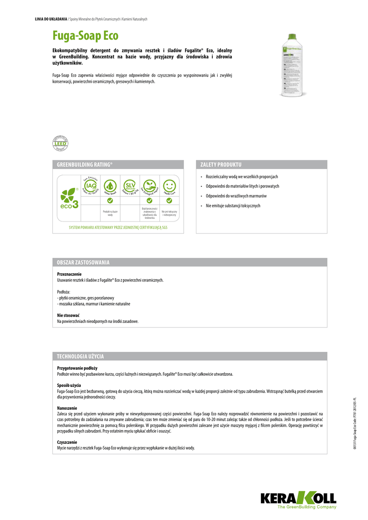 Linia do Układania / Spoiny Mineralne do Płytek Ceramicznych i Kamieni Naturalnych Fuga-Soap Eco Ekokompatybilny detergent do zmywania resztek i śladów Fugalite® Eco, idealny w GreenBuilding. Koncentrat na bazie wody, przyjazny dla środowiska i zdrowia użytkowników. NT R I BUTES PO TO INTS GreenBuilding Rating® y lit W ater Based lve kg REDUCED VOC n t ≤ 8 0 g/ Produkt na bazie wody Ec • Odpowiedni do materiałów litych i porowatych ct IAQ r Air Qua pa SLV Low 3 oo • Rozcieńczalny wodą we wszelkich proporcjach Emissio So Ind ® ow Zalety Produktu n L He ological Im Brak konieczności znakowania o szkodliwości dla środowiska a lth Care • Odpowiedni do wrażliwych marmurów • Nie emituje substancji toksycznych Nie jest toksyczny i niebezpieczny SYSTEM POMIARU ATESTOWANY PRZEZ JEDNOSTKĘ CERTYFIKUJĄCĄ SGS Obszar zastosowania Przeznaczenie Usuwanie resztek i śladów z Fugalite® Eco z powierzchni ceramicznych. Podłoża: - płytki ceramiczne, gres porcelanowy - mozaika szklana, marmur i kamienie naturalne Nie stosować Na powierzchniach nieodpornych na środki zasadowe. Technologia użycia Przygotowanie podłoży Podłoże winno być pozbawione kurzu, części luźnych i niezwiązanych. Fugalite® Eco musi być całkowicie utwardzona. Sposób użycia Fuga-Soap Eco jest bezbarwną, gotową do użycia cieczą, którą można rozcieńczać wodą w każdej proporcji zależnie od typu zabrudzenia. Wstrząsnąć butelką przed otwarciem dla przywrócenia jednorodności cieczy. Nanoszenie zaleca się przed użyciem wykonanie próby w niewyeksponowanej części powierzchni. Fuga-Soap Eco należy rozprowadzić równomiernie na powierzchni i pozostawić na czas potrzebny do zadziałania na zmywane zabrudzenia; czas ten może zmieniać się od paru do 10-20 minut zależąc także od chłonności podłoża. Jeśli to potrzebne ścierać mechanicznie powierzchnię za pomocą filcu polerskiego. W przypadku dużych powierzchni zalecane jest użycie maszyny myjącej z filcem polerskim. Operację powtórzyć w przypadku silnych zabrudzeń. Przy ostatnim myciu spłukać obficie i osuszyć. Czyszczenie Mycie narzędzi z resztek Fuga-Soap Eco wykonuje się przez wypłukanie w dużej ilości wody. 00131 Fuga-Soap Eco Code: P781 2012/05-PL CO Fuga-Soap Eco zapewnia właściwości myjące odpowiednie do czyszczenia po wyspoinowaniu jak i zwykłej konserwacji, powierzchni ceramicznych, gresowych i kamiennych. Inne wskazówki Fuga-Soap Eco jest ciekłym detergentem. Przed użyciem zaleca się osłonić szczelnie drzwi, okna, gumowe uszczelki, meble, elementy lakierowane, wanny i brodziki prysznicowe z materiałów syntetycznych jak akryl, PVC itp. oraz wszystkie powierzchnie, które mogą być narażone na kontakt bezpośredni lub kontakt z oparami. Wzór informacji technicznej dla projektantów Zmywanie resztek i śladów Fugalite® Eco z płytek ceramicznych, gresu porcelanowego, mozaiki szklanej, marmuru i kamieni naturalnych wykonać wodnym detergentem ekokompatybilnym, GreenBuilding Rating® Eco 3, w rodzaju Fuga-Soap Kerakoll Spa. Nanieść równomiernie na obrabianą powierzchnię, usunąć mechanicznie zabrudzenie i obficie spłukać, z średnią wydajnością ≈ ____ 0,1-0,3 ℓ/m2. Dane techniczne wg Normy Jakości Kerakoll Wygląd Gęstość Przechowywanie Uwagi Opakowanie Proporcja rozcieńczania wodą Lepkość pH Temperatura użycia Czas oczekiwania na zmywanie wodą Wydajność bezbarwna ciecz ≈ 0,98 kg/dm3 ≈ 24 miesiące w oryginalnym opakowaniu chronić przed mrozem; chronić przed bezpośrednim nasłonecznieniem i źródłami ciepła butelka 1 ℓ we wszelkich proporcjach ≈ 10,5 s, kubek Ford ≈ 9,7 od +5 °C do +35 °C ≈ 5-15 min. ≈ 0,1-0,3 ℓ/m2 Dane uzyskane w temp. +23 °C, przy wilgotności względnej 50% i przy braku wentylacji. Dane mogą ulec zmianie w zależności od warunków panujących na budowie: temperatury, wentylacji, nasiąkliwości podłoża i układanego materiału. Uwagi 00131 Fuga-Soap Eco Code: P781 2012/05-PL - Produkt do użytku profesjonalnego - przestrzegać wszelkich norm i przepisów krajowych - przechowywać i stosować w temperaturze powyżej +5 °C. Chronić przed mrozem - spłukiwać obficie obrabiane powierzchnie - nie pozostawiać otwartych opakowań także w czasie obróbki - w razie potrzeby zażądać karty bezpieczeństwa - w przypadku innych wątpliwości prosimy o kontakt z Kerakoll Worldwide Global Service + 48 42 225 17 00 - [email protected] Dane dotyczące klasyfikacji Eco i Bio odnoszą się do GreenBuilding Rating® Manual 2011. Niniejsze informacje zostały uaktualnione w maju 2012; precyzuje się, że mogą one podlegać w miarę upływu czasu uzupełnieniom i/lub zmianom przeprowadzanym przez KERAKOLL SpA; w celu zapoznania się z takimi ewentualnymi uzupełnieniami można wejść na nasze strony internetowe www.kerakoll.com. Z tego to powodu firma KERAKOLL SpA jest odpowiedzialna za ważność, aktualność i uaktualnienia własnych informacji jedynie w takim przypadku, gdy zostały one zaczerpnięte z jej własnych stron internetowych. Karta techniczna jest opracowana na podstawie naszej najlepszej wiedzy technicznej i praktycznej. Ponieważ jednak nie możemy bezpośrednio wpływać na warunki budowy i sposób wykonywania prac, zastrzegamy, że są to wskazówki o charakterze ogólnym, które nie zobowiązują w żaden sposób naszej firmy. Dlatego zalecamy przeprowadzenie próby w celu sprawdzenia przydatności produktu do przewidywanego zastosowania. KERAKOLL POLSKA Sp. z o.o. ul. Katowicka 128 – 95-030 Rzgów, Polska Tel. +48 42 225 17 00 – Fax +48 42 225 17 01 e -mail: [email protected]