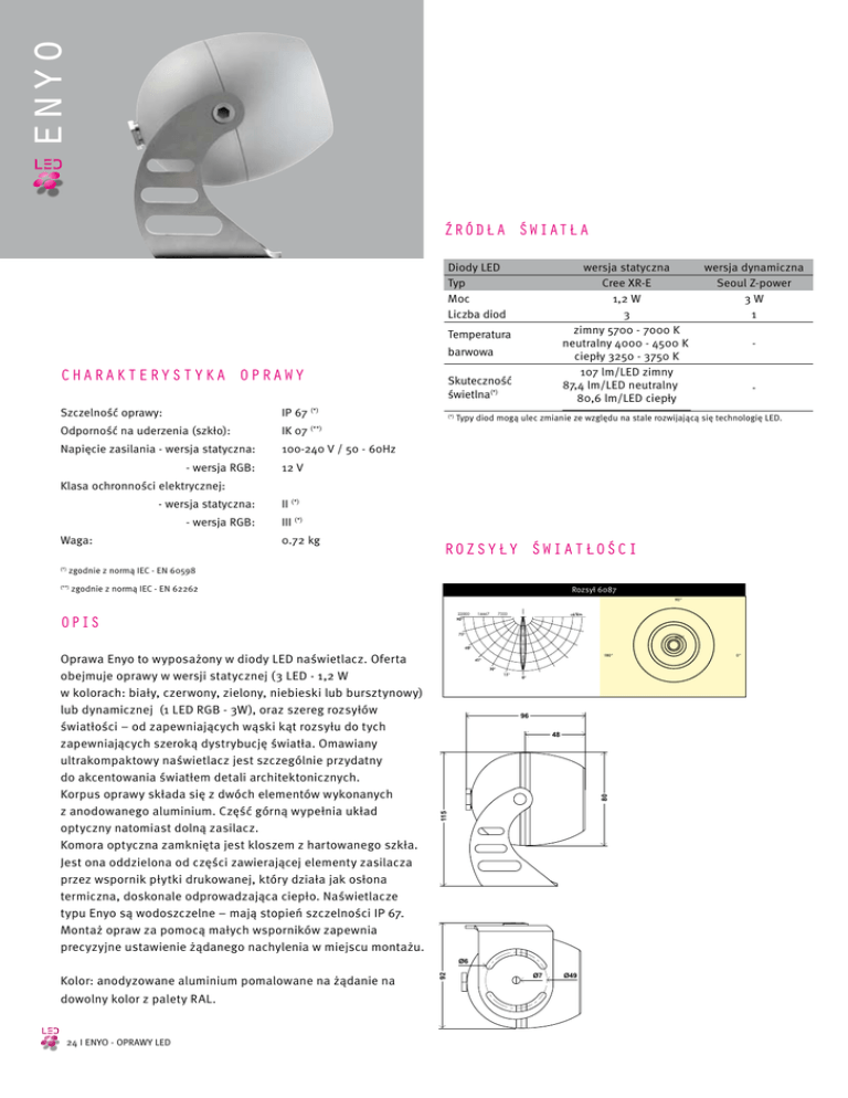enyo ŹRÓDŁA ŚWIATŁa Diody LED Typ Moc Liczba diod wersja statyczna wersja dynamiczna Cree XR-E Seoul Z-power 1,2 W 3W 3 1 zimny 5700 - 7000 K neutralny 4000 - 4500 K ciepły 3250 - 3750 K 107 lm/LED zimny 87,4 lm/LED neutralny 80,6 lm/LED ciepły Temperatura barwowa CHARAKTERYSTYKA OPRAWY Szczelność oprawy: IP 67 (*) Odporność na uderzenia (szkło): IK 07 (**) Napięcie zasilania - wersja statyczna: 100-240 V / 50 - 60Hz - wersja RGB: Skuteczność świetlna(*) (*) Typy diod mogą ulec zmianie ze względu na stale rozwijającą się technologię LED. 12 V Klasa ochronności elektrycznej: - wersja statyczna: II (*) - wersja RGB: III (*) Waga: (*) 22000 0.72 kg 14667 7333 ROZSYŁY ŚWIATŁOŚCI zgodnie z normą IEC - EN 60598 (**) zgodnie z normą IEC - EN 62262 Rozsył 6087 90° Opis 22000 14667 7333 270° dowolny kolor z palety RAL. 24 I ENYO - OPRAWY LED cd/klm 18333 14667 48 11000 7333 3667 60° 45° 0° 15° 30° 45° 60° 75° 90° 92 Ø6 22000 cd/klm 18333 14667 11000 7333 3667 90° 75° 60° 45° Ø6 92 30° 15° Enyo 292023 115 80 90° 75° 115 Kolor: anodyzowane aluminium pomalowane na żądanie na 0° 22000 96 30° 15° 0° 15° 30° 45° 60° 75° 90° 80 Oprawa Enyo to wyposażony w diody LED naświetlacz. Oferta obejmuje oprawy w wersji statycznej (3 LED - 1,2 W w kolorach: biały, czerwony, zielony, niebieski lub bursztynowy) lub dynamicznej (1 LED RGB - 3W), oraz szereg rozsyłów światłości – od zapewniających wąski kąt rozsyłu do tych zapewniających szeroką dystrybucję światła. Omawiany ultrakompaktowy naświetlacz jest szczególnie przydatny do akcentowania światłem detali architektonicznych. Korpus oprawy składa się z dwóch elementów wykonanych z anodowanego aluminium. Część górną wypełnia układ optyczny natomiast dolną zasilacz. Komora optyczna zamknięta jest kloszem z hartowanego szkła. 96 Jest ona oddzielona od części zawierającej elementy zasilacza 48 przez wspornik płytki drukowanej, który działa jak osłona termiczna, doskonale odprowadzająca ciepło. Naświetlacze typu Enyo są wodoszczelne – mają stopień szczelności IP 67. Montaż opraw za pomocą małych wsporników zapewnia precyzyjne ustawienie żądanego nachylenia w miejscu montażu. 180° Enyo 292023 Ø7 Ø49 Ø7 Ø49
