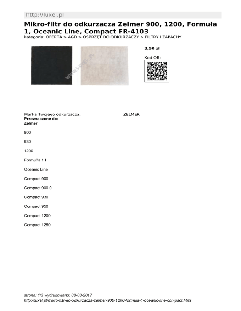 http://luxel.pl Mikro-filtr do odkurzacza Zelmer 900, 1200, Formuła 1, Oceanic Line, Compact FR-4103 kategoria: OFERTA > AGD > OSPRZĘT DO ODKURZACZY > FILTRY I ZAPACHY 3,90 zł Kod QR: Marka Twojego odkurzacza: Przeznaczone do: Zelmer ZELMER 900 930 1200 Formu?a 1 I Oceanic Line Compact 900 Compact 900.0 Compact 930 Compact 950 Compact 1200 Compact 1250 strona: 1/3 wydrukowano: 08-03-2017 http://luxel.pl/mikro-filtr-do-odkurzacza-zelmer-900-1200-formula-1-oceanic-line-compact.html strona: 2/3 wydrukowano: 08-03-2017 http://luxel.pl/mikro-filtr-do-odkurzacza-zelmer-900-1200-formula-1-oceanic-line-compact.html strona: 3/3 wydrukowano: 08-03-2017 http://luxel.pl/mikro-filtr-do-odkurzacza-zelmer-900-1200-formula-1-oceanic-line-compact.html