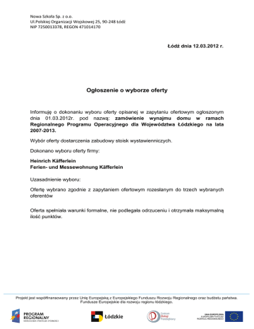 Nowa Szkoła Sp. z o.o. Ul.Polskiej Organizacji Wojskowej 25, 90-248 Łódź NIP 7250013378, REGON 471014170 Łódź dnia 12.03.2012 r. Ogłoszenie o wyborze oferty Informuję o dokonaniu wyboru oferty opisanej w zapytaniu ofertowym ogłoszonym dnia 01.03.2012r. pod nazwą: zamówienie wynajmu domu w ramach Regionalnego Programu Operacyjnego dla Województwa Łódzkiego na lata 2007-2013. Wybór oferty dostarczenia zabudowy stoisk wystawienniczych. Dokonano wyboru oferty firmy: Heinrich Käfferlein Ferien- und Messewohnung Käfferlein Uzasadnienie wyboru: Ofertę wybrano zgodnie z zapytaniem ofertowym rozesłanym do trzech wybranych oferentów Oferta spełniała warunki formalne, nie podlegała odrzuceniu i otrzymała maksymalną ilość punktów.
