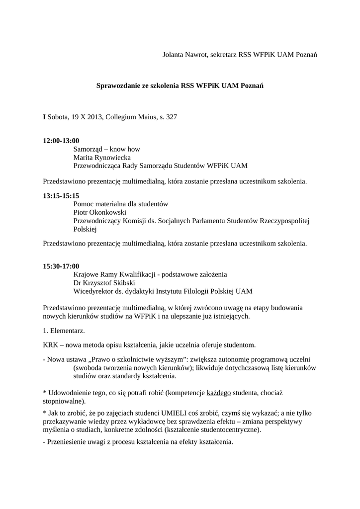 Jolanta Nawrot, sekretarz RSS WFPiK UAM Poznań Sprawozdanie