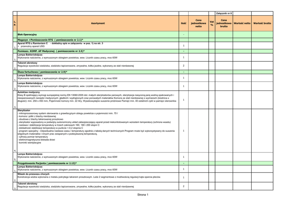 Załącznik nr 8 L. P. Asortyment ilość Blok Operacyjny - Magazyn +Pomieszczenie RTG ( pomieszczenie nr 2.1)* 1. 1. 2. 1. Aparat RTG z Ramieniem C + przenośny aparat USG - dokładny opis w załączeniu w poz. 1) na str. 3 1 Pomieszc. KOMP. AP Medycznej ( pomieszczenie nr 2.5)* - Lampa Bakteriobójcza Wykonanie naścienne, z wymuszonym obiegiem powietrza, wew. Licznik czasu pracy, moc 60W 1 Taboret obrotowy Regulacja wysokości siedziska, siedzisko tapicerowane, zmywalne, kółka jezdne, wykonany ze stali nierdzewnej 2 Śluza fartuchowa ( pomieszczenie nr 2.9)* - Lampa Bakteriobójcza Wykonanie naścienne, z wymuszonym obiegiem powietrza, wew. Licznik czasu pracy, moc 60W 1 Lampa Bakteriobójcza Wykonanie naścienne, z wymuszonym obiegiem powietrza, wew. Licznik czasu pracy, moc 60W 1 Autoklaw medyczny Klasy B spełniający wymogi europejskiej normy EN 13060:2005 dot. małych sterylizatorów parowych, sterylizacja nasyconą parą wodną opakowanych i nieopanowanych narzędzi medycznych: gładkich i wydrążonych oraz porowatych materiałów Komora ze stali nierdzewnej o wymiarach (średnica x długość): min. 250 x 450 mm, Pojemność komory min. 22 litry, Wysokowydajne suszenie próżniowe Pamięć min. 40 ostatnich cykli w pamięci sterownika 1 2. 3. Sterylizator - mikroprocesorowy system sterowania o grawitacyjnym obiegu powietrza o pojemności min. 75 l - komora i półki z blachy nierdzewnej - obudowa z blachy lakierowanej proszkowo - sterylizator wyposażony w podwójny autonomiczny układ zabezpieczający aparat przed niekontrolowanym wzrostem temperatury (ochrona wsadu) - nastawa i stabilizacja temperatury w trzech zakresach 160, 180 i 200 stopni C - dokładność stabilizacji temperatury w punkcie +-0,2 stopnia C - program specjalny - indywidualna nastawa czasu i temperatury zgodnie z tabelą danych technicznych Program może być wykorzystywany do suszenia wilgotnych materiałów i innych prac związanych z podwyższoną temperaturą, - cyfrowy pomiar temperatury - elektromagnetyczna blokada drzwi - kominki wentylacyjne 1 4. 5. 1. Lampa Bakteriobójcza Wykonanie naścienne, z wymuszonym obiegiem powietrza, wew. Licznik czasu pracy, moc 60W 1 Przygotowanie Pacjenta ( pomieszczenie nr 2.13)* - Lampa Bakteriobójcza Wykonanie naścienne, z wymuszonym obiegiem powietrza, wew. Licznik czasu pracy, moc 60W 1 Wózek do przewozu chorych Konstrukcja wózka wykonana z metalu pokrytego lakierem proszkowym. Leże 2 segmentowe z możliwością regulacji kąta oparcia pleców. 1 Taboret obrotowy Regulacja wysokości siedziska, siedzisko tapicerowane, zmywalne, kółka jezdne, wykonany ze stali nierdzewnej 2 2. 3. Strona 1 Cena jednostkowa netto Vat % Cena jednostkowa brutto Wartość netto Wartość brutto 4. Lampa zabiegowa Przejezdna halogenowa, min. 35000lux, żywotnośc min. 1600godzin 1 Stolik do instrumentowania Wykonany ze stali kwasoodpornej w gatunku 0H18N9, ręczna regulacja wysokości o wymiarach blatu 750x350 (+/-15%) 1 5. Wieszak kroplówki 6. Jezdny, podstawa i tubus metalowy, malowany proszkowo lub w całości wykonany ze stali kwasoodpornej nie molowany proszkowo 1. 2. 1 Przygotowanie lekarzy ( pomieszczenie nr 2.14)* - Lampa Bakteriobójcza Wykonanie naścienne, z wymuszonym obiegiem powietrza, wew. Licznik czasu pracy, moc 60W 3 Stojak z misą na odpady. Wyposażony w miskę zdejmowaną o pojemności 6L. 2 Sala Operacyjna Ogólnochirurgiczna ( pomieszczenie nr 2.11)* - Lampa Bakteriobójcza Wykonanie naścienne, z wymuszonym obiegiem powietrza, wew. Licznik czasu pracy, moc 60W 3 1. System stołów z wymiennością blatu - dokładny opis w załączeniu w poz. 2) na str. 6 2. (blaty podejmowane przez transportery) LAMAPA OPERACYJNA - dokładny opis w załączeniu w poz. 12) na str. 25 3. Kolumna anestezjologiczna - dokładny opis w załączeniu w poz. 3) na str. 7 4. Kolumna chirurgiczna - dokładny opis w załączeniu w poz. 4) na str. 9 1 1 1 1 5. Aparat do znieczulenia ogólnego - dokładny opis w załączeniu w poz. 6) na str. 11 1 6. 7. 8. MONITOR PACJENTA - dokładny opis w załączeniu w poz. 7) na str. 13 1 Diatermia elektrochirurgiczna - dokładny opis w załączeniu w poz. 8) na str. 15 + nóż harmoniczny 1 Ssak elektryczny Zamawiający nie precyzuje żadnych parametrów technicznych jakie powinien spełniać ssak elektryczny 9. 10. Aparat do elektrochirurgii mono i bipolarnej - dokładny opis w załączeniu w poz. 14) na str. 27 1 1 Stolik do instrumentowania Wykonany ze stali kwasoodpornej w gatunku 0H18N9, ręczna regulacja wysokości o wymiarach blatu 750x350 (+/-15%) 1 Stolik narzędziowy dwublatowy Wykonany ze stali kwasoodpornej w gatunku OH18N9. 3 11. 12. Taboret obrotowy 13. Z oparciem z hydrauliczną regulacją wysokości siedziska, siedzisko tapicerowane, kółka jezdne, wykonany ze stali nierdzewnej. Stojak z misą na odpady 14. Wyposażony w miskę zdejmowaną o pojemności 6L. 15. Urządzenie do ogrzewania pacjenta - dokładny opis w załączeniu w poz. 16) na str. 29 1 16. 18. Pompa strzykawkowa 1 1 Negatoskop dwuklatkowy z podziałem na klatki, uchwyt na zdjęcia, regulacją luminacji 17. 1 - dokładny opis w załączeniu w poz. 9) na str. 18 2 Mankiet do szybkiego Przetaczania krwi i płynów (pompka + manometr) 1 Stojak 2 misowy 19. Na odpady. 1 Strona 2 Wieszak kroplówki jezdny, podstawa i tubus metalowy, malowany proszkowo lub w całości wykonany ze stali kwasoodpornej nie molowany proszkowo 20. 1. 2. Pokój aparatury ( pomieszczenie nr 2.15)* Wózek Reanimacyjny - dokładny opis w załączeniu w poz. 15) na str. 28 1 - Lampa Bakteriobójcza Wykonanie naścienne, z wymuszonym obiegiem powietrza, wew. Licznik czasu pracy, moc 60W 2 Wieszak kroplówki jezdny 3. Podstawa i tubus metalowy, malowany proszkowo,lub w całości wykonany ze stali kwasoodpornej nie molowany proszkowo 1. 2. 1 Sala Operacyjna Ginekologiczna ( laparoskopowa) ( pomieszczenie nr 2.16)* - Lampa Bakteriobójcza Wykonanie naścienne, z wymuszonym obiegiem powietrza, wew. Li