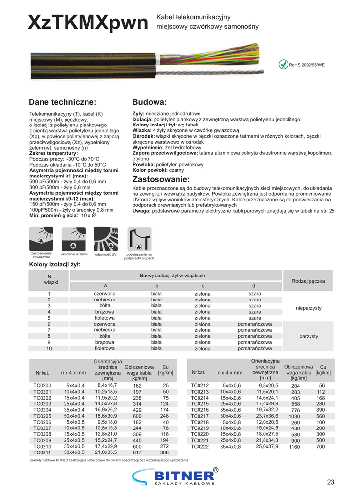 XzTKMXpwn Kabel telekomunikacyjny miejscowy czwórkowy samonośny RoHS RoHS 2002/95/WE Dane techniczne: Budowa: Telekomunikacyjny (T), kabel (K) miejscowy (M), pęczkowy, o izolacji z polietylenu piankowego z cienką warstwą polietylenu jednolitego (Xp), w powłoce polietylenowej z zaporą przeciwwilgociową (Xz), wypełniony żelem (w), samonośny (n). Zakres temperatury: Podczas pracy: -30°C do 70°C Podczas układania -10°C do 50°C Asymetria pojemności między torami macierzystymi k1 (max): 500 pF/500m - żyły 0,4 do 0,6 mm 300 pF/500m - żyły 0,8 mm Asymetria pojemności między torami macierzystymi k9-12 (max): 150 pF/500m - żyły 0,4 do 0,6 mm 100pF/500m - żyły o średnicy 0,8 mm Min. promień gięcia: 10 x Ø Żyły: miedziane jednodrutowe Izolacja: polietylen piankowy z zewnętrzną warstwą polietylenu jednolitego Kolory izolacji żył: wg tabeli Wiązka: 4 żyły skręcone w czwórkę gwiazdową Ośrodek: wiązki skręcone w pęczki oznaczone taśmami w różnych kolorach, pęczki skręcone warstwowo w ośrodek Wypełnienie: żel hydrofobowy Zapora przeciwwilgociowa: taśma aluminiowa pokryta dwustronnie warstwą kopolimeru etylenu Powłoka: polietylen powłokowy Kolor powłoki: czarny Zastosowanie: Kable przeznaczone są do budowy telekomunikacyjnych sieci miejscowych, do układania na zewnętrz i wewnątrz budynków. Powłoka zewnętrzna jest odporna na promieniowanie UV oraz wpływ warunków atmosferycznych. Kable przeznaczone są do podwieszania na podporach drewnianych lub prefabrykowanych Uwaga: podstawowe parametry elektryczne kabli parowych znajdują się w tabeli na str. 25 UV zastosowanie zewnętrzne układanie w ziemi odporność UV Kolory izolacji żył: podwieszanie na podporach/ słupach Barwy izolacji żył w wiązkach Nr wiązki 1 2 3 4 5 6 7 8 9 10 Nr kat. n x 4 x mm TC0200 TC0201 TC0202 TC0203 TC0204 TC0205 TC0206 TC0207 TC0208 TC0209 TC0210 TC0211 5x4x0,4 10x4x0,4 15x4x0,4 25x4x0,4 35x4x0,4 50x4x0,4 5x4x0,5 10x4x0,5 15x4x0,5 25x4x0,5 35x4x0,5 50x4x0,5 a b c d czerwona niebieska żółta brązowa fioletowa czerwona niebieska żółta brązowa fioletowa biała biała biała biała biała biała biała biała biała biała zielona zielona zielona zielona zielona zielona zielona zielona zielona zielona szara szara szara szara szara pomarańczowa pomarańczowa pomarańczowa pomarańczowa pomarańczowa Orientacyjna Cu średnica Obliczeniowa zewnętrzna waga kabla [kg/km] [kg/km] [mm] 8,4x16,7 25 162 10,2x18,5 50 197 11,9x20,2 75 238 14,5x22,8 124 314 16,9x26,2 174 429 18,6x30,9 248 600 9,5x18,0 40 182 10,8x19,3 78 244 12,8x21,0 116 309 15,2x24,7 194 440 17,4x29,9 272 600 21,0x33,5 388 817 Nr kat. n x 4 x mm TC0212 TC0213 TC0214 TC0215 TC0216 TC0217 TC0218 TC0219 TC0220 TC0221 TC0222 5x4x0,6 10x4x0,6 15x4x0,6 25x4x0,6 35x4x0,6 50x4x0,6 5x4x0,8 10x4x0,8 15x4x0,8 25x4x0,8 35x4x0,8 Rodzaj pęczka nieparzysty parzysty Orientacyjna średnica Obliczeniowa Cu zewnętrzna waga kabla [kg/km] [mm] [kg/km] 9,8x20,5 56 204 11,6x20,1 112 283 14,6x24,1 168 405 17,4x29,9 280 558 19,7x32,2 390 776 23,7x36,6 560 1030 12,0x20,5 100 260 15,0x24,5 200 430 18,0x27,5 300 580 21,8x34,3 500 900 25,0x37,9 700 1160 Zakłady Kablowe BITNER zastrzegają sobie prawo do zmiany specyfikacji bez wcześniejszego uprzedzenia ® 23