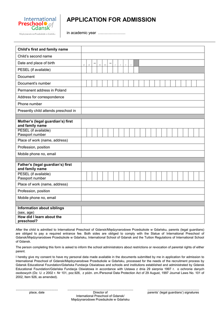 APPLICATION FOR ADMISSION in academic year ………………… Child’s first and family name Child’s second name Date and place of birth d d – m m – r r r r PESEL (if available) Document Document’s number Permanent address in Poland Address for correspondence Phone number Presently child attends preschool in Mother’s (legal guardian’s) first and family name PESEL (if available) Passport number Place of work (name, address) Profession, position Mobile phone no, email Father’s (legal guardian’s) first and family name PESEL (if available) Passport number Place of work (name, address) Profession, position Mobile phone no, email Information about siblings (sex, age) How did I learn about the preschool? After the child is admitted to International Preschool of Gdansk/Międzynarodowe Przedszkole w Gdańsku, parents (legal guardians) are obliged to pay a required entrance fee. Both sides are obliged to comply with the Statue of International Preschool of Gdansk/Międzynarodowe Przedszkole w Gdańsku, International School of Gdansk and the Tuition Regulations of International School of Gdansk. The person completing this form is asked to inform the school administrators about restrictions or revocation of parental rights of either parent. I hereby give my consent to have my personal data made available in the documents submitted by me in application for admission to International Preschool of Gdansk/Międzynarodowe Przedszkole w Gdańsku, processed for the needs of the recruitment process by Gdansk Educational Foundation/Gdańska Fundacja Oświatowa and schools and institutions established and administrated by Gdansk Educational Foundation/Gdańska Fundacja Oświatowa in accordance with Ustawa z dnia 29 sierpnia 1997 r. o ochronie danych osobowych (Dz. U. z 2002 r. Nr 101, poz.926, z późn. zm./Personal Data Protection Act of 29 August, 1997 Journal Laws No. 101 of 2002, Item 926, as amended). ....................................... place, date ........................... ............................................................. Director of International Preschool of Gdansk/ Międzynarodowe Przedszkole w Gdańsku ................................................ parents’ (legal guardians’) signatures