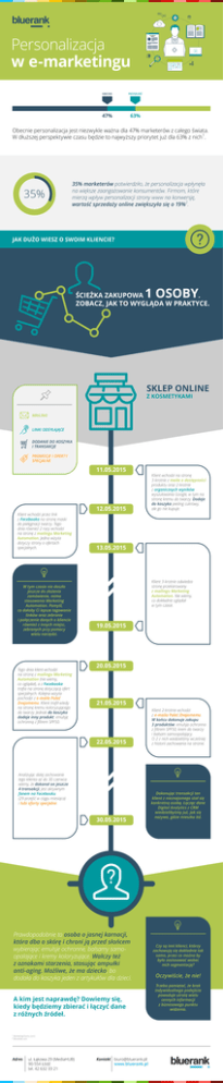 Personalizacja w e-marketingu OBECNIE PRZYSZŁOŚĆ 47% 63% Obecnie personalizacja jest niezwykle ważna dla 47% marketerów z całego świata. W dłuższej perspektywie czasu będzie to najwyższy priorytet już dla 63% z nich1. 35% 35% marketerów potwierdziło, że personalizacja wpłynęła na większe zaangażowanie konsumentów. Firmom, które mierzą wpływ personalizacji strony www na konwersję, wartość sprzedaży online zwiększyła się o 19%2. JAK DUŻO WIESZ O SWOIM KLIENCIE? 1 OSOBY ŚCIEŻKA ZAKUPOWA . ZOBACZ, JAK TO WYGLĄDA W PRAKTYCE. SKLEP ONLINE Z KOSMETYKAMI MAILING LINKI ODSYŁAJĄCE DODANIE DO KOSZYKA I TRANSAKCJE PROMOCJE I OFERTY SPECJALNE 11.05.2015 Klient wchodzi przez link z Facebooka na stronę maski do pielęgnacji twarzy. Tego dnia również 2 razy wchodzi na stronę z mailingu Marketing Automation. Jedna wizyta dotyczy strony o ofertach specjalnych. W tym czasie nie doszło jeszcze do złożenia zamówienia, mimo stosowania Marketing Automation. Pomyśl, co dałoby Ci lepsze tagowanie linków oraz zebranie i połączenie danych o kliencie również z innych miejsc, zebranych przy pomocy wielu narzędzi. Tego dnia klient wchodzi na stronę z mailingu Marketing Automation (nie wiemy, co oglądał), a z Facebooka trafia na stronę dotyczącą ofert specjalnych. Kolejna wizyta pochodzi z e-maila Poleć Znajomemu. Klient trafił wtedy na stronę kremu koloryzującego do twarzy. Jednak do koszyka dodaje inny produkt: emulsję ochronną z filtrem SPF50. 12.05.2015 13.05.2015 Klient 3-krotnie odwiedza stronę przekierowany z mailingu Marketing Automation. Nie wiemy, co dokładnie oglądał w tym czasie. 19.05.2015 20.05.2015 21.05.2015 22.05.2015 Analizując dalej zachowanie tego klienta aż do 30 czerwca wiemy, że dokonał on jeszcze 4 transakcji, jest aktywnym fanem na Facebooku (29 przejść w ciągu miesiąca) i lubi oferty specjalne. 30.05.2015 Prawdopodobnie to osoba o jasnej karnacji, która dba o skórę i chroni ją przed słońcem wybierając emulsje ochronne, balsamy samoopalające i kremy koloryzujące. Walczy też z oznakami starzenia, stosując ampułki anti-aging. Możliwe, że ma dziecko, bo dodała do koszyka jeden z artykułów dla dzieci. A kim jest naprawdę? Dowiemy się, kiedy będziemy zbierać i łączyć dane z różnych źródeł. 1 2 MarketingCharts.com5 Monetate.com Adres ul. Łąkowa 29 (MediaHUB) 90-554 Łódź tel. 42 632 33 21 Klient wchodzi na stronę 3-krotnie z maila o dostępności produktu oraz 2-krotnie z organicznych wyników wyszukiwania Google, w tym na stronę kremu do twarzy. Dodaje do koszyka peeling cukrowy, ale go nie kupuje. Kontakt [email protected] www.bluerank.pl Klient 2-krotnie wchodzi z e-maila Poleć Znajomemu. W końcu dokonuje zakupu 3 produktów: emulsja ochronna z filtrem SPF50, krem do twarzy i balsam samoopalający. O 2 z nich wiedzieliśmy wcześniej z historii zachowania na stronie. Dokonując transakcji ten klient z nieznajomego stał się konkretną osobą. Łącząc dane Digital Analytics z CRM wiedzielibyśmy już, jak się nazywa, gdzie mieszka itd. Czy są inni klienci, którzy zachowują się dokładnie tak samo, przez co można by było zastosować wobec nich segmentację? Oczywiście, że nie! Trzeba pamiętać, że brak indywidualnego podejścia powoduje utratę wielu cennych informacji z biznesowego punktu widzenia.