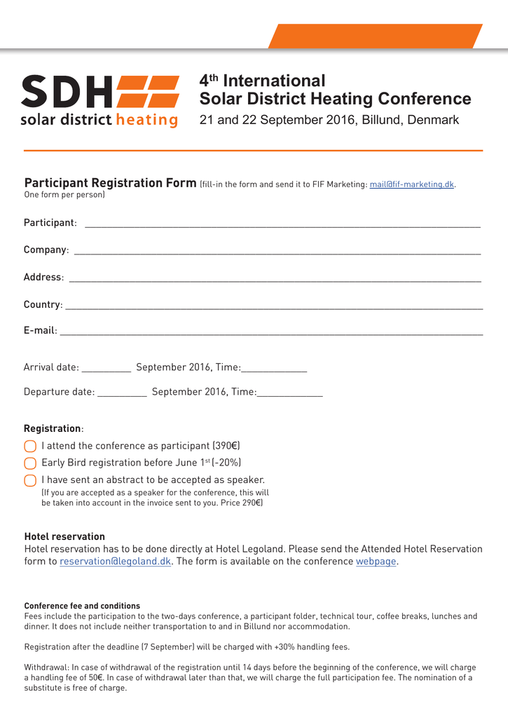 4th International Solar District Heating Conference 21 and 22 September 2016, Billund, Denmark Participant Registration Form (fill-in the form and send it to FIF Marketing: [email protected]. One form per person) Participant: ________________________________________________________________________ Company: __________________________________________________________________________ Address: ___________________________________________________________________________ Country: ____________________________________________________________________________ E-mail: _____________________________________________________________________________ Arrival date: _________ September 2016, Time:____________ Departure date: _________ September 2016, Time:____________ Registration: I attend the conference as participant (390€) Early Bird registration before June 1st (-20%) I have sent an abstract to be accepted as speaker. (If you are accepted as a speaker for the conference, this will be taken into account in the invoice sent to you. Price 290€) Hotel reservation Hotel reservation has to be done directly at Hotel Legoland. Please send the Attended Hotel Reservation form to [email protected]. The form is available on the conference webpage. Conference fee and conditions Fees include the participation to the two-days conference, a participant folder, technical tour, coffee breaks, lunches and dinner. It does not include neither transportation to and in Billund nor accommodation. Registration after the deadline (7 September) will be charged with +30% handling fees. Withdrawal: In case of withdrawal of the registration until 14 days before the beginning of the conference, we will charge a handling fee of 50€. In case of withdrawal later than that, we will charge the full participation fee. The nomination of a substitute is free of charge.
