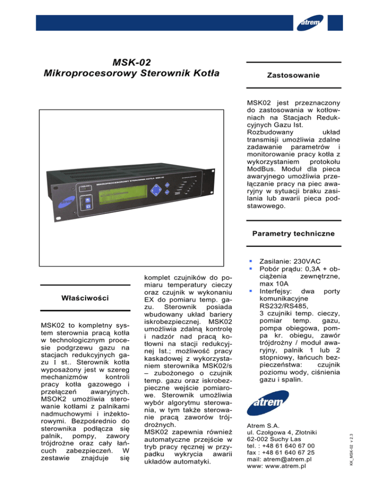 MSK-02 Mikroprocesorowy Sterownik Kotła Zastosowanie MSK02 jest przeznaczony do zastosowania w kotłowniach na Stacjach Redukcyjnych Gazu Ist. Rozbudowany układ transmisji umoŜliwia zdalne zadawanie parametrów i monitorowanie pracy kotła z wykorzystaniem protokołu ModBus. Moduł dla pieca awaryjnego umoŜliwia przełączanie pracy na piec awaryjny w sytuacji braku zasilania lub awarii pieca podstawowego. Parametry techniczne Zasilanie: 230VAC Pobór prądu: 0,3A + ob- MSK02 to kompletny system sterownia pracą kotła w technologicznym procesie podgrzewu gazu na stacjach redukcyjnych gazu I st.. Sterownik kotła wyposaŜony jest w szereg mechanizmów kontroli pracy kotła gazowego i przełączeń awaryjnych. MSOK2 umoŜliwia sterowanie kotłami z palnikami nadmuchowymi i inŜektorowymi. Bezpośrednio do sterownika podłącza się palnik, pompy, zawory trójdroŜne oraz cały łańcuch zabezpieczeń. W zestawie znajduje się ciąŜenia zewnętrzne, max 10A Interfejsy: dwa porty komunikacyjne RS232/RS485, 3 czujniki temp. cieczy, pomiar temp. gazu, pompa obiegowa, pompa kr. obiegu, zawór trójdroŜny / moduł awaryjny, palnik 1 lub 2 stopniowy, łańcuch bezpieczeństwa: czujnik poziomu wody, ciśnienia gazu i spalin. Atrem S.A. ul. Czołgowa 4, Złotniki 62-002 Suchy Las tel. : +48 61 640 67 00 fax : +48 61 640 67 25 mail: [email protected] www: www.atrem.pl KK_MSK-02 v 2.3 Właściwości komplet czujników do pomiaru temperatury cieczy oraz czujnik w wykonaniu EX do pomiaru temp. gazu. Sterownik posiada wbudowany układ bariery iskrobezpiecznej. MSK02 umoŜliwia zdalną kontrolę i nadzór nad pracą kotłowni na stacji redukcyjnej Ist.; moŜliwość pracy kaskadowej z wykorzystaniem sterownika MSK02/s – zuboŜonego o czujnik temp. gazu oraz iskrobezpieczne wejście pomiarowe. Sterownik umoŜliwia wybór algorytmu sterowania, w tym takŜe sterowanie pracą zaworów trójdroŜnych. MSK02 zapewnia równieŜ automatyczne przejście w tryb pracy ręcznej w przypadku wykrycia awarii układów automatyki.
