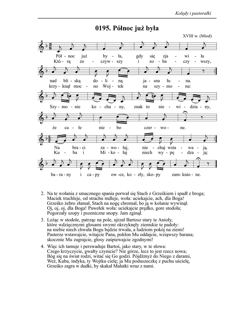 Kolędy i pastorałki 0195. Północ już była XVIII w. (Miod) Pół - noc Któ - rą już zo - nad bli - ską krzy - knął moc - Szy - mo - nie że ca - łe Na Ku - ba - ra - ny by - ła, czyw - szy do - li - ną no Woj - tek ko - cha - ny, nie - bra - ci ba i i bo za - wo - łaj, Mi - ko - łaj ca - py gdy i się zja zo - ba - ja - sna łu na szy - mo znak to nie - czer - wo - wi - ła czy - wszy, - na. na: wi - dzia - ny, ne. nie - chaj wsta - wa - ją. niech wy - pę - dza - ją: ow -ce, ko - zły, sko- py zam- knio - ne. 2. Na te wołania z smacznego spania porwał się Stach z Grześkiem i spadł z broga; Maciek truchleje, od strachu mdleje, woła: uciekajcie, ach, dla Boga! Grześko żebro złamał, Stach na nogę chromał, bo ją w kolanie wywinął. Oj, oj, oj, dla Boga! Pawełek woła: uciekajcie prędko, gore stodoła; Pogorzały szopy i pszeniczne snopy. Jam zginął. 3. Leżąc w stodole, patrząc na pole, ujrzał Bartosz stary te Anioły, które wdzięcznymi głosami swymi okrzyknęły ziemskie te padoły: na niebie niech chwała Bogu będzie trwała, a ludziom pokój na ziemi! Pasterze wstawajcie, witajcie Pana, pokłon Mu oddajcie, wziąwszy barana; skocznie Mu zagrajcie, głosy zaśpiewajcie zgodnymi! 4. Więc ich tamuje i perswaduje Bartoś, jako stary, w te słowa: Czego krzyczycie, gwałty czynicie? Nie górze, lecz to jest rzecz nowa; Bóg się na świat rodzi, witać się Go godzi. Pójdźmyż do Niego z darami, Weź, Kuba, indyka, ty Wojtku cielę; ja Mu poduszeczkę z puchu uścielę, Grześko zagra w dudki, by skakał Malutki wraz z nami.