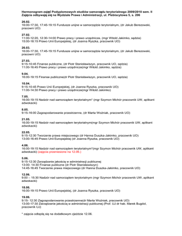 Harmonogram zajęć Podyplomowych studiów samorządu terytorialnego 2009/2010 sem. II Zajęcia odbywają się na Wydziale Prawa i Administracji, ul. Plebiscytowa 5, s. 206 26.02. 16:00-17:30, 17:45-19:15 Fundusze unijne w samorządzie terytorialnym, (dr Jakub Berezowski, pracowni UO) 27.02. 11:00-12:20, 12:30-14:00 Prawo pracy i prawo urzędnicze, (mgr Witold Jakimko, sędzia) 15:00-18:15 Prawo Unii Europejskiej, (dr Joanna Ryszka, pracownik UO) 26.03. 16:00-17:30, 17:45-19:15 Fundusze unijne w samorządzie terytorialnym, (dr Jakub Berezowski, pracowni UO) 27.03. 9:15-10:45 Finanse publiczne, (dr Piotr Stanisławiszyn, pracownik UO, sędzia) 11:00-16:45 Prawo pracy i prawo urzędnicze(mgr Witold Jakimko, sędzia) 9.04. 16:00-19:15 Finanse publiczne(dr Piotr Stanisławiszyn, pracownik UO, sędzia) 10.04. 9:15-10:45 Prawo Unii Europejskiej, (dr Joanna Ryszka, pracownik UO) 11:00-14:30 Prawo pracy i prawo urzędnicze(mgr Witold Jakimko) 7.05. 16:00-19:15 Nadzór nad samorządem terytorialnym* (mgr Szymon Michór pracownik UW, aplikant adwokacki) 8.05. 9:15-16:00 Zagospodarowanie przestrzenne, (dr Marta Woźniak, pracownik UO) 21.05. 16:00-19:15 Nadzór nad samorządem terytorialnym(mgr Szymon Michór pracownik UW, aplikant adwokacki) 22.05. 9:15-12:30 Tworzenie prawa miejscowego (dr Hanna Duszka-Jakimko, pracownik UO) 13:00-16:45 Prawo Unii Europejskiej (dr Joanna Ryszka, pracownik UO) 4.06. 16:00-19:15 Nadzór nad samorządem terytorialnym*(mgr Szymon Michór pracownik UW, aplikant adwokacki) (zajęcia przeniesione na 12.06.) 5.06. 9:15-12:30 Zarządzanie jakością w administracji publicznej 13:00- 14:30 Finanse publiczne (dr Piotr Stanisławiszyn) 14:45-16:45 Tworzenie prawa miejscowego (dr Hanna Duszka-Jakimko, pracownik UO) 12.06. 9:00 – 15:30 Nadzór nad samorządem terytorialnym (mgr Szymon Michór pracownik UW, aplikant adwokacki) 18.06. 16:00-19:15 Prawo Unii Europejskiej, (dr Joanna Ryszka, pracownik UO) 19.06. 9:15- 12:30 Zagospodarowanie przestrzenne(dr Marta Woźniak, pracownik UO) 13:00-17:30 Zarządzanie jakością w administracji publicznej (Prof. UJ dr hab. Marek Bugdol, pracownik UJ) * zajęcia odbędą się na dodatkowym zjeździe 12.06.