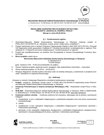 REGULAMIN UCZESTNICTWA W ŚCIEŻCE DOTACYJNEJ PROJEKTU „EDUKACJA, ROZWÓJ, PRACA” Wersja 2 z dnia 29.05.2014r. § 1 - Postanowienia ogólne 1. 2. 3. 4. 5. 6. 7. Warmińsko-Mazurski Zakład Doskonalenia Zawodowego w Olsztynie realizuje projekt nr POKL.08.01.02-28-004/14, pt. „Edukacja, rozwój, praca” (dalej zwany „projektem”). Projekt realizowany jest w ramach Programu Operacyjnego Kapitał Ludzki 2007-2013 (PO KL), Priorytet VIII Regionalne kadry gospodarki, Działanie 8.1 Rozwój pracowników i przedsiębiorstw w regionie, Poddziałanie 8.1.2 Wsparcie procesów adaptacyjnych i modernizacyjnych w regionie. Projekt jest współfinansowany ze środków Unii Europejskiej w ramach Europejskiego Funduszu Społecznego. Biuro projektu mieści się w: Warmińsko-Mazurskim Zakładzie Doskonalenia Zawodowego w Olsztynie ul. Mickiewicza 5 10-548 Olsztyn godz. otwarcia: 9.00 - 15.00 (od poniedziałku do piątku). Obszar realizacji projektu obejmuje swoim zasięgiem całe województwo warmińsko – mazurskie. Okres realizacji projektu: 01.04.2014 – 30.09.2015. Niniejszy Regulamin określa kryteria rekrutacji osób na ścieżkę dotacyjną, uczestnictwa w projekcie tych osób i udzielania im wsparcia finansowego. § 2 - Definicje Używane w ramach niniejszego Regulaminu określenia każdorazowo oznaczają: 1. Projekt - projekt pt. „Edukacja, rozwój, praca” nr POKL.08.01.02-28-004/14 realizowany przez Warmińsko-Mazurski Zakład Doskonalenia Zawodowego w Olsztynie; 2. Instytucja Pośrednicząca II stopnia (Instytucja Wdrażająca, IP2) - Wojewódzki Urząd Pracy w Olsztynie; 3. W-M ZDZ - Warmińsko-Mazurski Zakład Doskonalenia Zawodowego w Olsztynie, KRS nr 0000016448, ul. Mickiewicza 5, 10-548 Olsztyn, tel. 89 527 67 40, fax. 89 535 39 84, www.edu.wmzdz.pl; 4. Instytucja sektora oświaty - instytucja publiczna lub prywatna, zaliczająca się do jednej z poniższych kategorii: a. przedszkola, w tym z oddziałami integracyjnymi, przedszkola specjalne oraz inne formy wychowania przedszkolnego; b. szkoły: podstawowe, w tym: specjalne, integracyjne, z oddziałami integracyjnymi i sportowymi, sportowe i mistrzostwa sportowego, gimnazja, w tym: specjalne, integracyjne, dwujęzyczne, z oddziałami integracyjnymi, dwujęzycznymi, sportowymi i przysposabiającymi do pracy, sportowe i mistrzostwa sportowego, 2 ponadgimnazjalne, w tym: specjalne, integracyjne, dwujęzyczne, z oddziałami integracyjnymi, dwujęzycznymi i sportowymi, sportowe, mistrzostwa sportowego, rolnicze i leśne, 5. artystyczne; c. placówki oświatowo-wychowawcze, w tym szkolne schroniska młodzieżowe, umożliwiające rozwijanie zainteresowań i uzdolnień oraz korzystanie z różnych form wypoczynku i organizacji czasu wolnego; d. placówki kształcenia ustawicznego, placówki kształcenia praktycznego oraz ośrodki dokształcania i doskonalenia zawodowego, umożliwiające uzyskanie i uzupełnienie wiedzy, umiejętności i kwalifikacji zawodowych, w tym dla osób dorosłych; e. placówki artystyczne – ogniska artystyczne umożliwiające rozwijanie zainteresowań i uzdolnień artystycznych; f. poradnie psychologiczno-pedagogiczne, w tym poradnie specjalistyczne udzielające dzieciom, młodzieży, rodzicom i nauczycielom pomocy psychologiczno-pedagogicznej, a także pomocy uczniom w wyborze kierunku kształcenia i zawodu; g. młodzieżowe ośrodki wychowawcze, młodzieżowe ośrodki socjoterapii, specjalne ośrodki szkolnowychowawcze oraz specjalne ośrodki wychowawcze dla dzieci i młodzieży wymagających stosowania specjalnej organizacji nauki, metod pracy i wychowania, a także ośrodki umożliwiające dzieciom i młodzieży, udział w zajęciach rewalidacyjno-wychowawczych, organizowanych zgodnie z odrębnymi przepisami - art. 16 ust. 7 ustawy z dnia 7 września 1991 r. o systemie oświaty (Dz. U. z 2004 r. Nr 256, poz. 2572), a także dzieciom i młodzieży z upośledzeniem umysłowym z niepełnosprawnościami sprzężonymi realizację odpowiednio obowiązku, o którym mowa w art. 14 ust. 3 ww. ustawy, obowiązku szkolnego i obowiązku nauki; h. placówki zapewniające opiekę i wychowanie uczniom w okresie pobierania nauki poza miejscem stałego zamieszkania; i. zakłady kształcenia i placówki doskonalenia nauczycieli; j. biblioteki pedagogiczne; k. kolegia pracowników służb społecznych. Kandydat - osoba pełnoletnia, nauczyciel lub pracownik instytucji sektora oświaty, zameldowana na pobyt stały lub tymczasowy na obszarze realizacji Projektu tj. województwa warmińsko - mazurskiego, starająca się o udział w Projekcie, która zamierza rozpocząć działalność gospodarczą na terenie województwa warmińsko – mazurskiego i złożyła dokumenty rekrutacyjne oraz zalicza się do jednej z poniższych kategorii: 1) osoba pozostająca bez zatrudnienia, która po 31.12.2012 r. utraciła pracę w instytucjach sektora oświaty, wyłącznie z przyczyn dotyczących zakładu pracy; 2) osoba przewidziana do zwolnienia z sektora oświaty z przyczyn niedotyczących pracownika – tj. znajdująca się w okresie wypowiedzenia; 3) osoba zagrożona zwolnieniem z pracy: za osobę zagrożoną zwolnieniem z pracy uznaje się pracownika, którego pracodawca (zatrudniający więcej niż 20 osób) w ciągu ostatnich 12 miesięcy przed jego przystąpieniem do Projektu, dokonał zwolnień na podstawie ustawy z dnia 13 marca 2003 r. o szczególnych zasadach rozwiązywania z pracownikami stosunków pracy z przyczyn nie dotyczących pracowników (Dz. U. 2003 nr 90 poz.844 z późn. zm.). Natomiast w przypadku pracodawców zatrudniających mniej niż 20 osób, pracodawca dokonał zwolnień 1 1 8 na podstawie art. 41 § 1, art. 177 § 4 i 5, art. 186 , art. 186 Kodeksu Pracy lub art. 196 ust. 2 Kodeksu Pracy, za osobę zagrożoną zwolnieniem z pracy uznaje się też pracownika zatrudnionego w sektorze oświaty na czas określony/na zastępstwo, za osobę zagrożoną zwolnieniem z pracy uznaje się także nauczycieli pozostaj