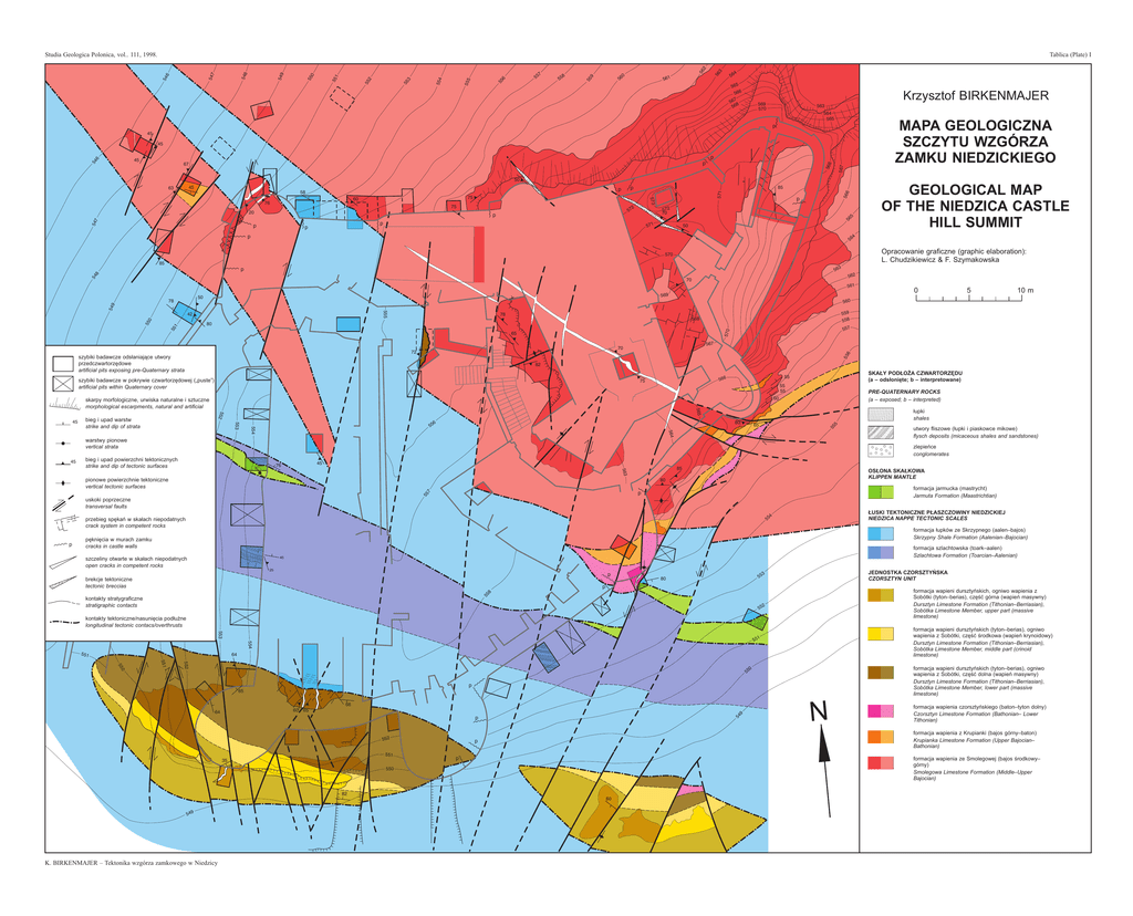 0 56 56 3 56 2 8 55 55 9 7 55 55 6 555 55 3 55 2 55 1 55 0 549 547 54 6 554 Tablica (Plate) I 548 Studia Geologica Polonica, vol.. 111, 1998. 561 4 56 565 566 7 56 8 56 Krzysztof BIRKENMAJER 569 570 563 564 565 MAPA GEOLOGICZNA SZCZYTU WZGÓRZA ZAMKU NIEDZICKIEGO p 45 45 p p 567 67 568 54 6 45 50 75 547 20 2 57 p p p 572 70 p p 566 573 75 60 76 85 p p 58 571 45 63 5 56 571 50 4 56 p Opracowanie graficzne (graphic elaboration): L. Chudzikiewicz & F. Szymakowska 570 85 3 56 54 8 p 562 70 561 569 50 555 78 567 70 55 6 szybiki badawcze ods³aniaj¹ce utwory przedczwartorzêdowe artificial pits exposing pre-Quaternary strata 82 szybiki badawcze w pokrywie czwartorzêdowej („puste”) artificial pits within Quaternary cover SKA£Y POD£O¯A CZWARTORZÊDU (a – ods³oniête; b – interpretowane) 55 566 75 55 55 PRE-QUATERNARY ROCKS (a – exposed; b – interpreted) 60 80 6 55 65 564 554 553 bieg i upad warstw strike and dip of strata ³upki shales 55 5 552 565 skarpy morfologiczne, urwiska naturalne i sztuczne morphological escarpments, natural and artificial warstwy pionowe vertical strata utwory fliszowe (³upki i piaskowce mikowe) flysch deposits (micaceous shales and sandstones) zlepieñce conglomerates bieg i upad powierzchni tektonicznych strike and dip of tectonic surfaces 45 76 563 85 pionowe powierzchnie tektoniczne vertical tectonic surfaces OS£ONA SKA£KOWA KLIPPEN MANTLE 80 formacja jarmucka (mastrycht) Jarmuta Formation (Maastrichtian) 55 7 p uskoki poprzeczne transversal faults £USKI TEKTONICZNE P£ASZCZOWINY NIEDZICKIEJ NIEDZICA NAPPE TECTONIC SCALES 4 55 przebieg spêkañ w ska³ach niepodatnych crack system in competent rocks p 10 m 557 570 65 72 45 5 559 558 568 80 55 1 55 0 42 45 0 560 549 78 GEOLOGICAL MAP OF THE NIEDZICA CASTLE HILL SUMMIT formacja ³upków ze Skrzypnego (aalen–bajos) Skrzypny Shale Formation (Aalenian–Bajocian) pêkniêcia w murach zamku cracks in castle walls formacja szlachtowska (toark–aalen) Szlachtowa Formation (Toarcian–Aalenian) 45 szczeliny otwarte w ska³ach niepodatnych open cracks in competent rocks 25 p brekcje tektoniczne tectonic breccias JEDNOSTKA CZORSZTYÑSKA CZORSZTYN UNIT 3 55 80 p formacja wapieni dursztyñskich, ogniwo wapienia z Sobótki (tyton–berias), czêœæ górna (wapieñ masywny) Dursztyn Limestone Formation (Tithonian–Berriasian), Sobótka Limestone Member, upper part (massive limestone) 55 8 kontakty stratygraficzne stratigraphic contacts 2 55 kontakty tektoniczne/nasuniêcia pod³u¿ne longitudinal tectonic contacs/overthrusts 553 554 551 formacja wapieni dursztyñskich (tyton–berias), ogniwo wapienia z Sobótki, czêœæ œrodkowa (wapieñ krynoidowy) Dursztyn Limestone Formation (Tithonian–Berriasian), Sobótka Limestone Member, middle part (crinoid limestone) 551 64 552 551 0 55 formacja wapieni dursztyñskich (tyton–berias), ogniwo wapienia z Sobótki, czêœæ dolna (wapieñ masywny) Dursztyn Limestone Formation (Tithonian–Berriasian), Sobótka Limestone Member, lower part (massive limestone) 0 55 p 65 66 65 54 9 60 64 p 552 551 35 formacja wapienia z Krupianki (bajos górny–baton) Krupianka Limestone Formation (Upper Bajocian– Bathonian) p p formacja wapienia ze Smolegowej (bajos œrodkowy– górny) Smolegowa Limestone Formation (Middle–Upper Bajocian) 550 82 60 549 K. BIRKENMAJER – Tektonika wzgórza zamkowego w Niedzicy N formacja wapienia czorsztyñskiego (baton–tyton dolny) Czorsztyn Limestone Formation (Bathonian– Lower Tithonian)