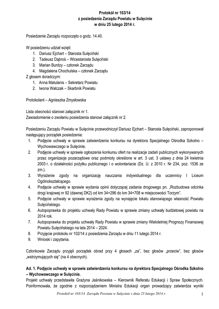 1 Protokół nr 103/14 z posiedzenia Zarządu Powiatu w Sulęcinie w