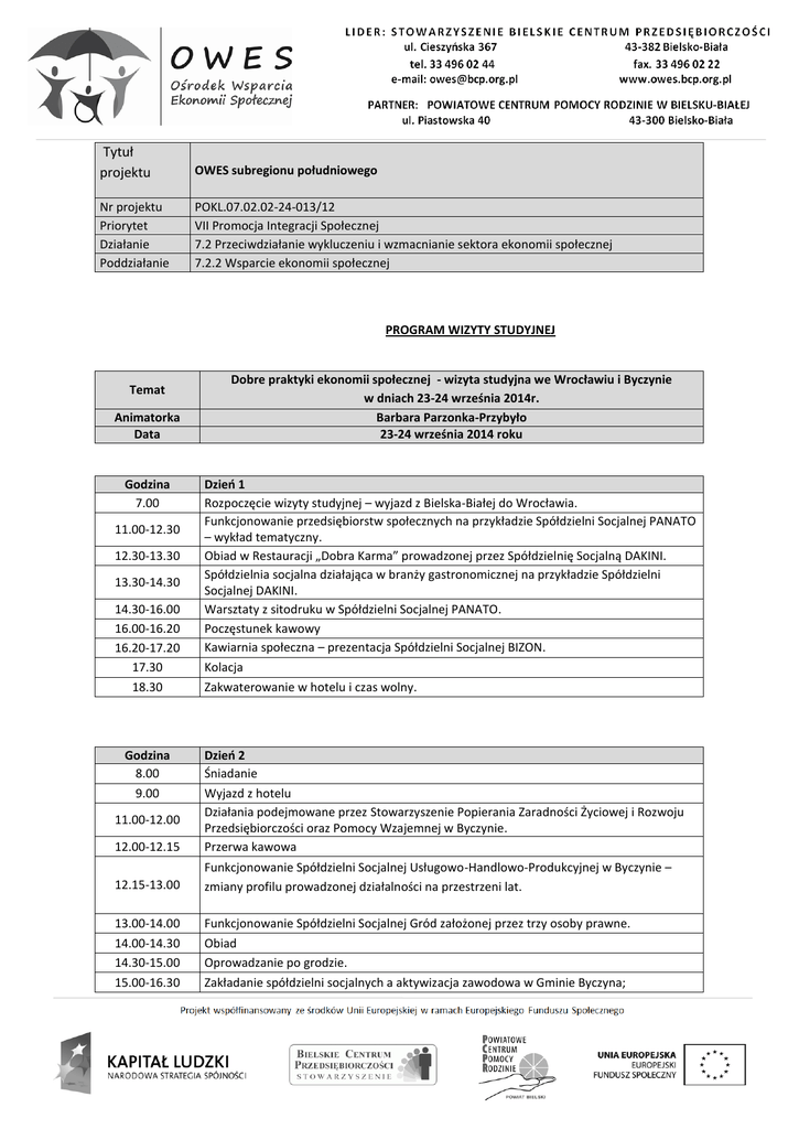 Tytuł projektu OWES subregionu południowego Nr projektu Priorytet Działanie Poddziałanie POKL.07.02.02-24-013/12 VII Promocja Integracji Społecznej 7.2 Przeciwdziałanie wykluczeniu i wzmacnianie sektora ekonomii społecznej 7.2.2 Wsparcie ekonomii społecznej PROGRAM WIZYTY STUDYJNEJ Temat Animatorka Data Godzina 7.00 11.00-12.30 12.30-13.30 13.30-14.30 14.30-16.00 16.00-16.20 16.20-17.20 17.30 18.30 Godzina 8.00 9.00 Dobre praktyki ekonomii społecznej - wizyta studyjna we Wrocławiu i Byczynie w dniach 23-24 września 2014r. Barbara Parzonka-Przybyło 23-24 września 2014 roku Dzień 1 Rozpoczęcie wizyty studyjnej – wyjazd z Bielska-Białej do Wrocławia. Funkcjonowanie przedsiębiorstw społecznych na przykładzie Spółdzielni Socjalnej PANATO – wykład tematyczny. Obiad w Restauracji „Dobra Karma” prowadzonej przez Spółdzielnię Socjalną DAKINI. Spółdzielnia socjalna działająca w branży gastronomicznej na przykładzie Spółdzielni Socjalnej DAKINI. Warsztaty z sitodruku w Spółdzielni Socjalnej PANATO. Poczęstunek kawowy Kawiarnia społeczna – prezentacja Spółdzielni Socjalnej BIZON. Kolacja Zakwaterowanie w hotelu i czas wolny. 12.00-12.15 Dzień 2 Śniadanie Wyjazd z hotelu Działania podejmowane przez Stowarzyszenie Popierania Zaradności Życiowej i Rozwoju Przedsiębiorczości oraz Pomocy Wzajemnej w Byczynie. Przerwa kawowa 12.15-13.00 Funkcjonowanie Spółdzielni Socjalnej Usługowo-Handlowo-Produkcyjnej w Byczynie – zmiany profilu prowadzonej działalności na przestrzeni lat. 13.00-14.00 14.00-14.30 14.30-15.00 15.00-16.30 Funkcjonowanie Spółdzielni Socjalnej Gród założonej przez trzy osoby prawne. Obiad Oprowadzanie po grodzie. Zakładanie spółdzielni socjalnych a aktywizacja zawodowa w Gminie Byczyna; 11.00-12.00 16.30 wizyty w następujących podmiotach: Spółdzielnia Socjalna Picasso, Spółdzielnia Socjalna PERUNICA oraz Stowarzyszenie Animacji Lokalnej ARKONA. Podsumowanie wizyty, zakończenie.